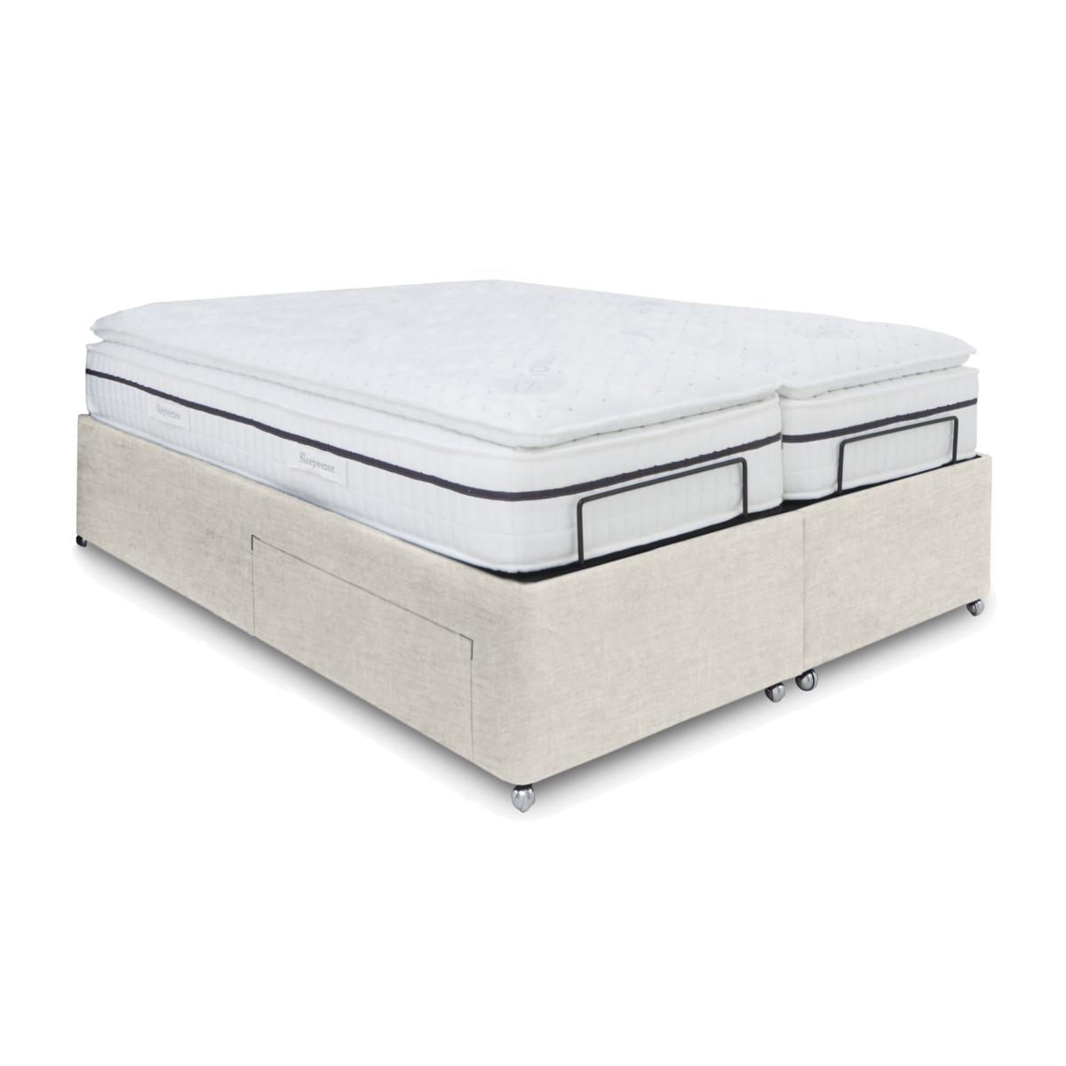 The next generation of adjustable beds is here. The adjustable bed frames and divan bases in our E-Motion collection do far more than you might expect. Opt for one with built-in massage functionality for even more relaxation. Dual-adjustable bases mean that both sides of the bed can be operated independently to suit each partner’s comfort needs. And thanks to smooth electric-powered mechanisms and wireless remote controls, finding the perfect position is smooth and simple. The E-Motion collection includes a wide range of stylish upholstered bed frames, divan bases complete with headboards and mattresses. Made in the UK and only at Furniture Village. This dual-adjustable divan base is perfect for couples who want an adjustable bed but can’t agree on how it’s adjusted. Each side of the bed can be operated independently. Why you'll love it Find perfect comfort for better sleep with this dual-adjustable divan base. Dual base is electric powered for smooth and efficient movement. With 2 separate bed bases, you and your partner have individual control. A simple wireless handset makes this bed so easy to adjust. Use the handy memory function to quickly return to your favourite comfort position. There’s even a weightless-feel pre-set position for TV watching. This divan base promotes restorative sleep by minimising discomfort that might wake you up. Adjustable beds can also reduce back ache, improve blood circulation and reduce snoring. It’s ideal if you need a little help getting in and out of bed. An ethical choice – this divan base is made with FSC-sourced wood. With optional storage drawers in a range of configurations. In a wide selection of fashionable upholstery fabric options. Designed and handcrafted just for Furniture Village. Made in the UK. Also available with ultra-relaxing massage feature. And with a choice of stylish, luxuriously cushioned headboards. This dual-adjustable divan base is part of our E-Motion range. What you need to know Mattress sold separately. To ensure bed base and mattress compatibility, consider a mattress from the E-Motion range. Please check the suitability of any mattress you are considering for this adjustable base. Available in king and super king sizes. Do not sit on this adjustable bed with the foot end in a raised position. Clean regularly using a soft brush or vacuum with the curtain attachment. Deal with any spills promptly. Professional cleaning advised for oil- and grease-based stains. Some fabrics can show wear on areas of more use or in direct sunlight. Shop our E-Motion range for a huge choice of bed frames, divan bases, massage beds, mattresses and more.