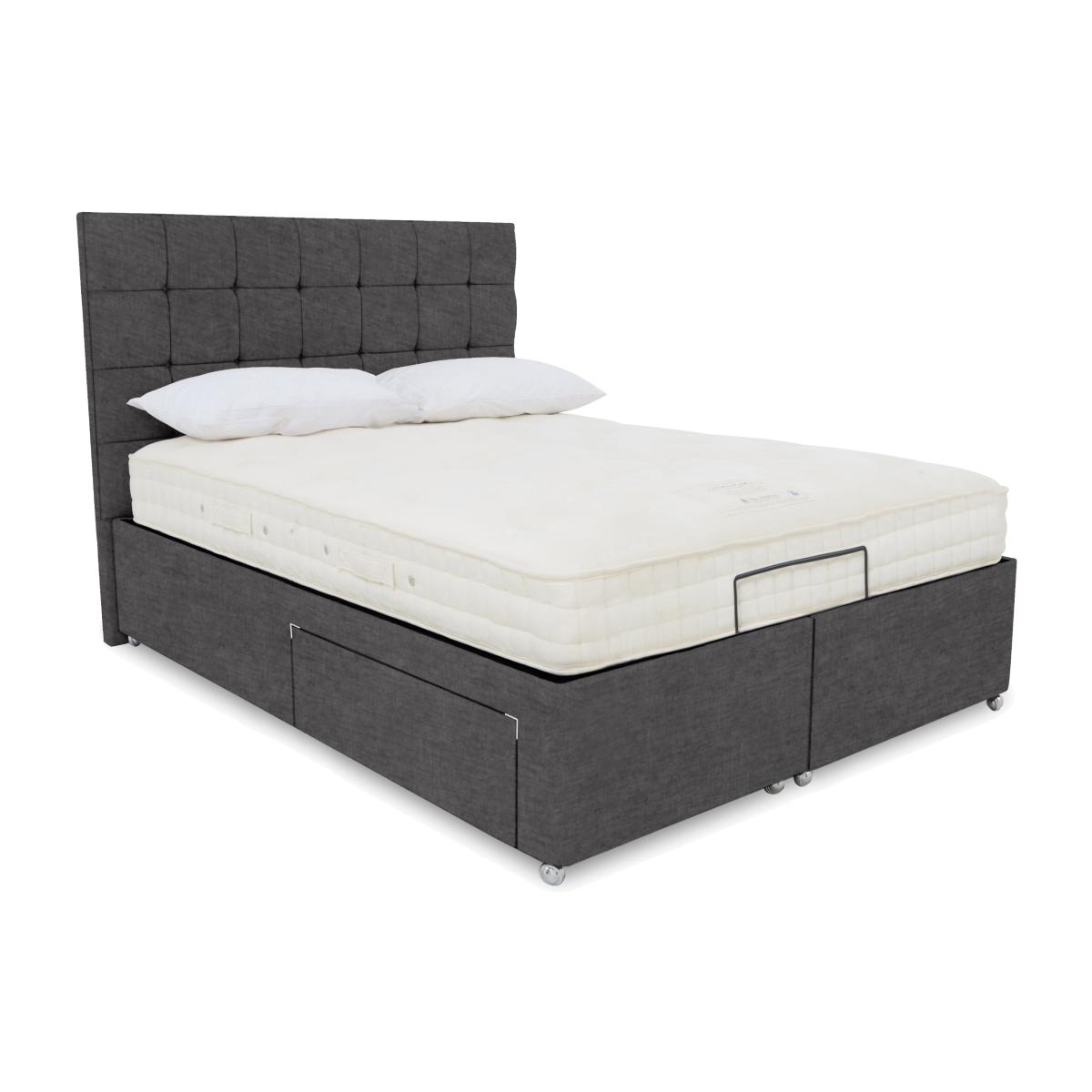 The divan bases in our Kaito range make a strong first impression. Each comes complete with a luxurious buttoned headboard that’ll give your bedroom a bold modern look. And because these bed bases are adjustable, that first impression is matched by long-lasting comfort. Electric-powered and with multi-position adjustability, Kaito divan bases make it easier to get truly comfortable whether you’re sleeping or sitting up in bed to read. Bed bases are available with a variety of storage options and massage functionality, and the range also includes dual adjustable bases. Designed and handcrafted exclusively for Furniture Village, the Kaito range is part of our E-Motion adjustable bed collection. This electric-powered adjustable divan base makes it quicker and easier to get comfy – and in style. Includes the lavishly buttoned Kaito headboard. Only at Furniture Village. Why you'll love it Find perfect comfort for better sleep with this adjustable divan base. This divan base comes with our luxuriously cushioned and buttoned Kaito headboard. A simple wireless handset makes this bed so easy to adjust. Use the handy memory function to quickly return to your favourite comfort position. There’s even a weightless-feel pre-set position for TV watching. This divan base promotes restorative sleep by minimising discomfort that might wake you up. Adjustable beds can also reduce back ache, improve blood circulation and reduce snoring. It’s ideal if you need a little help getting in and out of bed. An ethical choice – this divan base is made with FSC-sourced wood. With optional storage drawers in a range of configurations. In a wide selection of fashionable upholstery fabric options. Designed and handcrafted just for Furniture Village. Made in the UK. Also available with 2-person adjustability and massage function. This adjustable divan base is part of our E-Motion range. What you need to know Mattress sold separately. To ensure bed base and mattress compatibility, consider a mattress from the E-Motion range. Please check the suitability of any mattress you are considering for this adjustable base. Available in single and king sizes. Do not sit on this adjustable bed with the foot end in a raised position. Clean regularly using a soft brush or vacuum with the curtain attachment. Deal with any spills promptly. Professional cleaning advised for oil- and grease-based stains. Some fabrics can show wear on areas of more use or in direct sunlight. Shop our E-Motion range for a huge choice of bed frames, divan bases, massage beds, mattresses and more.