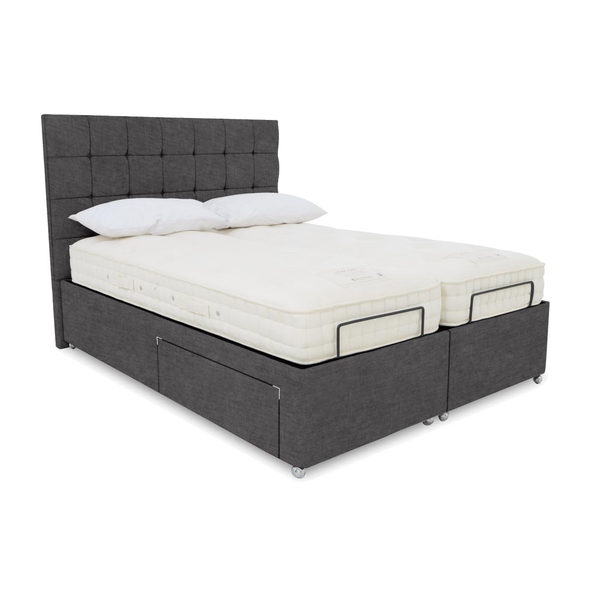 The divan bases in our Kaito range make a strong first impression. Each comes complete with a luxurious buttoned headboard that’ll give your bedroom a bold modern look. And because these bed bases are adjustable, that first impression is matched by long-lasting comfort. Electric-powered and with multi-position adjustability, Kaito divan bases make it easier to get truly comfortable whether you’re sleeping or sitting up in bed to read. Bed bases are available with a variety of storage options and massage functionality, and the range also includes dual adjustable bases. Designed and handcrafted exclusively for Furniture Village, the Kaito range is part of our E-Motion adjustable bed collection. This fabulous adjustable divan base comes with two separate bed bases and two wireless controls so both of you can get perfectly comfortable. The luxe buttoned headboard is included. Why you'll love it Find perfect comfort for better sleep with this dual-adjustable divan base. This divan base comes with our luxuriously cushioned and buttoned Kaito headboard. Dual base is electric powered for smooth and efficient movement. With 2 separate bed bases, you and your partner have individual control. A simple wireless handset makes this bed so easy to adjust. Use the handy memory function to quickly return to your favourite comfort position. There’s even a weightless-feel pre-set position for TV watching. This divan base promotes restorative sleep by minimising discomfort that might wake you up. Adjustable beds can also reduce back ache, improve blood circulation and reduce snoring. It’s ideal if you need a little help getting in and out of bed. An ethical choice – this divan base is made with FSC-sourced wood. With optional storage drawers in a range of configurations. In a wide selection of fashionable upholstery fabric options. Designed and handcrafted just for Furniture Village. Made in the UK. Also available with ultra-relaxing massage feature. This dual-adjustable divan base is part of our E-Motion range. What you need to know Mattress sold separately. To ensure bed base and mattress compatibility, consider a mattress from the E-Motion range. Please check the suitability of any mattress you are considering for this adjustable base. Available in king and super king sizes. Do not sit on this adjustable bed with the foot end in a raised position. Clean regularly using a soft brush or vacuum with the curtain attachment. Deal with any spills promptly. Professional cleaning advised for oil- and grease-based stains. Some fabrics can show wear on areas of more use or in direct sunlight. Shop our E-Motion range for a huge choice of bed frames, divan bases, massage beds, mattresses and more.