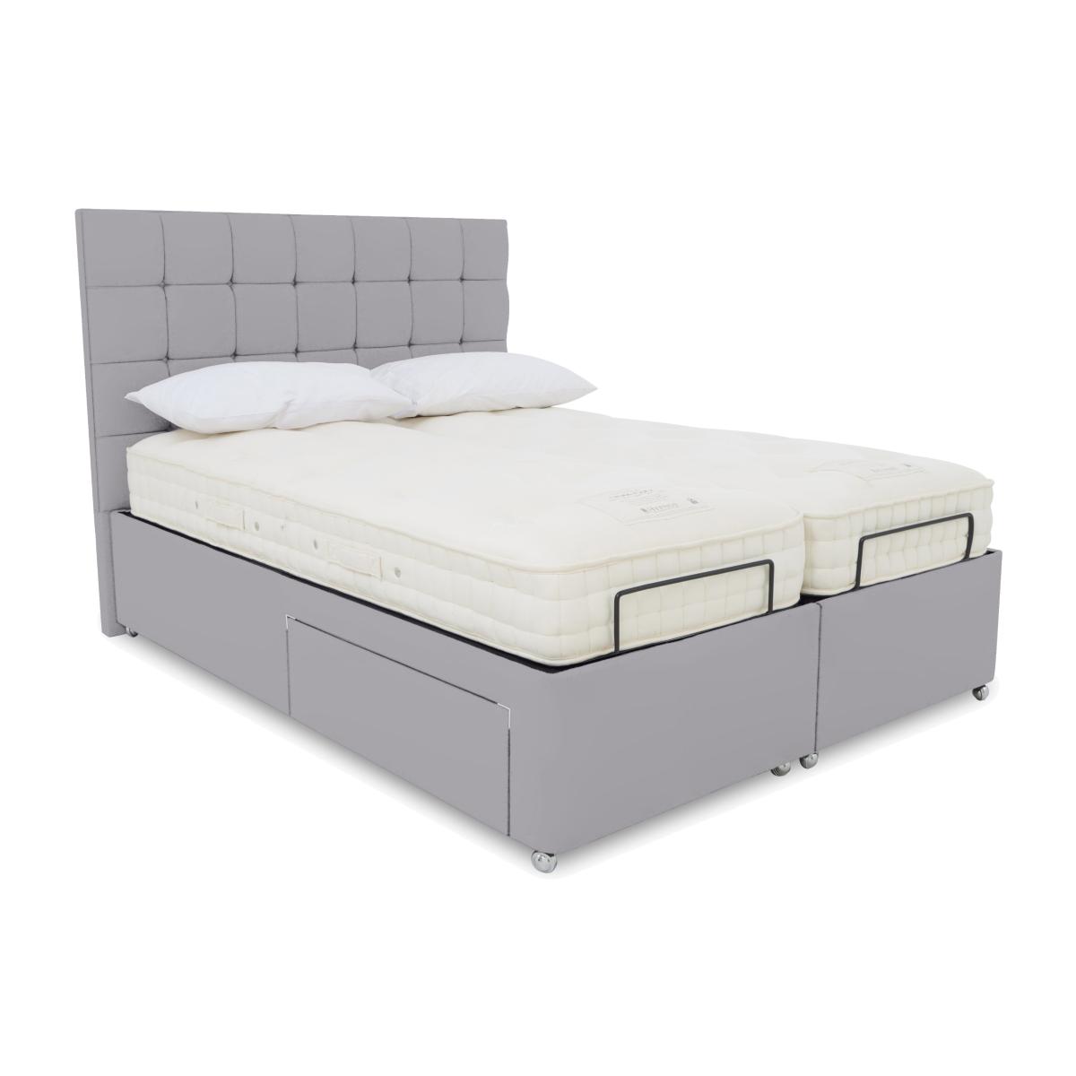 The divan bases in our Kaito range make a strong first impression. Each comes complete with a luxurious buttoned headboard that’ll give your bedroom a bold modern look. And because these bed bases are adjustable, that first impression is matched by long-lasting comfort. Electric-powered and with multi-position adjustability, Kaito divan bases make it easier to get truly comfortable whether you’re sleeping or sitting up in bed to read. Bed bases are available with a variety of storage options and massage functionality, and the range also includes dual adjustable bases. Designed and handcrafted exclusively for Furniture Village, the Kaito range is part of our E-Motion adjustable bed collection. This fabulous adjustable divan base comes with two separate bed bases and two wireless controls so both of you can get perfectly comfortable. The luxe buttoned headboard is included. Why you'll love it Find perfect comfort for better sleep with this dual-adjustable divan base. This divan base comes with our luxuriously cushioned and buttoned Kaito headboard. Dual base is electric powered for smooth and efficient movement. With 2 separate bed bases, you and your partner have individual control. A simple wireless handset makes this bed so easy to adjust. Use the handy memory function to quickly return to your favourite comfort position. There’s even a weightless-feel pre-set position for TV watching. This divan base promotes restorative sleep by minimising discomfort that might wake you up. Adjustable beds can also reduce back ache, improve blood circulation and reduce snoring. It’s ideal if you need a little help getting in and out of bed. An ethical choice – this divan base is made with FSC-sourced wood. With optional storage drawers in a range of configurations. In a wide selection of fashionable upholstery fabric options. Designed and handcrafted just for Furniture Village. Made in the UK. Also available with ultra-relaxing massage feature. This dual-adjustable divan base is part of our E-Motion range. What you need to know Mattress sold separately. To ensure bed base and mattress compatibility, consider a mattress from the E-Motion range. Please check the suitability of any mattress you are considering for this adjustable base. Available in king and super king sizes. Do not sit on this adjustable bed with the foot end in a raised position. Clean regularly using a soft brush or vacuum with the curtain attachment. Deal with any spills promptly. Professional cleaning advised for oil- and grease-based stains. Some fabrics can show wear on areas of more use or in direct sunlight. Shop our E-Motion range for a huge choice of bed frames, divan bases, massage beds, mattresses and more.