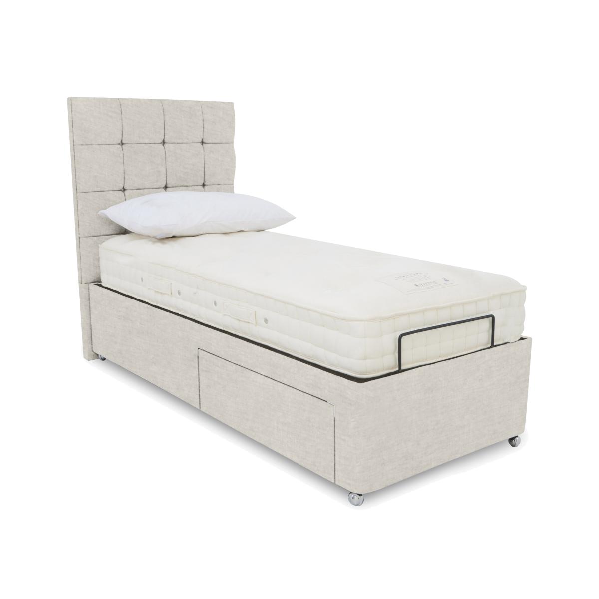The divan bases in our Kaito range make a strong first impression. Each comes complete with a luxurious buttoned headboard that’ll give your bedroom a bold modern look. And because these bed bases are adjustable, that first impression is matched by long-lasting comfort. Electric-powered and with multi-position adjustability, Kaito divan bases make it easier to get truly comfortable whether you’re sleeping or sitting up in bed to read. Bed bases are available with a variety of storage options and massage functionality, and the range also includes dual adjustable bases. Designed and handcrafted exclusively for Furniture Village, the Kaito range is part of our E-Motion adjustable bed collection. Everyone will be happy with this stylish adjustable divan base. Each side can be operated independently and it also comes with massage feature and our beautiful buttoned Kaito headboard. Why you'll love it Find perfect comfort for better sleep with this dual-adjustable divan base with massage function. This divan base comes with our luxuriously cushioned and buttoned Kaito headboard. Multi-setting massage function provides soothing relief for aching joints. Dual base is electric powered for smooth and efficient movement. With 2 separate bed bases, you and your partner have individual control. A simple wireless handset makes this bed so easy to adjust. Use the handy memory function to quickly return to your favourite comfort position. There’s even a weightless-feel pre-set position for TV watching. This divan base promotes restorative sleep by minimising discomfort that might wake you up. Adjustable beds can also reduce back ache, improve blood circulation and reduce snoring. It’s ideal if you need a little help getting in and out of bed. An ethical choice – this divan base is made with FSC-sourced wood. With optional storage drawers in a range of configurations. In a wide selection of fashionable upholstery fabric options. Designed and handcrafted just for Furniture Village. Made in the UK. This dual-adjustable massage divan base is part of our E-Motion range. What you need to know Mattress sold separately. To ensure bed base and mattress compatibility, consider a mattress from the E-Motion range. Please check the suitability of any mattress you are considering for this adjustable base. In king and super king sizes with dual control. Also available in single size. Do not sit on this adjustable bed with the foot end in a raised position. Clean regularly using a soft brush or vacuum with the curtain attachment. Deal with any spills promptly. Professional cleaning advised for oil- and grease-based stains. Some fabrics can show wear on areas of more use or in direct sunlight. Shop our E-Motion range for a huge choice of bed frames, divan bases, massage beds, mattresses and more.