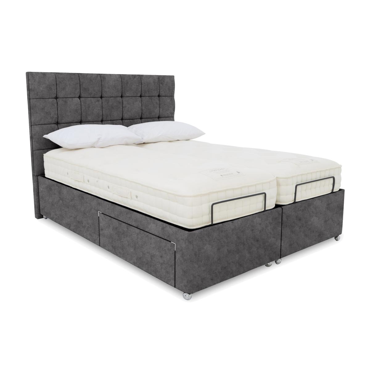 The divan bases in our Kaito range make a strong first impression. Each comes complete with a luxurious buttoned headboard that’ll give your bedroom a bold modern look. And because these bed bases are adjustable, that first impression is matched by long-lasting comfort. Electric-powered and with multi-position adjustability, Kaito divan bases make it easier to get truly comfortable whether you’re sleeping or sitting up in bed to read. Bed bases are available with a variety of storage options and massage functionality, and the range also includes dual adjustable bases. Designed and handcrafted exclusively for Furniture Village, the Kaito range is part of our E-Motion adjustable bed collection. Everyone will be happy with this stylish adjustable divan base. Each side can be operated independently and it also comes with massage feature and our beautiful buttoned Kaito headboard. Why you'll love it Find perfect comfort for better sleep with this dual-adjustable divan base with massage function. This divan base comes with our luxuriously cushioned and buttoned Kaito headboard. Multi-setting massage function provides soothing relief for aching joints. Dual base is electric powered for smooth and efficient movement. With 2 separate bed bases, you and your partner have individual control. A simple wireless handset makes this bed so easy to adjust. Use the handy memory function to quickly return to your favourite comfort position. There’s even a weightless-feel pre-set position for TV watching. This divan base promotes restorative sleep by minimising discomfort that might wake you up. Adjustable beds can also reduce back ache, improve blood circulation and reduce snoring. It’s ideal if you need a little help getting in and out of bed. An ethical choice – this divan base is made with FSC-sourced wood. With optional storage drawers in a range of configurations. In a wide selection of fashionable upholstery fabric options. Designed and handcrafted just for Furniture Village. Made in the UK. This dual-adjustable massage divan base is part of our E-Motion range. What you need to know Mattress sold separately. To ensure bed base and mattress compatibility, consider a mattress from the E-Motion range. Please check the suitability of any mattress you are considering for this adjustable base. In king and super king sizes with dual control. Also available in single size. Do not sit on this adjustable bed with the foot end in a raised position. Clean regularly using a soft brush or vacuum with the curtain attachment. Deal with any spills promptly. Professional cleaning advised for oil- and grease-based stains. Some fabrics can show wear on areas of more use or in direct sunlight. Shop our E-Motion range for a huge choice of bed frames, divan bases, massage beds, mattresses and more.
