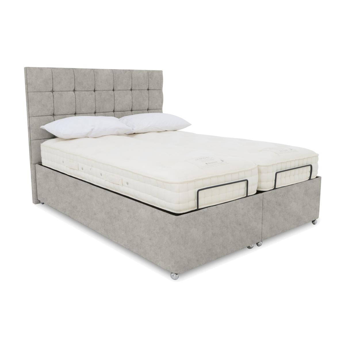 The divan bases in our Kaito range make a strong first impression. Each comes complete with a luxurious buttoned headboard that’ll give your bedroom a bold modern look. And because these bed bases are adjustable, that first impression is matched by long-lasting comfort. Electric-powered and with multi-position adjustability, Kaito divan bases make it easier to get truly comfortable whether you’re sleeping or sitting up in bed to read. Bed bases are available with a variety of storage options and massage functionality, and the range also includes dual adjustable bases. Designed and handcrafted exclusively for Furniture Village, the Kaito range is part of our E-Motion adjustable bed collection. This gorgeous adjustable divan base has two separate bases that are individually controlled. It also has a large underbed storage space and comes with our lovely Kaito buttoned headboard. Why you'll love it Find perfect comfort for better sleep with this dual-adjustable ottoman divan base. This divan base comes with our luxuriously cushioned and buttoned Kaito headboard. And you’ll love the roomy hidden storage compartment. Dual base is electric powered for smooth and efficient movement. With 2 separate bed bases, you and your partner have individual control. A simple wireless handset makes this bed so easy to adjust. Use the handy memory function to quickly return to your favourite comfort position. There’s even a weightless-feel pre-set position for TV watching. This divan base promotes restorative sleep by minimising discomfort that might wake you up. Adjustable beds can also reduce back ache, improve blood circulation and reduce snoring. It’s ideal if you need a little help getting in and out of bed. An ethical choice – this ottoman divan base is made with FSC-sourced wood. In a wide selection of fashionable upholstery fabric options. Designed and handcrafted just for Furniture Village. Made in the UK. Also available with ultra-relaxing massage feature. This dual-adjustable ottoman divan base is part of our E-Motion range. What you need to know Mattress sold separately. To ensure bed base and mattress compatibility, consider a mattress from the E-Motion range. Please check the suitability of any mattress you are considering for this adjustable base. Available in king and super king sizes. This ottoman divan base opens at the end. Maximum mattress weight is 80 kg. Please keep hands clear of the mechanism when opening and closing the ottoman. Do not sit on this adjustable bed with the foot end in a raised position. Clean regularly using a soft brush or vacuum with the curtain attachment. Deal with any spills promptly. Professional cleaning advised for oil- and grease-based stains. Some fabrics can show wear on areas of more use or in direct sunlight. Shop our E-Motion range for a huge choice of bed frames, divan bases, massage beds, mattresses and more.