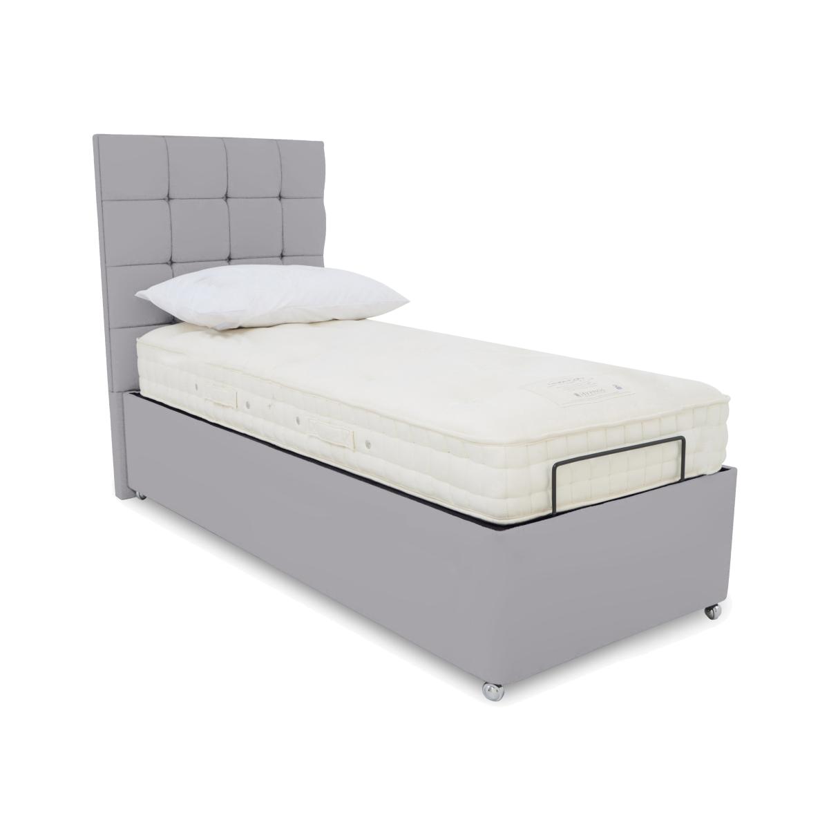 The divan bases in our Kaito range make a strong first impression. Each comes complete with a luxurious buttoned headboard that’ll give your bedroom a bold modern look. And because these bed bases are adjustable, that first impression is matched by long-lasting comfort. Electric-powered and with multi-position adjustability, Kaito divan bases make it easier to get truly comfortable whether you’re sleeping or sitting up in bed to read. Bed bases are available with a variety of storage options and massage functionality, and the range also includes dual adjustable bases. Designed and handcrafted exclusively for Furniture Village, the Kaito range is part of our E-Motion adjustable bed collection. With two-person individual control, massage feature and underbed storage, this adjustable ottoman divan base is a wonder. And it comes with a very stylish buttoned headboard too. Why you'll love it Find perfect comfort for better sleep with this dual-adjustable massage ottoman divan base with massage function. This divan base comes with our luxuriously cushioned and buttoned Kaito headboard. And you’ll love the roomy hidden storage compartment. Multi-setting massage function provides soothing relief for aching joints. Dual base is electric powered for smooth and efficient movement. With 2 separate bed bases, you and your partner have individual control. A simple wireless handset makes this bed so easy to adjust. Use the handy memory function to quickly return to your favourite comfort position. There’s even a weightless-feel pre-set position for TV watching. This divan base promotes restorative sleep by minimising discomfort that might wake you up. Adjustable beds can also reduce back ache, improve blood circulation and reduce snoring. It’s ideal if you need a little help getting in and out of bed. An ethical choice – this ottoman divan base is made with FSC-sourced wood. In a wide selection of fashionable upholstery fabric options. Designed and handcrafted just for Furniture Village. Made in the UK. This dual-adjustable massage ottoman divan base is part of our E-Motion range. What you need to know Mattress sold separately. To ensure bed base and mattress compatibility, consider a mattress from the E-Motion range. Please check the suitability of any mattress you are considering for this adjustable base. In king and super king sizes with dual control. Also available in single size. This ottoman divan base opens at the end. Maximum mattress weight is 40 kg for the single ottoman base and 80 kg for the king and super king ottoman bases. Please keep hands clear of the mechanism when opening and closing the ottoman. Do not sit on this adjustable bed with the foot end in a raised position. Clean regularly using a soft brush or vacuum with the curtain attachment. Deal with any spills promptly. Professional cleaning advised for oil- and grease-based stains. Some fabrics can show wear on areas of more use or in direct sunlight. Shop our E-Motion range for a huge choice of bed frames, divan bases, massage beds, mattresses and more.