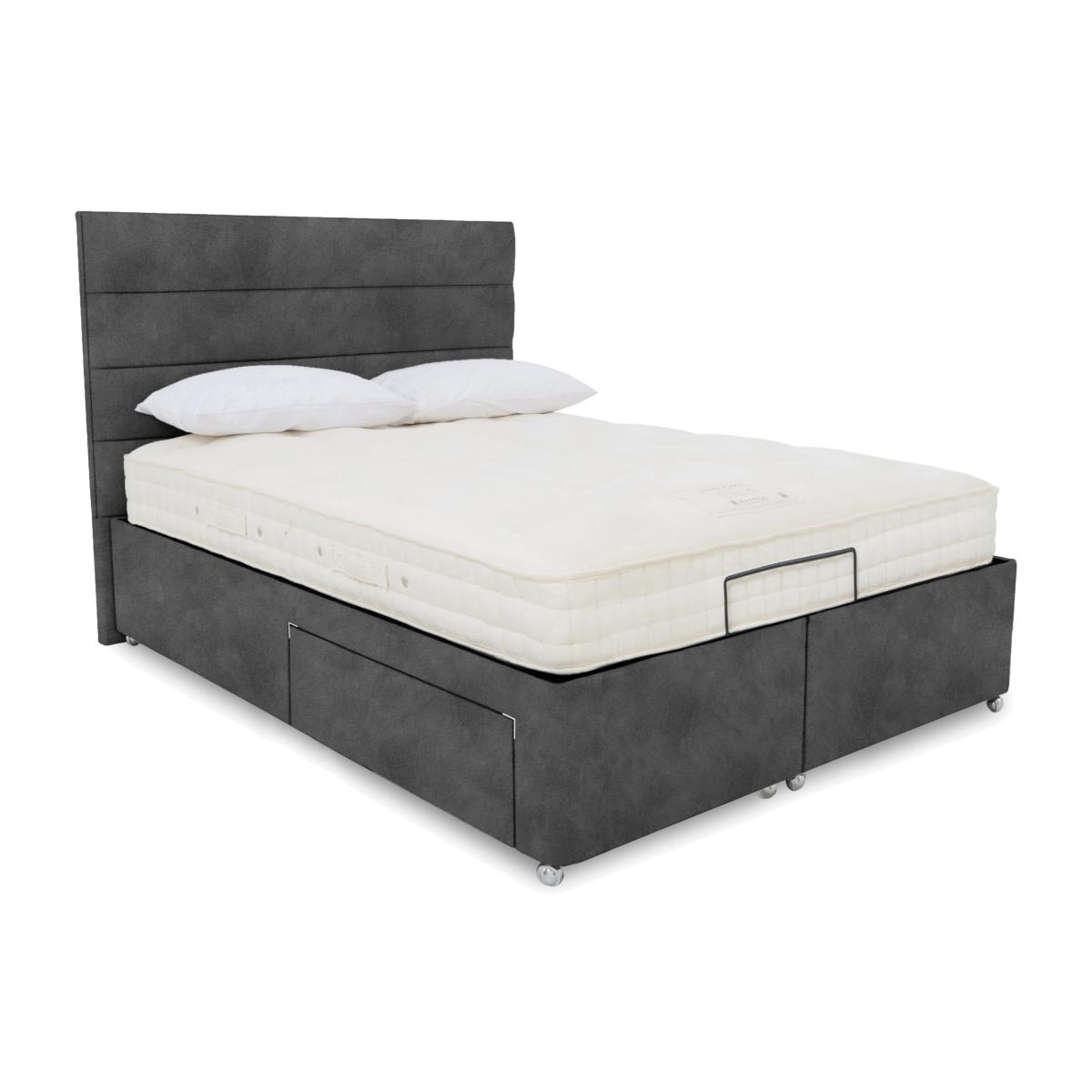 Transform the way you sleep and elevate your bedroom style with an adjustable divan bed base from our Natsu range. Complete with luxuriously cushioned headboards with modern horizontal fluting, the look is simply sumptuous and with multi-position electric-powered adjustability the level of comfort is just as impressive. They’re also perfect for anyone who needs a little extra help getting in and out of bed. As well as dual adjustable bases and optional massage functionality, these divan bases also offer optional storage drawers and large ottoman compartments. Designed and handcrafted exclusively for Furniture Village, the Natsu range is part of our E-Motion adjustable bed collection. In search of a bed that looks beautiful and actually helps you sleep better? Complete with a stylish headboard, this electric adjustable divan base makes it easy to personalise your comfort. Why you'll love it Find perfect comfort for better sleep with this adjustable divan base. Comes complete with our sophisticated Natsu headboard with stylish horizontal stitching. A simple wireless handset makes this bed so easy to adjust. Use the handy memory function to quickly return to your favourite comfort position. There’s even a weightless-feel pre-set position for TV watching. This divan base promotes restorative sleep by minimising discomfort that might wake you up. Adjustable beds can also reduce back ache, improve blood circulation and reduce snoring. It’s ideal if you need a little help getting in and out of bed. An ethical choice – this divan base is made with FSC-sourced wood. With optional storage drawers in a range of configurations. In a wide selection of fashionable upholstery fabric options. Designed and handcrafted just for Furniture Village. Made in the UK. Also available with 2-person adjustability and massage function. This adjustable divan base is part of our E-Motion range. What you need to know Mattress sold separately. To ensure bed base and mattress compatibility, consider a mattress from the E-Motion range. Please check the suitability of any mattress you are considering for this adjustable base. Available in single and king sizes. Do not sit on this adjustable bed with the foot end in a raised position. Clean regularly using a soft brush or vacuum with the curtain attachment. Deal with any spills promptly. Professional cleaning advised for oil- and grease-based stains. Some fabrics can show wear on areas of more use or in direct sunlight. Shop our E-Motion range for a huge choice of bed frames, divan bases, massage beds, mattresses and more.