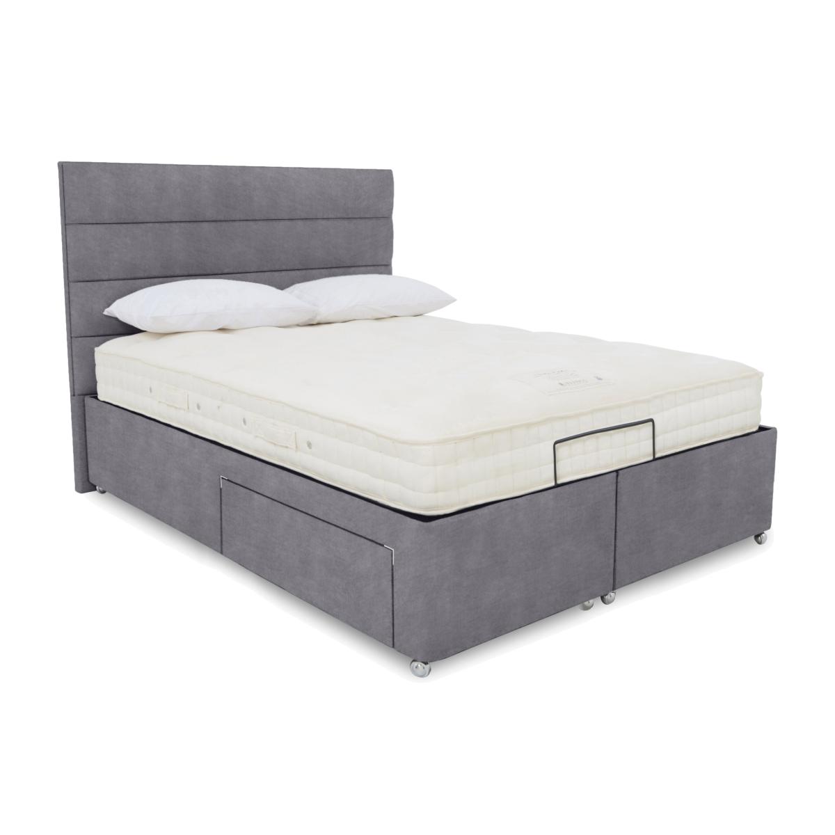 Transform the way you sleep and elevate your bedroom style with an adjustable divan bed base from our Natsu range. Complete with luxuriously cushioned headboards with modern horizontal fluting, the look is simply sumptuous and with multi-position electric-powered adjustability the level of comfort is just as impressive. They’re also perfect for anyone who needs a little extra help getting in and out of bed. As well as dual adjustable bases and optional massage functionality, these divan bases also offer optional storage drawers and large ottoman compartments. Designed and handcrafted exclusively for Furniture Village, the Natsu range is part of our E-Motion adjustable bed collection. In search of a bed that looks beautiful and actually helps you sleep better? Complete with a stylish headboard, this electric adjustable divan base makes it easy to personalise your comfort. Why you'll love it Find perfect comfort for better sleep with this adjustable divan base. Comes complete with our sophisticated Natsu headboard with stylish horizontal stitching. A simple wireless handset makes this bed so easy to adjust. Use the handy memory function to quickly return to your favourite comfort position. There’s even a weightless-feel pre-set position for TV watching. This divan base promotes restorative sleep by minimising discomfort that might wake you up. Adjustable beds can also reduce back ache, improve blood circulation and reduce snoring. It’s ideal if you need a little help getting in and out of bed. An ethical choice – this divan base is made with FSC-sourced wood. With optional storage drawers in a range of configurations. In a wide selection of fashionable upholstery fabric options. Designed and handcrafted just for Furniture Village. Made in the UK. Also available with 2-person adjustability and massage function. This adjustable divan base is part of our E-Motion range. What you need to know Mattress sold separately. To ensure bed base and mattress compatibility, consider a mattress from the E-Motion range. Please check the suitability of any mattress you are considering for this adjustable base. Available in single and king sizes. Do not sit on this adjustable bed with the foot end in a raised position. Clean regularly using a soft brush or vacuum with the curtain attachment. Deal with any spills promptly. Professional cleaning advised for oil- and grease-based stains. Some fabrics can show wear on areas of more use or in direct sunlight. Shop our E-Motion range for a huge choice of bed frames, divan bases, massage beds, mattresses and more.