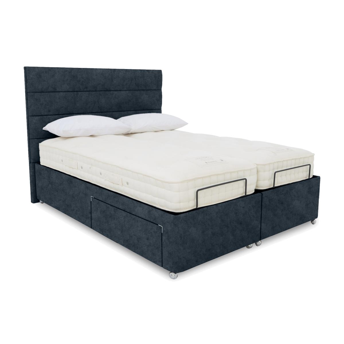 Transform the way you sleep and elevate your bedroom style with an adjustable divan bed base from our Natsu range. Complete with luxuriously cushioned headboards with modern horizontal fluting, the look is simply sumptuous and with multi-position electric-powered adjustability the level of comfort is just as impressive. They’re also perfect for anyone who needs a little extra help getting in and out of bed. As well as dual adjustable bases and optional massage functionality, these divan bases also offer optional storage drawers and large ottoman compartments. Designed and handcrafted exclusively for Furniture Village, the Natsu range is part of our E-Motion adjustable bed collection. Style meets incredible comfort in this adjustable divan base with dual control for individual comfort, massage feature and sophisticated headboard. Only at Furniture Village. Why you'll love it Find perfect comfort for better sleep with this dual-adjustable divan base with massage function. Comes complete with our sophisticated Natsu headboard with stylish horizontal stitching. Multi-setting massage function provides soothing relief for aching joints. Dual base is electric powered for smooth and efficient movement. With 2 separate bed bases, you and your partner have individual control. A simple wireless handset makes this bed so easy to adjust. Use the handy memory function to quickly return to your favourite comfort position. There’s even a weightless-feel pre-set position for TV watching. This divan base promotes restorative sleep by minimising discomfort that might wake you up. Adjustable beds can also reduce back ache, improve blood circulation and reduce snoring. It’s ideal if you need a little help getting in and out of bed. An ethical choice – this divan base is made with FSC-sourced wood. With optional storage drawers in a range of configurations. In a wide selection of fashionable upholstery fabric options. Designed and handcrafted just for Furniture Village. Made in the UK. This dual-adjustable massage divan base is part of our E-Motion range. What you need to know Mattress sold separately. To ensure bed base and mattress compatibility, consider a mattress from the E-Motion range. Please check the suitability of any mattress you are considering for this adjustable base. In king and super king sizes with dual control. Also available in single size. Do not sit on this adjustable bed with the foot end in a raised position. Clean regularly using a soft brush or vacuum with the curtain attachment. Deal with any spills promptly. Professional cleaning advised for oil- and grease-based stains. Some fabrics can show wear on areas of more use or in direct sunlight. Shop our E-Motion range for a huge choice of bed frames, divan bases, massage beds, mattresses and more.