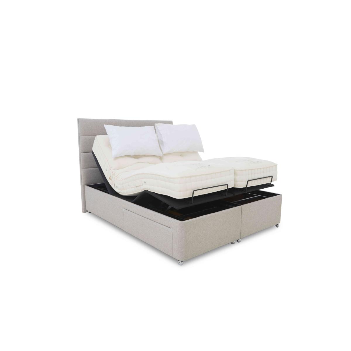 Transform the way you sleep and elevate your bedroom style with an adjustable divan bed base from our Natsu range. Complete with luxuriously cushioned headboards with modern horizontal fluting, the look is simply sumptuous and with multi-position electric-powered adjustability the level of comfort is just as impressive. They’re also perfect for anyone who needs a little extra help getting in and out of bed. As well as dual adjustable bases and optional massage functionality, these divan bases also offer optional storage drawers and large ottoman compartments. Designed and handcrafted exclusively for Furniture Village, the Natsu range is part of our E-Motion adjustable bed collection. Comfort is personal and this adjustable divan base makes it easy to find the perfect sleeping position thanks to its two bed bases and dual control feature. The sophisticated Natsu headboard is included. Why you'll love it Find perfect comfort for better sleep with this dual-adjustable divan base. Comes complete with our sophisticated Natsu headboard with stylish horizontal stitching. Dual base is electric powered for smooth and efficient movement. With 2 separate bed bases, you and your partner have individual control. A simple wireless handset makes this bed so easy to adjust. Use the handy memory function to quickly return to your favourite comfort position. There’s even a weightless-feel pre-set position for TV watching. This divan base promotes restorative sleep by minimising discomfort that might wake you up. Adjustable beds can also reduce back ache, improve blood circulation and reduce snoring. It’s ideal if you need a little help getting in and out of bed. An ethical choice – this divan base is made with FSC-sourced wood. With optional storage drawers in a range of configurations. In a wide selection of fashionable upholstery fabric options. Designed and handcrafted just for Furniture Village. Made in the UK. Also available with ultra-relaxing massage feature. This dual-adjustable divan base is part of our E-Motion range. What you need to know Mattress sold separately. To ensure bed base and mattress compatibility, consider a mattress from the E-Motion range. Please check the suitability of any mattress you are considering for this adjustable base. Available in king and super king sizes. Do not sit on this adjustable bed with the foot end in a raised position. Clean regularly using a soft brush or vacuum with the curtain attachment. Deal with any spills promptly. Professional cleaning advised for oil- and grease-based stains. Some fabrics can show wear on areas of more use or in direct sunlight. Shop our E-Motion range for a huge choice of bed frames, divan bases, massage beds, mattresses and more.