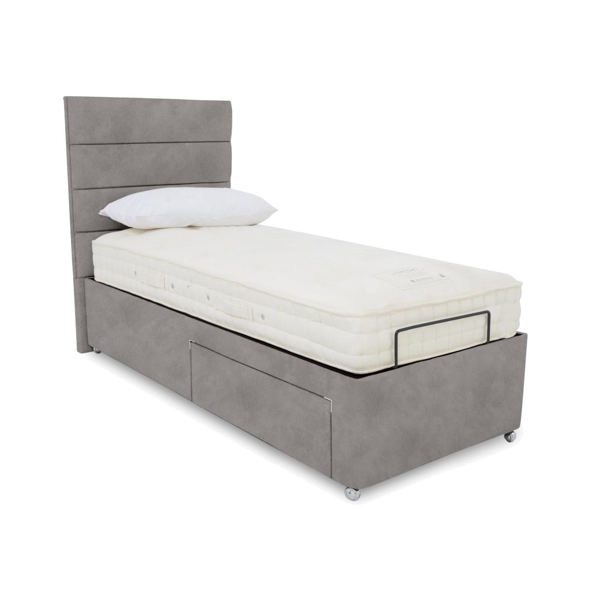 Transform the way you sleep and elevate your bedroom style with an adjustable divan bed base from our Natsu range. Complete with luxuriously cushioned headboards with modern horizontal fluting, the look is simply sumptuous and with multi-position electric-powered adjustability the level of comfort is just as impressive. They’re also perfect for anyone who needs a little extra help getting in and out of bed. As well as dual adjustable bases and optional massage functionality, these divan bases also offer optional storage drawers and large ottoman compartments. Designed and handcrafted exclusively for Furniture Village, the Natsu range is part of our E-Motion adjustable bed collection. Style meets incredible comfort in this adjustable divan base with dual control for individual comfort, massage feature and sophisticated headboard. Only at Furniture Village. Why you'll love it Find perfect comfort for better sleep with this dual-adjustable divan base with massage function. Comes complete with our sophisticated Natsu headboard with stylish horizontal stitching. Multi-setting massage function provides soothing relief for aching joints. Dual base is electric powered for smooth and efficient movement. With 2 separate bed bases, you and your partner have individual control. A simple wireless handset makes this bed so easy to adjust. Use the handy memory function to quickly return to your favourite comfort position. There’s even a weightless-feel pre-set position for TV watching. This divan base promotes restorative sleep by minimising discomfort that might wake you up. Adjustable beds can also reduce back ache, improve blood circulation and reduce snoring. It’s ideal if you need a little help getting in and out of bed. An ethical choice – this divan base is made with FSC-sourced wood. With optional storage drawers in a range of configurations. In a wide selection of fashionable upholstery fabric options. Designed and handcrafted just for Furniture Village. Made in the UK. This dual-adjustable massage divan base is part of our E-Motion range. What you need to know Mattress sold separately. To ensure bed base and mattress compatibility, consider a mattress from the E-Motion range. Please check the suitability of any mattress you are considering for this adjustable base. In king and super king sizes with dual control. Also available in single size. Do not sit on this adjustable bed with the foot end in a raised position. Clean regularly using a soft brush or vacuum with the curtain attachment. Deal with any spills promptly. Professional cleaning advised for oil- and grease-based stains. Some fabrics can show wear on areas of more use or in direct sunlight. Shop our E-Motion range for a huge choice of bed frames, divan bases, massage beds, mattresses and more.