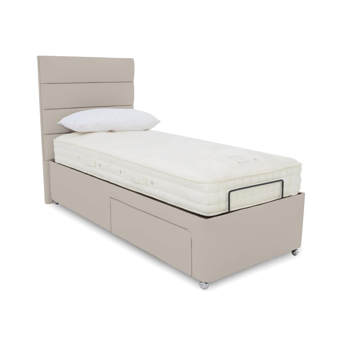 Transform the way you sleep and elevate your bedroom style with an adjustable divan bed base from our Natsu range. Complete with luxuriously cushioned headboards with modern horizontal fluting, the look is simply sumptuous and with multi-position electric-powered adjustability the level of comfort is just as impressive. They’re also perfect for anyone who needs a little extra help getting in and out of bed. As well as dual adjustable bases and optional massage functionality, these divan bases also offer optional storage drawers and large ottoman compartments. Designed and handcrafted exclusively for Furniture Village, the Natsu range is part of our E-Motion adjustable bed collection. Style meets incredible comfort in this adjustable divan base with dual control for individual comfort, massage feature and sophisticated headboard. Only at Furniture Village. Why you'll love it Find perfect comfort for better sleep with this dual-adjustable divan base with massage function. Comes complete with our sophisticated Natsu headboard with stylish horizontal stitching. Multi-setting massage function provides soothing relief for aching joints. Dual base is electric powered for smooth and efficient movement. With 2 separate bed bases, you and your partner have individual control. A simple wireless handset makes this bed so easy to adjust. Use the handy memory function to quickly return to your favourite comfort position. There’s even a weightless-feel pre-set position for TV watching. This divan base promotes restorative sleep by minimising discomfort that might wake you up. Adjustable beds can also reduce back ache, improve blood circulation and reduce snoring. It’s ideal if you need a little help getting in and out of bed. An ethical choice – this divan base is made with FSC-sourced wood. With optional storage drawers in a range of configurations. In a wide selection of fashionable upholstery fabric options. Designed and handcrafted just for Furniture Village. Made in the UK. This dual-adjustable massage divan base is part of our E-Motion range. What you need to know Mattress sold separately. To ensure bed base and mattress compatibility, consider a mattress from the E-Motion range. Please check the suitability of any mattress you are considering for this adjustable base. In king and super king sizes with dual control. Also available in single size. Do not sit on this adjustable bed with the foot end in a raised position. Clean regularly using a soft brush or vacuum with the curtain attachment. Deal with any spills promptly. Professional cleaning advised for oil- and grease-based stains. Some fabrics can show wear on areas of more use or in direct sunlight. Shop our E-Motion range for a huge choice of bed frames, divan bases, massage beds, mattresses and more.