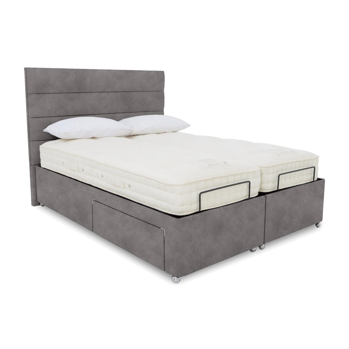 Transform the way you sleep and elevate your bedroom style with an adjustable divan bed base from our Natsu range. Complete with luxuriously cushioned headboards with modern horizontal fluting, the look is simply sumptuous and with multi-position electric-powered adjustability the level of comfort is just as impressive. They’re also perfect for anyone who needs a little extra help getting in and out of bed. As well as dual adjustable bases and optional massage functionality, these divan bases also offer optional storage drawers and large ottoman compartments. Designed and handcrafted exclusively for Furniture Village, the Natsu range is part of our E-Motion adjustable bed collection. Style meets incredible comfort in this adjustable divan base with dual control for individual comfort, massage feature and sophisticated headboard. Only at Furniture Village. Why you'll love it Find perfect comfort for better sleep with this dual-adjustable divan base with massage function. Comes complete with our sophisticated Natsu headboard with stylish horizontal stitching. Multi-setting massage function provides soothing relief for aching joints. Dual base is electric powered for smooth and efficient movement. With 2 separate bed bases, you and your partner have individual control. A simple wireless handset makes this bed so easy to adjust. Use the handy memory function to quickly return to your favourite comfort position. There’s even a weightless-feel pre-set position for TV watching. This divan base promotes restorative sleep by minimising discomfort that might wake you up. Adjustable beds can also reduce back ache, improve blood circulation and reduce snoring. It’s ideal if you need a little help getting in and out of bed. An ethical choice – this divan base is made with FSC-sourced wood. With optional storage drawers in a range of configurations. In a wide selection of fashionable upholstery fabric options. Designed and handcrafted just for Furniture Village. Made in the UK. This dual-adjustable massage divan base is part of our E-Motion range. What you need to know Mattress sold separately. To ensure bed base and mattress compatibility, consider a mattress from the E-Motion range. Please check the suitability of any mattress you are considering for this adjustable base. In king and super king sizes with dual control. Also available in single size. Do not sit on this adjustable bed with the foot end in a raised position. Clean regularly using a soft brush or vacuum with the curtain attachment. Deal with any spills promptly. Professional cleaning advised for oil- and grease-based stains. Some fabrics can show wear on areas of more use or in direct sunlight. Shop our E-Motion range for a huge choice of bed frames, divan bases, massage beds, mattresses and more.