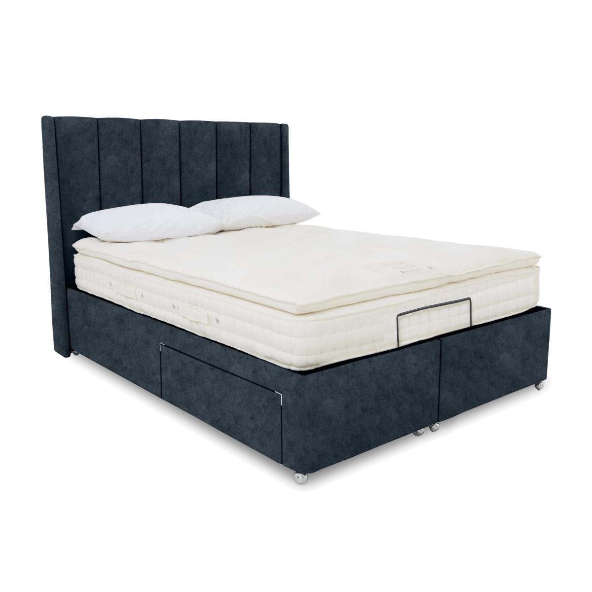 So elegant, so comfortable, so practical. The adjustable divan bases in our Ryo range are the perfect addition to any contemporary bedroom that’s focused on modern style and rejuvenating comfort. Each divan base comes complete with a tall winged headboard with understated fluting and each offers optional built-in storage drawers or ottoman storage. Bed bases are electric-powered for smooth, multi-position adjustability so it’s easy to find that perfect position whether you’re lying down or sitting up to watch TV. The range also includes dual adjustable bases and massage functionality. Designed and handcrafted exclusively for Furniture Village, the Ryo range is part of our E-Motion adjustable bed collection. Personalised comfort is yours – and fast – with this beautifully upholstered adjustable divan base. This bed base includes the luxurious Ryo winged headboard. Why you'll love it Find perfect comfort for better sleep with this adjustable divan base. Includes our elegantly curved Ryo headboard with subtle winged sides and fluting. A simple wireless handset makes this bed so easy to adjust. Use the handy memory function to quickly return to your favourite comfort position. There’s even a weightless-feel pre-set position for TV watching. This divan base promotes restorative sleep by minimising discomfort that might wake you up. Adjustable beds can also reduce back ache, improve blood circulation and reduce snoring. It’s ideal if you need a little help getting in and out of bed. An ethical choice – this divan base is made with FSC-sourced wood. With optional storage drawers in a range of configurations. In a wide selection of fashionable upholstery fabric options. Designed and handcrafted just for Furniture Village. Made in the UK. Also available with 2-person adjustability and massage function. This adjustable divan base is part of our E-Motion range. What you need to know Mattress sold separately. To ensure bed base and mattress compatibility, consider a mattress from the E-Motion range. Please check the suitability of any mattress you are considering for this adjustable base. Available in single and king sizes. Do not sit on this adjustable bed with the foot end in a raised position. Clean regularly using a soft brush or vacuum with the curtain attachment. Deal with any spills promptly. Professional cleaning advised for oil- and grease-based stains. Some fabrics can show wear on areas of more use or in direct sunlight. Shop our E-Motion range for a huge choice of bed frames, divan bases, massage beds, mattresses and more.