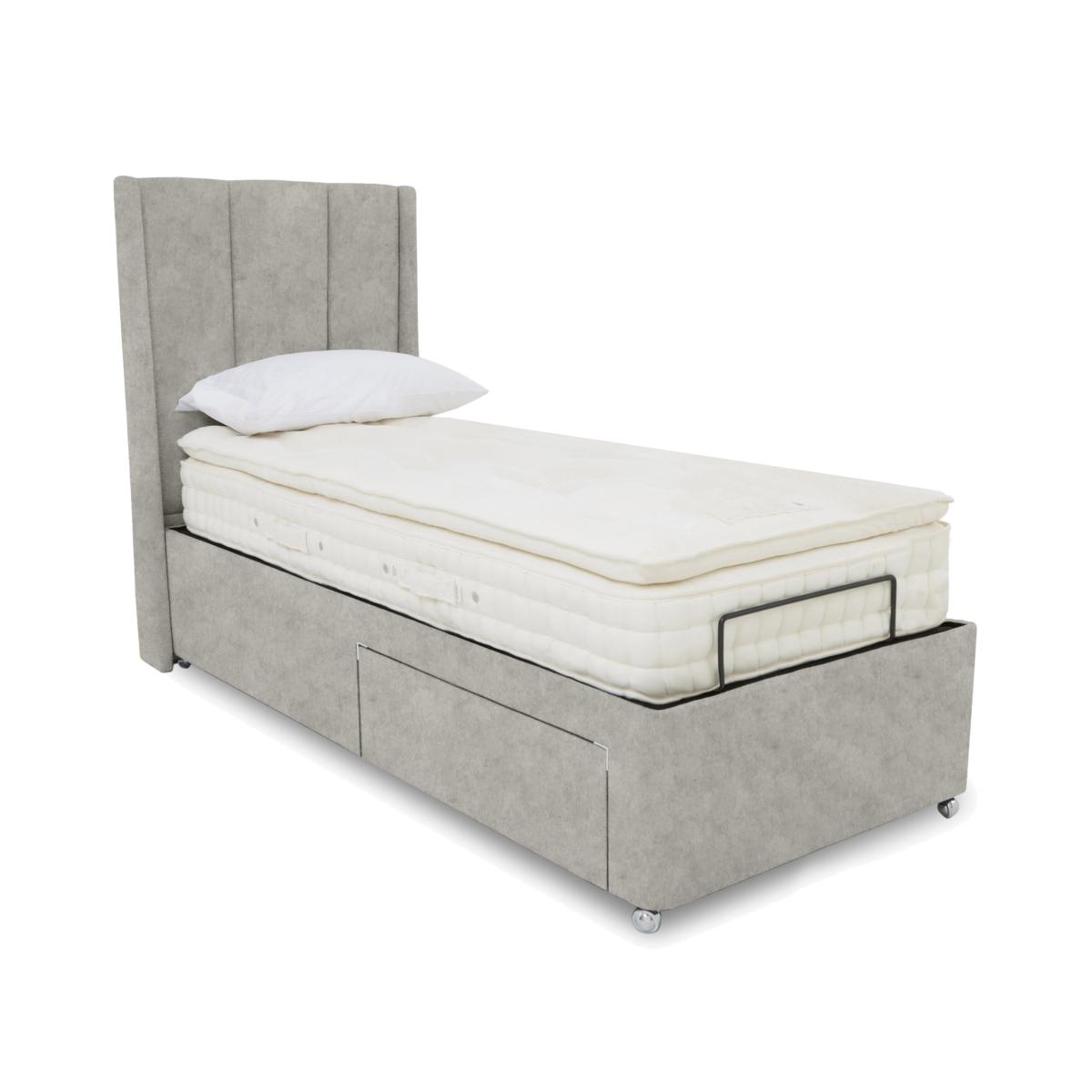So elegant, so comfortable, so practical. The adjustable divan bases in our Ryo range are the perfect addition to any contemporary bedroom that’s focused on modern style and rejuvenating comfort. Each divan base comes complete with a tall winged headboard with understated fluting and each offers optional built-in storage drawers or ottoman storage. Bed bases are electric-powered for smooth, multi-position adjustability so it’s easy to find that perfect position whether you’re lying down or sitting up to watch TV. The range also includes dual adjustable bases and massage functionality. Designed and handcrafted exclusively for Furniture Village, the Ryo range is part of our E-Motion adjustable bed collection. Personalised comfort is yours – and fast – with this beautifully upholstered adjustable divan base. This bed base includes the luxurious Ryo winged headboard. Why you'll love it Find perfect comfort for better sleep with this adjustable divan base. Includes our elegantly curved Ryo headboard with subtle winged sides and fluting. A simple wireless handset makes this bed so easy to adjust. Use the handy memory function to quickly return to your favourite comfort position. There’s even a weightless-feel pre-set position for TV watching. This divan base promotes restorative sleep by minimising discomfort that might wake you up. Adjustable beds can also reduce back ache, improve blood circulation and reduce snoring. It’s ideal if you need a little help getting in and out of bed. An ethical choice – this divan base is made with FSC-sourced wood. With optional storage drawers in a range of configurations. In a wide selection of fashionable upholstery fabric options. Designed and handcrafted just for Furniture Village. Made in the UK. Also available with 2-person adjustability and massage function. This adjustable divan base is part of our E-Motion range. What you need to know Mattress sold separately. To ensure bed base and mattress compatibility, consider a mattress from the E-Motion range. Please check the suitability of any mattress you are considering for this adjustable base. Available in single and king sizes. Do not sit on this adjustable bed with the foot end in a raised position. Clean regularly using a soft brush or vacuum with the curtain attachment. Deal with any spills promptly. Professional cleaning advised for oil- and grease-based stains. Some fabrics can show wear on areas of more use or in direct sunlight. Shop our E-Motion range for a huge choice of bed frames, divan bases, massage beds, mattresses and more.