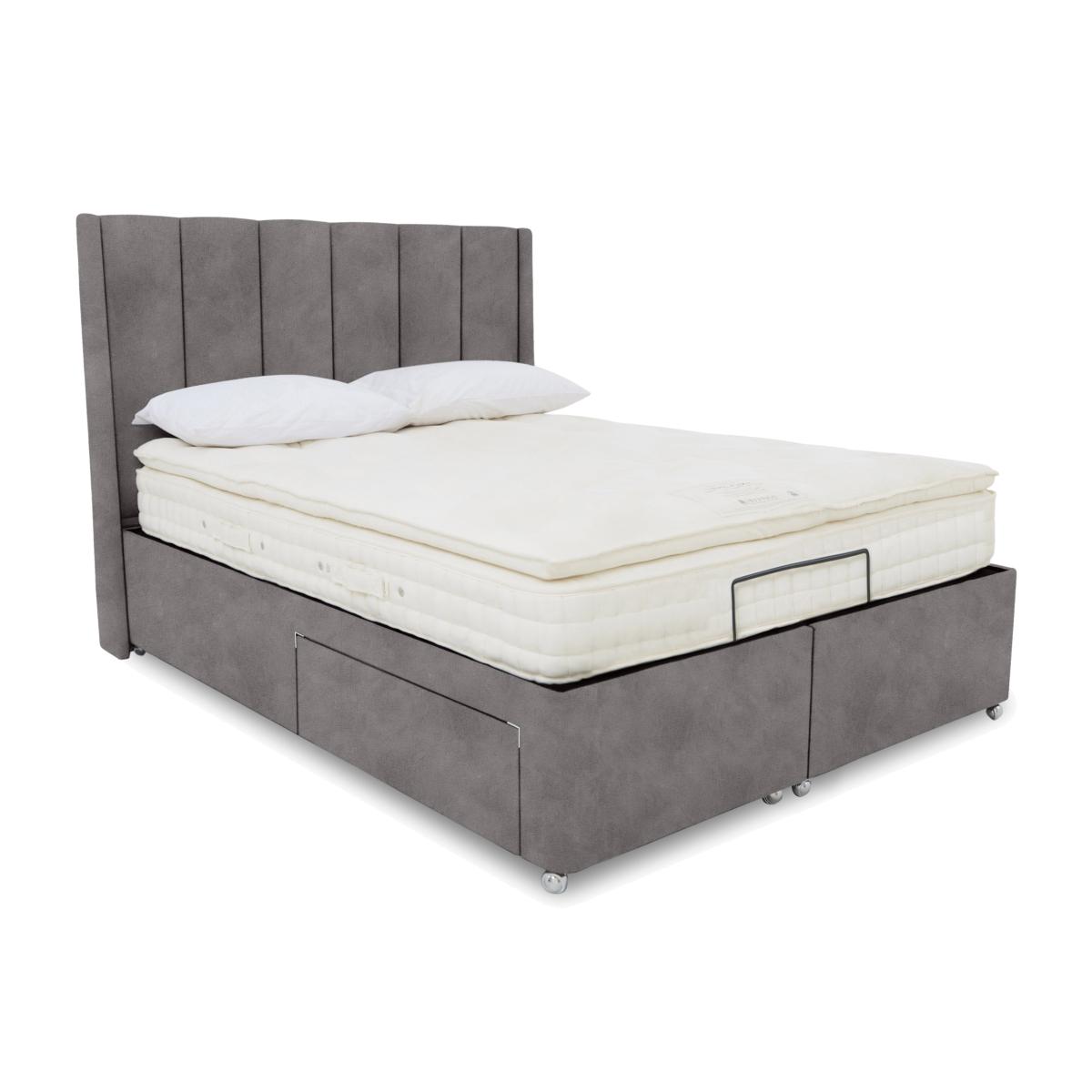 So elegant, so comfortable, so practical. The adjustable divan bases in our Ryo range are the perfect addition to any contemporary bedroom that’s focused on modern style and rejuvenating comfort. Each divan base comes complete with a tall winged headboard with understated fluting and each offers optional built-in storage drawers or ottoman storage. Bed bases are electric-powered for smooth, multi-position adjustability so it’s easy to find that perfect position whether you’re lying down or sitting up to watch TV. The range also includes dual adjustable bases and massage functionality. Designed and handcrafted exclusively for Furniture Village, the Ryo range is part of our E-Motion adjustable bed collection. Personalised comfort is yours – and fast – with this beautifully upholstered adjustable divan base. This bed base includes the luxurious Ryo winged headboard. Why you'll love it Find perfect comfort for better sleep with this adjustable divan base. Includes our elegantly curved Ryo headboard with subtle winged sides and fluting. A simple wireless handset makes this bed so easy to adjust. Use the handy memory function to quickly return to your favourite comfort position. There’s even a weightless-feel pre-set position for TV watching. This divan base promotes restorative sleep by minimising discomfort that might wake you up. Adjustable beds can also reduce back ache, improve blood circulation and reduce snoring. It’s ideal if you need a little help getting in and out of bed. An ethical choice – this divan base is made with FSC-sourced wood. With optional storage drawers in a range of configurations. In a wide selection of fashionable upholstery fabric options. Designed and handcrafted just for Furniture Village. Made in the UK. Also available with 2-person adjustability and massage function. This adjustable divan base is part of our E-Motion range. What you need to know Mattress sold separately. To ensure bed base and mattress compatibility, consider a mattress from the E-Motion range. Please check the suitability of any mattress you are considering for this adjustable base. Available in single and king sizes. Do not sit on this adjustable bed with the foot end in a raised position. Clean regularly using a soft brush or vacuum with the curtain attachment. Deal with any spills promptly. Professional cleaning advised for oil- and grease-based stains. Some fabrics can show wear on areas of more use or in direct sunlight. Shop our E-Motion range for a huge choice of bed frames, divan bases, massage beds, mattresses and more.
