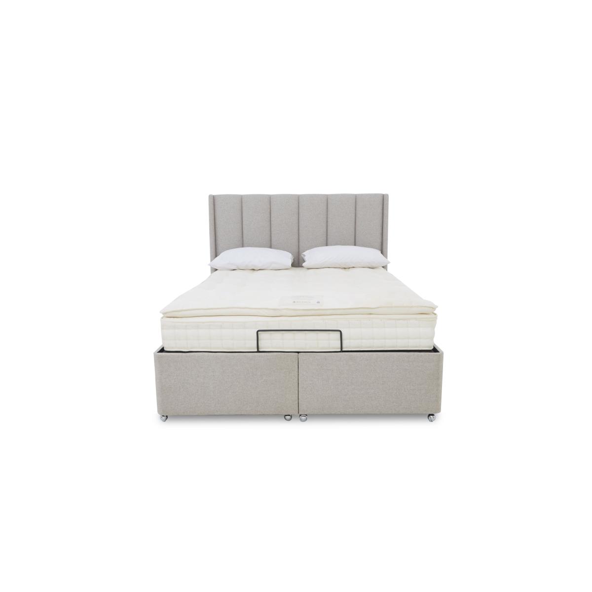 So elegant, so comfortable, so practical. The adjustable divan bases in our Ryo range are the perfect addition to any contemporary bedroom that’s focused on modern style and rejuvenating comfort. Each divan base comes complete with a tall winged headboard with understated fluting and each offers optional built-in storage drawers or ottoman storage. Bed bases are electric-powered for smooth, multi-position adjustability so it’s easy to find that perfect position whether you’re lying down or sitting up to watch TV. The range also includes dual adjustable bases and massage functionality. Designed and handcrafted exclusively for Furniture Village, the Ryo range is part of our E-Motion adjustable bed collection. This adjustable ottoman divan base gives you smooth control over your comfort and comes with our luxurious winged Ryo headboard. All that and generous underbed storage space too. Why you'll love it Find perfect comfort for better sleep with this adjustable ottoman divan base. Includes our elegantly curved Ryo headboard with subtle winged sides and fluting. And you’ll love the roomy hidden storage compartment. A simple wireless handset makes this bed so easy to adjust. Use the handy memory function to quickly return to your favourite comfort position. There’s even a weightless-feel pre-set position for TV watching. This divan base promotes restorative sleep by minimising discomfort that might wake you up. Adjustable beds can also reduce back ache, improve blood circulation and reduce snoring. It’s ideal if you need a little help getting in and out of bed. An ethical choice – this ottoman divan base is made with FSC-sourced wood. In a wide selection of fashionable upholstery fabric options. Designed and handcrafted just for Furniture Village. Made in the UK. Also available with 2-person adjustability and massage function. This adjustable ottoman divan base is part of our E-Motion range. What you need to know Mattress sold separately. To ensure bed base and mattress compatibility, consider a mattress from the E-Motion range. Please check the suitability of any mattress you are considering for this adjustable base. Available in single and king sizes. This ottoman divan base opens at the end. Maximum mattress weight is 40 kg for the single ottoman base and 80 kg for the king ottoman base. Please keep hands clear of the mechanism when opening and closing the ottoman. Do not sit on this adjustable bed with the foot end in a raised position. Clean regularly using a soft brush or vacuum with the curtain attachment. Deal with any spills promptly. Professional cleaning advised for oil- and grease-based stains. Some fabrics can show wear on areas of more use or in direct sunlight. Shop our E-Motion range for a huge choice of bed frames, divan bases, massage beds, mattresses and more.