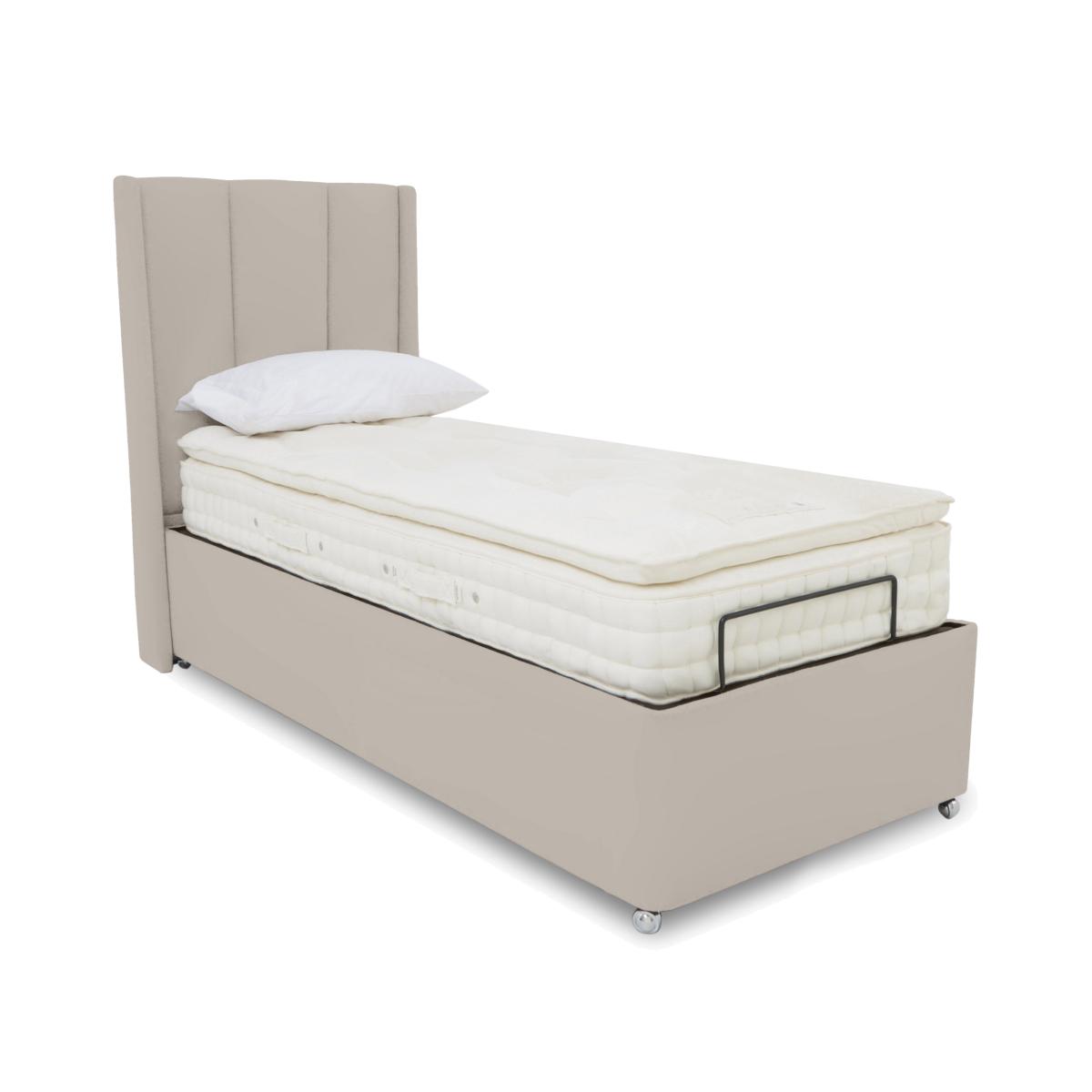 So elegant, so comfortable, so practical. The adjustable divan bases in our Ryo range are the perfect addition to any contemporary bedroom that’s focused on modern style and rejuvenating comfort. Each divan base comes complete with a tall winged headboard with understated fluting and each offers optional built-in storage drawers or ottoman storage. Bed bases are electric-powered for smooth, multi-position adjustability so it’s easy to find that perfect position whether you’re lying down or sitting up to watch TV. The range also includes dual adjustable bases and massage functionality. Designed and handcrafted exclusively for Furniture Village, the Ryo range is part of our E-Motion adjustable bed collection. This adjustable ottoman divan base gives you smooth control over your comfort and comes with our luxurious winged Ryo headboard. All that and generous underbed storage space too. Why you'll love it Find perfect comfort for better sleep with this adjustable ottoman divan base. Includes our elegantly curved Ryo headboard with subtle winged sides and fluting. And you’ll love the roomy hidden storage compartment. A simple wireless handset makes this bed so easy to adjust. Use the handy memory function to quickly return to your favourite comfort position. There’s even a weightless-feel pre-set position for TV watching. This divan base promotes restorative sleep by minimising discomfort that might wake you up. Adjustable beds can also reduce back ache, improve blood circulation and reduce snoring. It’s ideal if you need a little help getting in and out of bed. An ethical choice – this ottoman divan base is made with FSC-sourced wood. In a wide selection of fashionable upholstery fabric options. Designed and handcrafted just for Furniture Village. Made in the UK. Also available with 2-person adjustability and massage function. This adjustable ottoman divan base is part of our E-Motion range. What you need to know Mattress sold separately. To ensure bed base and mattress compatibility, consider a mattress from the E-Motion range. Please check the suitability of any mattress you are considering for this adjustable base. Available in single and king sizes. This ottoman divan base opens at the end. Maximum mattress weight is 40 kg for the single ottoman base and 80 kg for the king ottoman base. Please keep hands clear of the mechanism when opening and closing the ottoman. Do not sit on this adjustable bed with the foot end in a raised position. Clean regularly using a soft brush or vacuum with the curtain attachment. Deal with any spills promptly. Professional cleaning advised for oil- and grease-based stains. Some fabrics can show wear on areas of more use or in direct sunlight. Shop our E-Motion range for a huge choice of bed frames, divan bases, massage beds, mattresses and more.