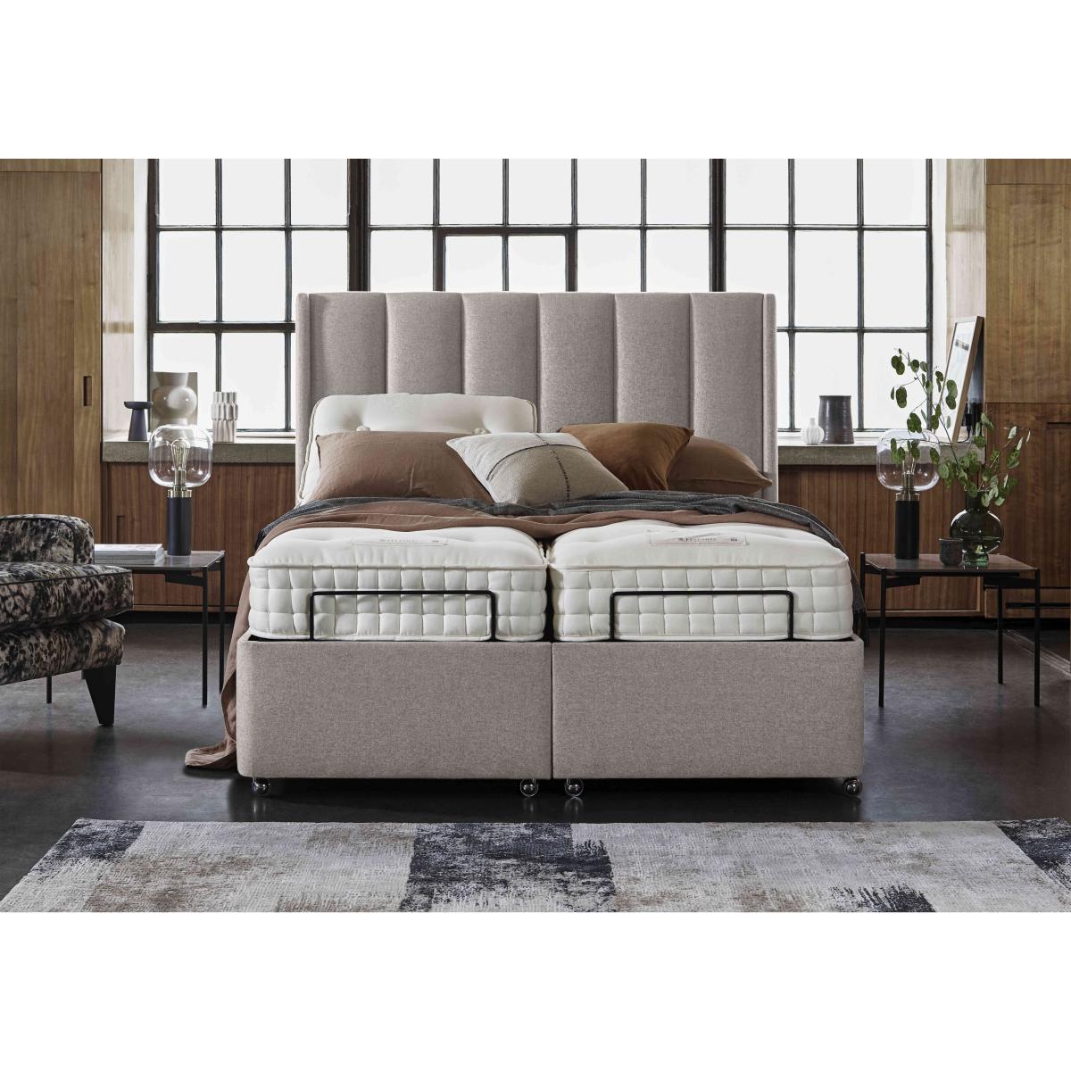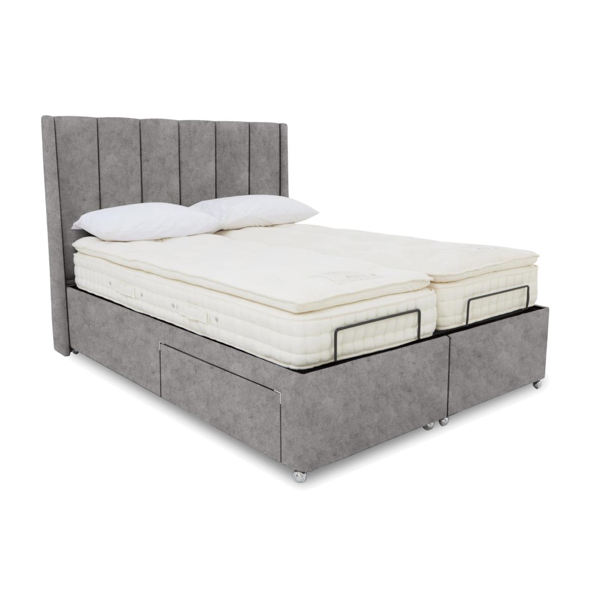 So elegant, so comfortable, so practical. The adjustable divan bases in our Ryo range are the perfect addition to any contemporary bedroom that’s focused on modern style and rejuvenating comfort. Each divan base comes complete with a tall winged headboard with understated fluting and each offers optional built-in storage drawers or ottoman storage. Bed bases are electric-powered for smooth, multi-position adjustability so it’s easy to find that perfect position whether you’re lying down or sitting up to watch TV. The range also includes dual adjustable bases and massage functionality. Designed and handcrafted exclusively for Furniture Village, the Ryo range is part of our E-Motion adjustable bed collection. This adjustable divan base cleverly has two separate bed bases so each sleeping partner can control their side of the bed. Includes a luxe winged headboard. Why you'll love it Find perfect comfort for better sleep with this dual-adjustable divan base. Includes our elegantly curved Ryo headboard with subtle winged sides and fluting. Dual base is electric powered for smooth and efficient movement. With 2 separate bed bases, you and your partner have individual control. A simple wireless handset makes this bed so easy to adjust. Use the handy memory function to quickly return to your favourite comfort position. There’s even a weightless-feel pre-set position for TV watching. This divan base promotes restorative sleep by minimising discomfort that might wake you up. Adjustable beds can also reduce back ache, improve blood circulation and reduce snoring. It’s ideal if you need a little help getting in and out of bed. An ethical choice – this divan base is made with FSC-sourced wood. With optional storage drawers in a range of configurations. In a wide selection of fashionable upholstery fabric options. Designed and handcrafted just for Furniture Village. Made in the UK. Also available with ultra-relaxing massage feature. This dual-adjustable divan base is part of our E-Motion range. What you need to know Mattress sold separately. To ensure bed base and mattress compatibility, consider a mattress from the E-Motion range. Please check the suitability of any mattress you are considering for this adjustable base. Available in king and super king sizes. Do not sit on this adjustable bed with the foot end in a raised position. Clean regularly using a soft brush or vacuum with the curtain attachment. Deal with any spills promptly. Professional cleaning advised for oil- and grease-based stains. Some fabrics can show wear on areas of more use or in direct sunlight. Shop our E-Motion range for a huge choice of bed frames, divan bases, massage beds, mattresses and more.