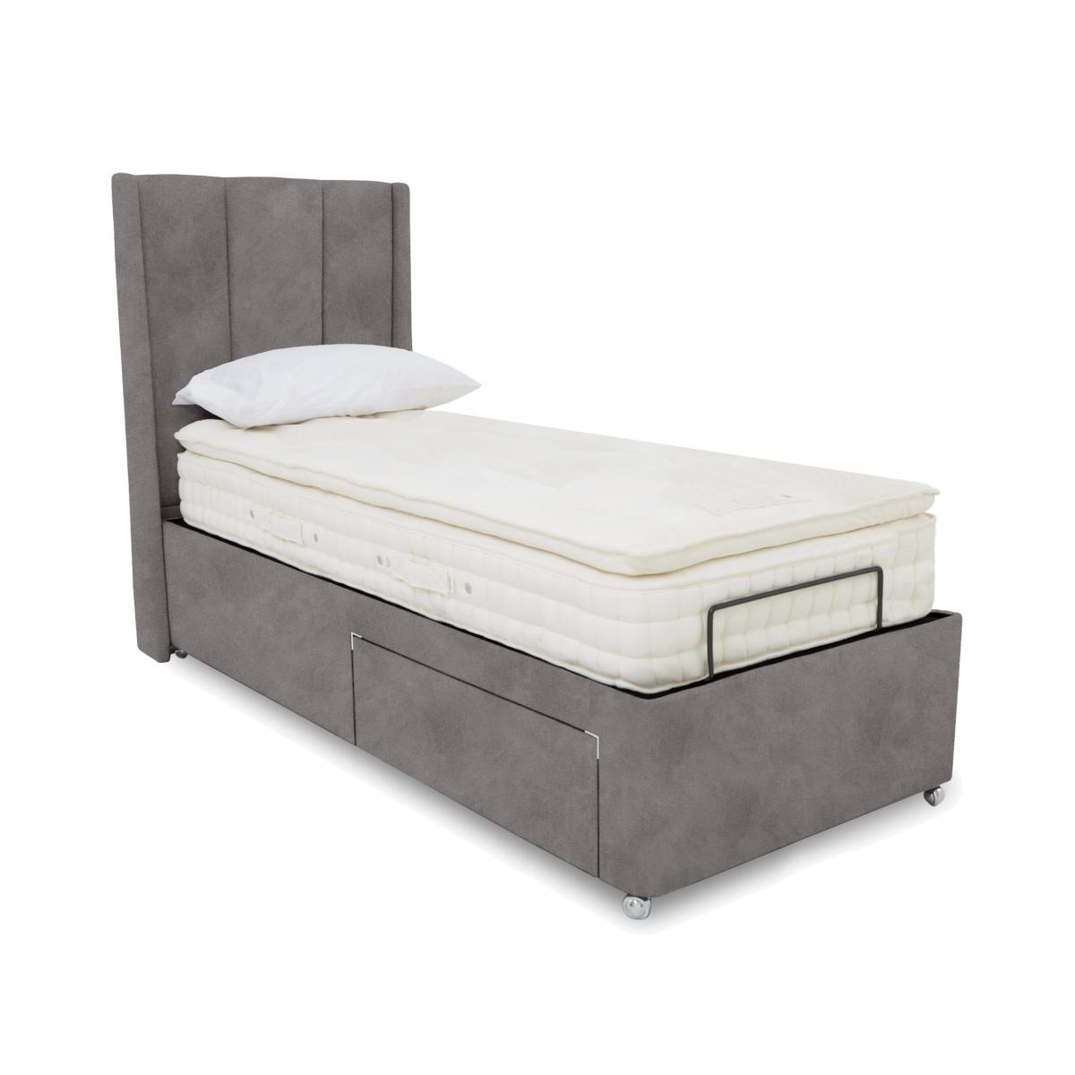 So elegant, so comfortable, so practical. The adjustable divan bases in our Ryo range are the perfect addition to any contemporary bedroom that’s focused on modern style and rejuvenating comfort. Each divan base comes complete with a tall winged headboard with understated fluting and each offers optional built-in storage drawers or ottoman storage. Bed bases are electric-powered for smooth, multi-position adjustability so it’s easy to find that perfect position whether you’re lying down or sitting up to watch TV. The range also includes dual adjustable bases and massage functionality. Designed and handcrafted exclusively for Furniture Village, the Ryo range is part of our E-Motion adjustable bed collection. This adjustable divan base promises real comfort – especially as it has a massage function and dual operation. That means two bed bases and two remote controls. Includes headboard. Why you'll love it Find perfect comfort for better sleep with this dual-adjustable divan base with massage function. Includes our elegantly curved Ryo headboard with subtle winged sides and fluting. Multi-setting massage function provides soothing relief for aching joints. Dual base is electric powered for smooth and efficient movement. With 2 separate bed bases, you and your partner have individual control. A simple wireless handset makes this bed so easy to adjust. Use the handy memory function to quickly return to your favourite comfort position. There’s even a weightless-feel pre-set position for TV watching. This divan base promotes restorative sleep by minimising discomfort that might wake you up. Adjustable beds can also reduce back ache, improve blood circulation and reduce snoring. It’s ideal if you need a little help getting in and out of bed. An ethical choice – this divan base is made with FSC-sourced wood. With optional storage drawers in a range of configurations. In a wide selection of fashionable upholstery fabric options. Designed and handcrafted just for Furniture Village. Made in the UK. This dual-adjustable massage divan base is part of our E-Motion range. What you need to know Mattress sold separately. To ensure bed base and mattress compatibility, consider a mattress from the E-Motion range. Please check the suitability of any mattress you are considering for this adjustable base. In king and super king sizes with dual control. Also available in single size. Do not sit on this adjustable bed with the foot end in a raised position. Clean regularly using a soft brush or vacuum with the curtain attachment. Deal with any spills promptly. Professional cleaning advised for oil- and grease-based stains. Some fabrics can show wear on areas of more use or in direct sunlight. Shop our E-Motion range for a huge choice of bed frames, divan bases, massage beds, mattresses and more.