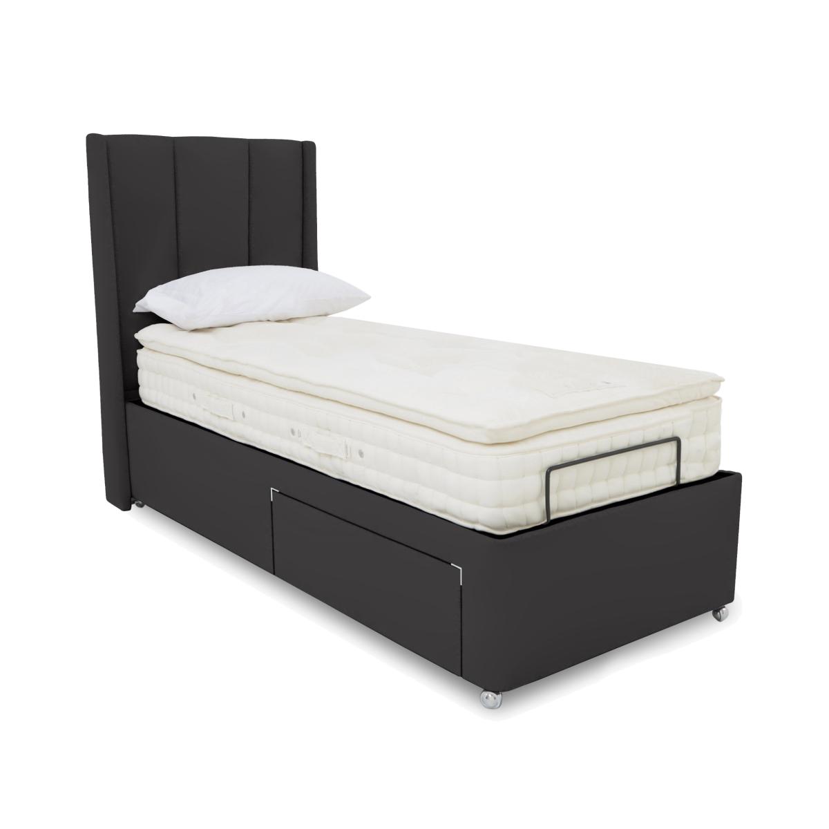 So elegant, so comfortable, so practical. The adjustable divan bases in our Ryo range are the perfect addition to any contemporary bedroom that’s focused on modern style and rejuvenating comfort. Each divan base comes complete with a tall winged headboard with understated fluting and each offers optional built-in storage drawers or ottoman storage. Bed bases are electric-powered for smooth, multi-position adjustability so it’s easy to find that perfect position whether you’re lying down or sitting up to watch TV. The range also includes dual adjustable bases and massage functionality. Designed and handcrafted exclusively for Furniture Village, the Ryo range is part of our E-Motion adjustable bed collection. This adjustable divan base promises real comfort – especially as it has a massage function and dual operation. That means two bed bases and two remote controls. Includes headboard. Why you'll love it Find perfect comfort for better sleep with this dual-adjustable divan base with massage function. Includes our elegantly curved Ryo headboard with subtle winged sides and fluting. Multi-setting massage function provides soothing relief for aching joints. Dual base is electric powered for smooth and efficient movement. With 2 separate bed bases, you and your partner have individual control. A simple wireless handset makes this bed so easy to adjust. Use the handy memory function to quickly return to your favourite comfort position. There’s even a weightless-feel pre-set position for TV watching. This divan base promotes restorative sleep by minimising discomfort that might wake you up. Adjustable beds can also reduce back ache, improve blood circulation and reduce snoring. It’s ideal if you need a little help getting in and out of bed. An ethical choice – this divan base is made with FSC-sourced wood. With optional storage drawers in a range of configurations. In a wide selection of fashionable upholstery fabric options. Designed and handcrafted just for Furniture Village. Made in the UK. This dual-adjustable massage divan base is part of our E-Motion range. What you need to know Mattress sold separately. To ensure bed base and mattress compatibility, consider a mattress from the E-Motion range. Please check the suitability of any mattress you are considering for this adjustable base. In king and super king sizes with dual control. Also available in single size. Do not sit on this adjustable bed with the foot end in a raised position. Clean regularly using a soft brush or vacuum with the curtain attachment. Deal with any spills promptly. Professional cleaning advised for oil- and grease-based stains. Some fabrics can show wear on areas of more use or in direct sunlight. Shop our E-Motion range for a huge choice of bed frames, divan bases, massage beds, mattresses and more.