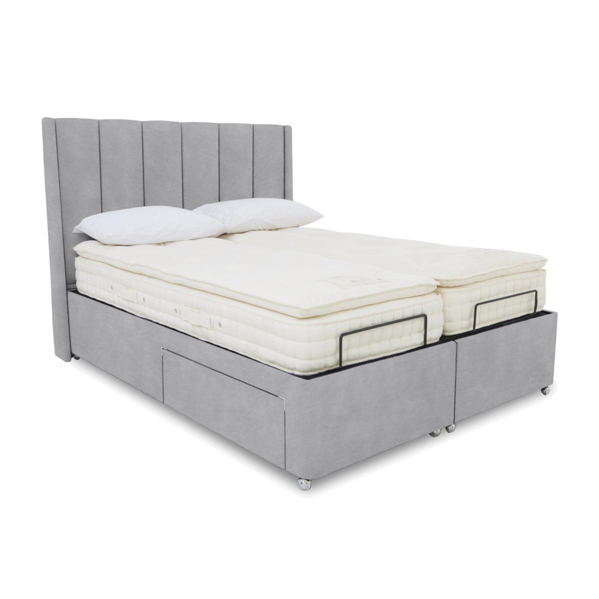 So elegant, so comfortable, so practical. The adjustable divan bases in our Ryo range are the perfect addition to any contemporary bedroom that’s focused on modern style and rejuvenating comfort. Each divan base comes complete with a tall winged headboard with understated fluting and each offers optional built-in storage drawers or ottoman storage. Bed bases are electric-powered for smooth, multi-position adjustability so it’s easy to find that perfect position whether you’re lying down or sitting up to watch TV. The range also includes dual adjustable bases and massage functionality. Designed and handcrafted exclusively for Furniture Village, the Ryo range is part of our E-Motion adjustable bed collection. This adjustable divan base promises real comfort – especially as it has a massage function and dual operation. That means two bed bases and two remote controls. Includes headboard. Why you'll love it Find perfect comfort for better sleep with this dual-adjustable divan base with massage function. Includes our elegantly curved Ryo headboard with subtle winged sides and fluting. Multi-setting massage function provides soothing relief for aching joints. Dual base is electric powered for smooth and efficient movement. With 2 separate bed bases, you and your partner have individual control. A simple wireless handset makes this bed so easy to adjust. Use the handy memory function to quickly return to your favourite comfort position. There’s even a weightless-feel pre-set position for TV watching. This divan base promotes restorative sleep by minimising discomfort that might wake you up. Adjustable beds can also reduce back ache, improve blood circulation and reduce snoring. It’s ideal if you need a little help getting in and out of bed. An ethical choice – this divan base is made with FSC-sourced wood. With optional storage drawers in a range of configurations. In a wide selection of fashionable upholstery fabric options. Designed and handcrafted just for Furniture Village. Made in the UK. This dual-adjustable massage divan base is part of our E-Motion range. What you need to know Mattress sold separately. To ensure bed base and mattress compatibility, consider a mattress from the E-Motion range. Please check the suitability of any mattress you are considering for this adjustable base. In king and super king sizes with dual control. Also available in single size. Do not sit on this adjustable bed with the foot end in a raised position. Clean regularly using a soft brush or vacuum with the curtain attachment. Deal with any spills promptly. Professional cleaning advised for oil- and grease-based stains. Some fabrics can show wear on areas of more use or in direct sunlight. Shop our E-Motion range for a huge choice of bed frames, divan bases, massage beds, mattresses and more.
