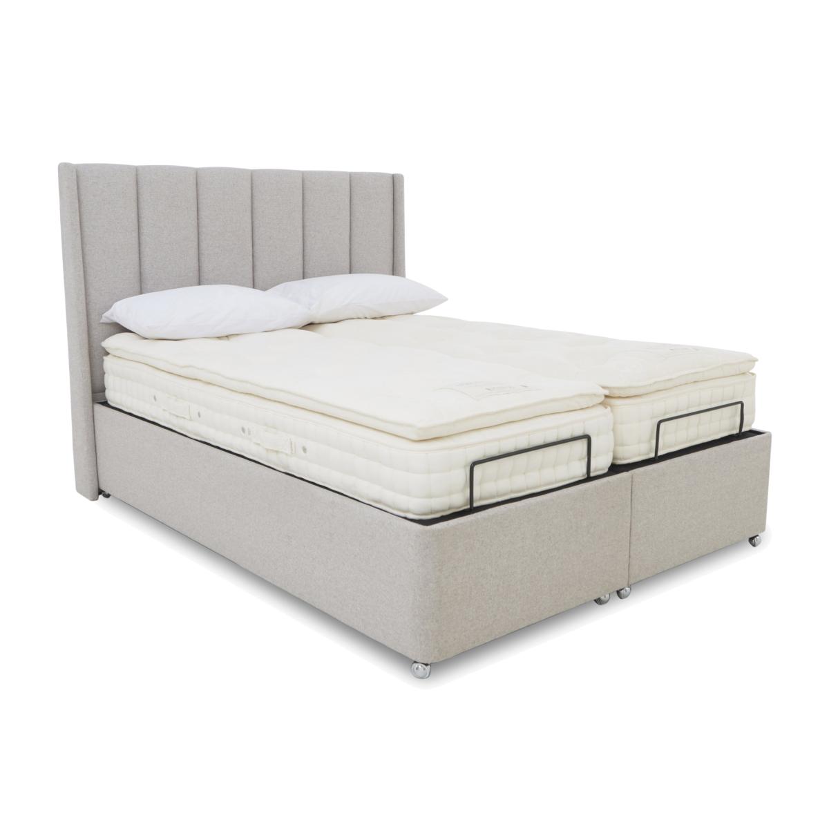 So elegant, so comfortable, so practical. The adjustable divan bases in our Ryo range are the perfect addition to any contemporary bedroom that’s focused on modern style and rejuvenating comfort. Each divan base comes complete with a tall winged headboard with understated fluting and each offers optional built-in storage drawers or ottoman storage. Bed bases are electric-powered for smooth, multi-position adjustability so it’s easy to find that perfect position whether you’re lying down or sitting up to watch TV. The range also includes dual adjustable bases and massage functionality. Designed and handcrafted exclusively for Furniture Village, the Ryo range is part of our E-Motion adjustable bed collection. This adjustable ottoman storage divan base has two separate bases for personalised comfort. Plus, it comes with our luxurious Ryo winged headboard. Why you'll love it Find perfect comfort for better sleep with this dual-adjustable ottoman divan base. Includes our elegantly curved Ryo headboard with subtle winged sides and fluting. And you’ll love the roomy hidden storage compartment. Dual base is electric powered for smooth and efficient movement. With 2 separate bed bases, you and your partner have individual control. A simple wireless handset makes this bed so easy to adjust. Use the handy memory function to quickly return to your favourite comfort position. There’s even a weightless-feel pre-set position for TV watching. This divan base promotes restorative sleep by minimising discomfort that might wake you up. Adjustable beds can also reduce back ache, improve blood circulation and reduce snoring. It’s ideal if you need a little help getting in and out of bed. An ethical choice – this ottoman divan base is made with FSC-sourced wood. In a wide selection of fashionable upholstery fabric options. Designed and handcrafted just for Furniture Village. Made in the UK. Also available with ultra-relaxing massage feature. This dual-adjustable ottoman divan base is part of our E-Motion range. What you need to know Mattress sold separately. To ensure bed base and mattress compatibility, consider a mattress from the E-Motion range. Please check the suitability of any mattress you are considering for this adjustable base. Available in king and super king sizes. This ottoman divan base opens at the end. Maximum mattress weight is 80 kg. Please keep hands clear of the mechanism when opening and closing the ottoman. Do not sit on this adjustable bed with the foot end in a raised position. Clean regularly using a soft brush or vacuum with the curtain attachment. Deal with any spills promptly. Professional cleaning advised for oil- and grease-based stains. Some fabrics can show wear on areas of more use or in direct sunlight. Shop our E-Motion range for a huge choice of bed frames, divan bases, massage beds, mattresses and more.