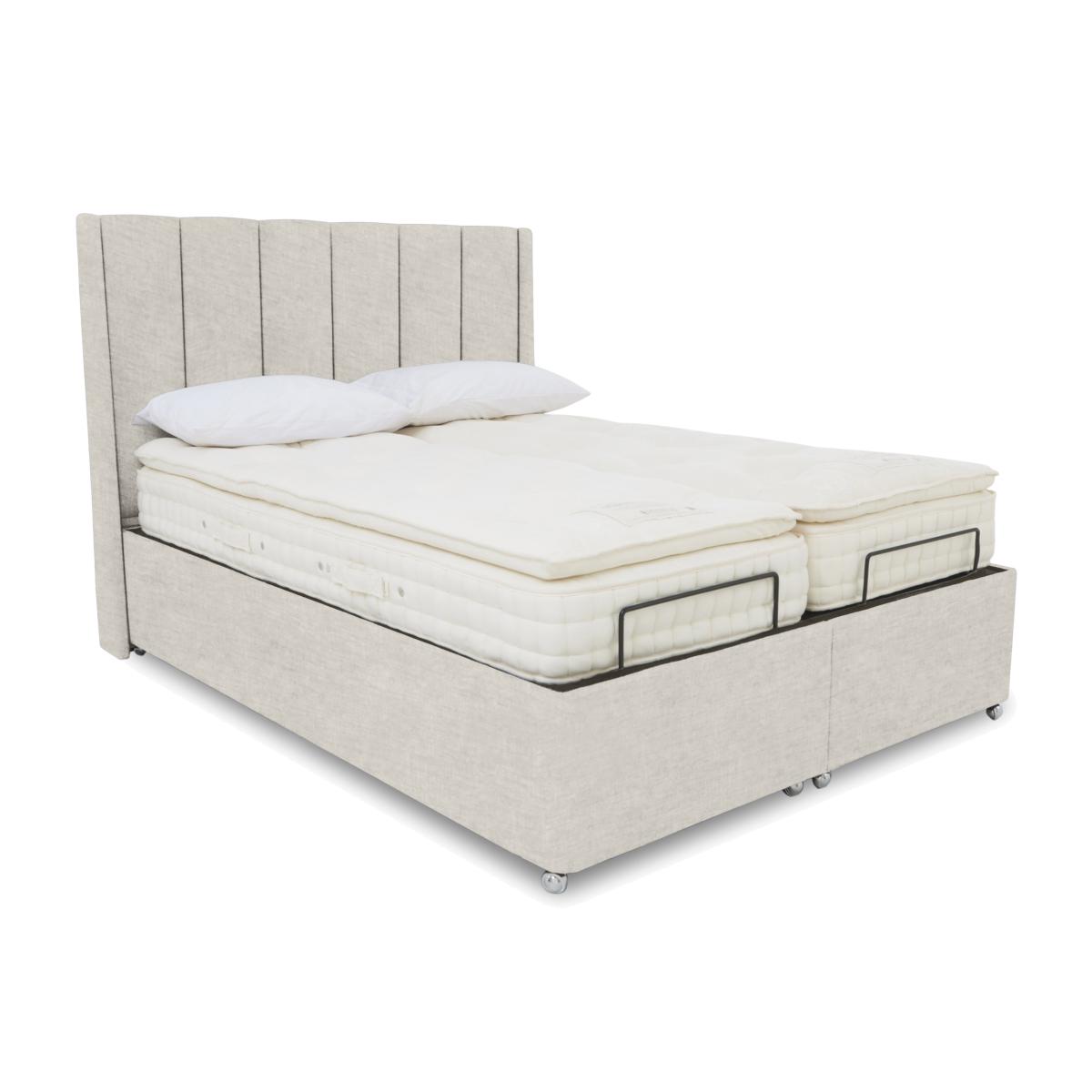 So elegant, so comfortable, so practical. The adjustable divan bases in our Ryo range are the perfect addition to any contemporary bedroom that’s focused on modern style and rejuvenating comfort. Each divan base comes complete with a tall winged headboard with understated fluting and each offers optional built-in storage drawers or ottoman storage. Bed bases are electric-powered for smooth, multi-position adjustability so it’s easy to find that perfect position whether you’re lying down or sitting up to watch TV. The range also includes dual adjustable bases and massage functionality. Designed and handcrafted exclusively for Furniture Village, the Ryo range is part of our E-Motion adjustable bed collection. With two-side individual control plus massage feature and built-in storage, you’ll love this adjustable ottoman divan base. And you’ll love its luxurious winged headboard too. Why you'll love it Find perfect comfort for better sleep with this dual-adjustable massage ottoman divan base with massage function. Includes our elegantly curved Ryo headboard with subtle winged sides and fluting. And you’ll love the roomy hidden storage compartment. Multi-setting massage function provides soothing relief for aching joints. Dual base is electric powered for smooth and efficient movement. With 2 separate bed bases, you and your partner have individual control. A simple wireless handset makes this bed so easy to adjust. Use the handy memory function to quickly return to your favourite comfort position. There’s even a weightless-feel pre-set position for TV watching. This divan base promotes restorative sleep by minimising discomfort that might wake you up. Adjustable beds can also reduce back ache, improve blood circulation and reduce snoring. It’s ideal if you need a little help getting in and out of bed. An ethical choice – this ottoman divan base is made with FSC-sourced wood. In a wide selection of fashionable upholstery fabric options. Designed and handcrafted just for Furniture Village. Made in the UK. This dual-adjustable massage ottoman divan base is part of our E-Motion range. What you need to know Mattress sold separately. To ensure bed base and mattress compatibility, consider a mattress from the E-Motion range. Please check the suitability of any mattress you are considering for this adjustable base. In king and super king sizes with dual control. Also available in single size. This ottoman divan base opens at the end. Maximum mattress weight is 40 kg for the single ottoman base and 80 kg for the king and super king ottoman bases. Please keep hands clear of the mechanism when opening and closing the ottoman. Do not sit on this adjustable bed with the foot end in a raised position. Clean regularly using a soft brush or vacuum with the curtain attachment. Deal with any spills promptly. Professional cleaning advised for oil- and grease-based stains. Some fabrics can show wear on areas of more use or in direct sunlight. Shop our E-Motion range for a huge choice of bed frames, divan bases, massage beds, mattresses and more.
