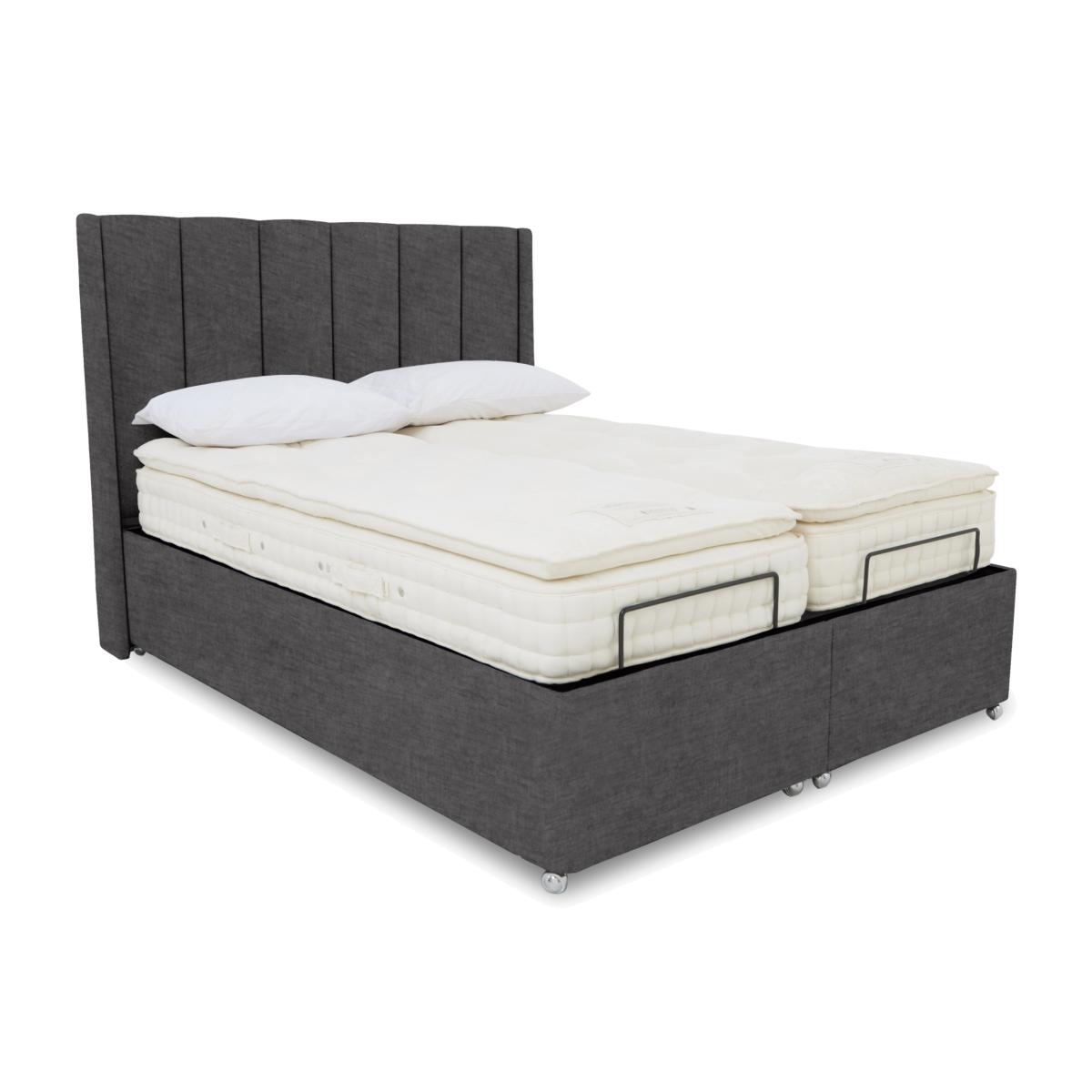 So elegant, so comfortable, so practical. The adjustable divan bases in our Ryo range are the perfect addition to any contemporary bedroom that’s focused on modern style and rejuvenating comfort. Each divan base comes complete with a tall winged headboard with understated fluting and each offers optional built-in storage drawers or ottoman storage. Bed bases are electric-powered for smooth, multi-position adjustability so it’s easy to find that perfect position whether you’re lying down or sitting up to watch TV. The range also includes dual adjustable bases and massage functionality. Designed and handcrafted exclusively for Furniture Village, the Ryo range is part of our E-Motion adjustable bed collection. With two-side individual control plus massage feature and built-in storage, you’ll love this adjustable ottoman divan base. And you’ll love its luxurious winged headboard too. Why you'll love it Find perfect comfort for better sleep with this dual-adjustable massage ottoman divan base with massage function. Includes our elegantly curved Ryo headboard with subtle winged sides and fluting. And you’ll love the roomy hidden storage compartment. Multi-setting massage function provides soothing relief for aching joints. Dual base is electric powered for smooth and efficient movement. With 2 separate bed bases, you and your partner have individual control. A simple wireless handset makes this bed so easy to adjust. Use the handy memory function to quickly return to your favourite comfort position. There’s even a weightless-feel pre-set position for TV watching. This divan base promotes restorative sleep by minimising discomfort that might wake you up. Adjustable beds can also reduce back ache, improve blood circulation and reduce snoring. It’s ideal if you need a little help getting in and out of bed. An ethical choice – this ottoman divan base is made with FSC-sourced wood. In a wide selection of fashionable upholstery fabric options. Designed and handcrafted just for Furniture Village. Made in the UK. This dual-adjustable massage ottoman divan base is part of our E-Motion range. What you need to know Mattress sold separately. To ensure bed base and mattress compatibility, consider a mattress from the E-Motion range. Please check the suitability of any mattress you are considering for this adjustable base. In king and super king sizes with dual control. Also available in single size. This ottoman divan base opens at the end. Maximum mattress weight is 40 kg for the single ottoman base and 80 kg for the king and super king ottoman bases. Please keep hands clear of the mechanism when opening and closing the ottoman. Do not sit on this adjustable bed with the foot end in a raised position. Clean regularly using a soft brush or vacuum with the curtain attachment. Deal with any spills promptly. Professional cleaning advised for oil- and grease-based stains. Some fabrics can show wear on areas of more use or in direct sunlight. Shop our E-Motion range for a huge choice of bed frames, divan bases, massage beds, mattresses and more.