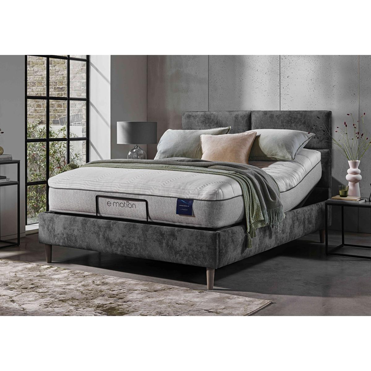 The strikingly modern and minimalist look of our Sakura range of bed frames is in luxurious contrast to the comfort you’ll find within. This range of electric-powered adjustable bed frames takes personalised relaxation to another level with multi-position adjustability and optional built-in massage function. Beautifully upholstered in a wide choice of fabrics and with deeply cushioned headboards, they deliver true comfort whether you’re sleeping or sitting up in bed to read. Offered in a choice of sizes, the range also includes bed frames with dual adjustable bases. Designed and handcrafted exclusively for Furniture Village, the Sakura range is part of our E-Motion adjustable bed collection. Redefining personalised comfort, this fabulous adjustable bed frame features a stylishly understated headboard and a smooth electric-powered mechanism. Why you'll love it Find perfect comfort for better sleep with this adjustable bed frame. Its stylish cushioned headboard is modern and minimal. The base is electric powered for smooth and efficient movement. A simple wireless handset makes this bed so easy to adjust. Use the handy memory function to quickly return to your favourite comfort position. There’s even a weightless-feel pre-set position for TV watching. This bed frame promotes restorative sleep by minimising discomfort that might wake you up. Adjustable beds can also reduce back ache, improve blood circulation and reduce snoring. It’s ideal if you need a little help getting in and out of bed. An ethical choice – this bed frame is made with FSC-sourced wood. In a wide selection of fashionable upholstery fabric options. Designed and handcrafted just for Furniture Village. Made in the UK. Also available with 2-person adjustability and massage function. This adjustable bed frame is part of our E-Motion range. What you need to know Mattress sold separately. To ensure bed base and mattress compatibility, consider a mattress from the E-Motion range. Please check the suitability of any mattress you are considering for this adjustable base. Available in single and king sizes. Do not sit on this adjustable bed with the foot end in a raised position. Clean regularly using a soft brush or vacuum with the curtain attachment. Deal with any spills promptly. Professional cleaning advised for oil- and grease-based stains. Some fabrics can show wear on areas of more use or in direct sunlight. Shop our E-Motion range for a huge choice of bed frames, divan bases, massage beds, mattresses and more.