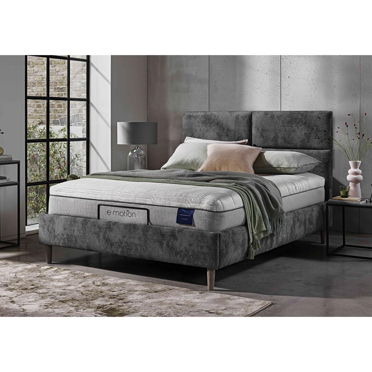 The strikingly modern and minimalist look of our Sakura range of bed frames is in luxurious contrast to the comfort you’ll find within. This range of electric-powered adjustable bed frames takes personalised relaxation to another level with multi-position adjustability and optional built-in massage function. Beautifully upholstered in a wide choice of fabrics and with deeply cushioned headboards, they deliver true comfort whether you’re sleeping or sitting up in bed to read. Offered in a choice of sizes, the range also includes bed frames with dual adjustable bases. Designed and handcrafted exclusively for Furniture Village, the Sakura range is part of our E-Motion adjustable bed collection. Redefining personalised comfort, this fabulous adjustable bed frame features a stylishly understated headboard and a smooth electric-powered mechanism. Why you'll love it Find perfect comfort for better sleep with this adjustable bed frame. Its stylish cushioned headboard is modern and minimal. The base is electric powered for smooth and efficient movement. A simple wireless handset makes this bed so easy to adjust. Use the handy memory function to quickly return to your favourite comfort position. There’s even a weightless-feel pre-set position for TV watching. This bed frame promotes restorative sleep by minimising discomfort that might wake you up. Adjustable beds can also reduce back ache, improve blood circulation and reduce snoring. It’s ideal if you need a little help getting in and out of bed. An ethical choice – this bed frame is made with FSC-sourced wood. In a wide selection of fashionable upholstery fabric options. Designed and handcrafted just for Furniture Village. Made in the UK. Also available with 2-person adjustability and massage function. This adjustable bed frame is part of our E-Motion range. What you need to know Mattress sold separately. To ensure bed base and mattress compatibility, consider a mattress from the E-Motion range. Please check the suitability of any mattress you are considering for this adjustable base. Available in single and king sizes. Do not sit on this adjustable bed with the foot end in a raised position. Clean regularly using a soft brush or vacuum with the curtain attachment. Deal with any spills promptly. Professional cleaning advised for oil- and grease-based stains. Some fabrics can show wear on areas of more use or in direct sunlight. Shop our E-Motion range for a huge choice of bed frames, divan bases, massage beds, mattresses and more.