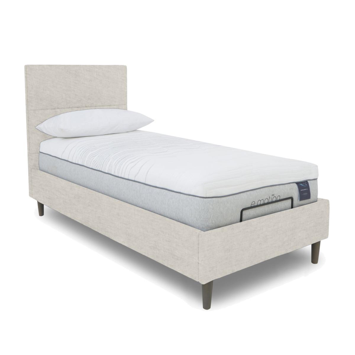 The strikingly modern and minimalist look of our Sakura range of bed frames is in luxurious contrast to the comfort you’ll find within. This range of electric-powered adjustable bed frames takes personalised relaxation to another level with multi-position adjustability and optional built-in massage function. Beautifully upholstered in a wide choice of fabrics and with deeply cushioned headboards, they deliver true comfort whether you’re sleeping or sitting up in bed to read. Offered in a choice of sizes, the range also includes bed frames with dual adjustable bases. Designed and handcrafted exclusively for Furniture Village, the Sakura range is part of our E-Motion adjustable bed collection. Sleeping is believing. This minimal and modern bed frame has electric-powered adjustability as well as a massage feature. Dual operation gives both of you individual control. Why you'll love it Find perfect comfort for better sleep with this dual-adjustable bed frame with massage function. Its stylish cushioned headboard is modern and minimal. Multi-setting massage function provides soothing relief for aching joints. Dual base is electric powered for smooth and efficient movement. With 2 separate bed bases, you and your partner have individual control. A simple wireless handset makes this bed so easy to adjust. Use the handy memory function to quickly return to your favourite comfort position. There’s even a weightless-feel pre-set position for TV watching. This bed frame promotes restorative sleep by minimising discomfort that might wake you up. Adjustable beds can also reduce back ache, improve blood circulation and reduce snoring. It’s ideal if you need a little help getting in and out of bed. An ethical choice – this bed frame is made with FSC-sourced wood. In a wide selection of fashionable upholstery fabric options. Designed and handcrafted just for Furniture Village. Made in the UK. This dual-adjustable massage bed frame is part of our E-Motion range. What you need to know Mattress sold separately. To ensure bed base and mattress compatibility, consider a mattress from the E-Motion range. Please check the suitability of any mattress you are considering for this adjustable base. In king and super king sizes with dual control. Also available in single size. Do not sit on this adjustable bed with the foot end in a raised position. Clean regularly using a soft brush or vacuum with the curtain attachment. Deal with any spills promptly. Professional cleaning advised for oil- and grease-based stains. Some fabrics can show wear on areas of more use or in direct sunlight. Shop our E-Motion range for a huge choice of bed frames, divan bases, massage beds, mattresses and more.