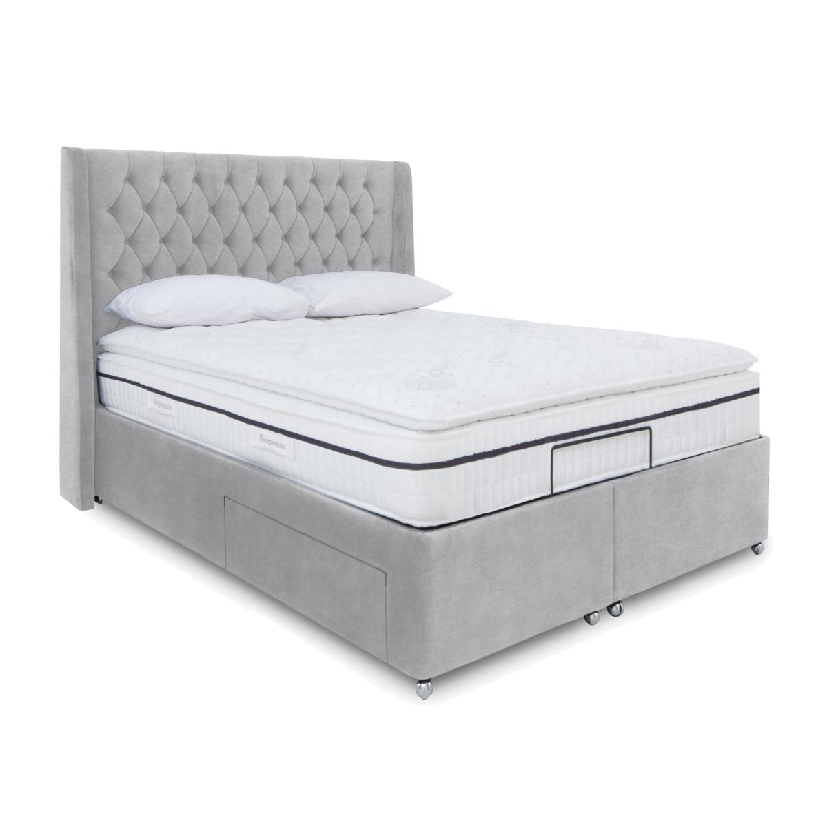 Statement bedroom style meets superb comfort in our Zen range of stunning adjustable divan bed bases. Each bed in the range comes complete with the most striking of headboards – tall, winged and with rows of buttoning for a glam twist on a classic look. Bases are electric powered and offer multi-position adjustability for complete comfort whether you’re sleeping or watching TV in bed. Zen divan bases come with optional drawers, ottoman storage and massage functionality and are available in a choice of sizes. The range also includes dual adjustable bases. Designed and handcrafted exclusively for Furniture Village, the Zen range is part of our E-Motion adjustable bed collection. Comfort your way. This adjustable divan base makes better sleep easier thanks to its electric-powered base and wireless control. That tall winged headboard is simply stunning. Why you'll love it Find perfect comfort for better sleep with this adjustable divan base. Includes our statement Zen headboard with traditional buttoning and winged sides. A simple wireless handset makes this bed so easy to adjust. Use the handy memory function to quickly return to your favourite comfort position. There’s even a weightless-feel pre-set position for TV watching. This divan base promotes restorative sleep by minimising discomfort that might wake you up. Adjustable beds can also reduce back ache, improve blood circulation and reduce snoring. It’s ideal if you need a little help getting in and out of bed. An ethical choice – this divan base is made with FSC-sourced wood. With optional storage drawers in a range of configurations. In a wide selection of fashionable upholstery fabric options. Designed and handcrafted just for Furniture Village. Made in the UK. Also available with 2-person adjustability and massage function. This adjustable divan base is part of our E-Motion range. What you need to know Mattress sold separately. To ensure bed base and mattress compatibility, consider a mattress from the E-Motion range. Please check the suitability of any mattress you are considering for this adjustable base. Available in single and king sizes. Do not sit on this adjustable bed with the foot end in a raised position. Clean regularly using a soft brush or vacuum with the curtain attachment. Deal with any spills promptly. Professional cleaning advised for oil- and grease-based stains. Some fabrics can show wear on areas of more use or in direct sunlight. Shop our E-Motion range for a huge choice of bed frames, divan bases, massage beds, mattresses and more.
