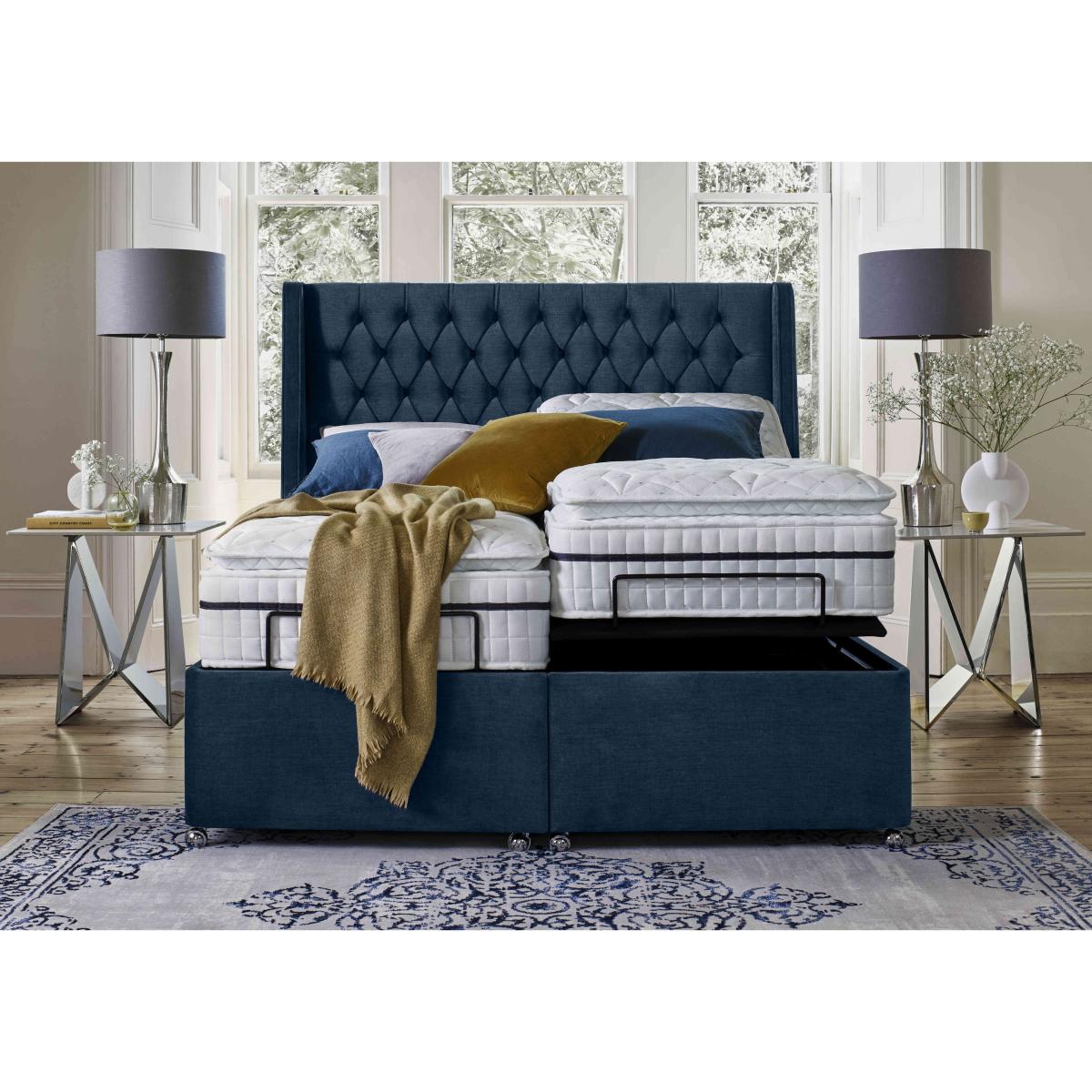 Statement bedroom style meets superb comfort in our Zen range of stunning adjustable divan bed bases. Each bed in the range comes complete with the most striking of headboards – tall, winged and with rows of buttoning for a glam twist on a classic look. Bases are electric powered and offer multi-position adjustability for complete comfort whether you’re sleeping or watching TV in bed. Zen divan bases come with optional drawers, ottoman storage and massage functionality and are available in a choice of sizes. The range also includes dual adjustable bases. Designed and handcrafted exclusively for Furniture Village, the Zen range is part of our E-Motion adjustable bed collection. This divan base looks fabulous – that tall and luxuriously buttoned headboard is a real showstopper – and it has a split base for two-person comfort control. Why you'll love it Find perfect comfort for better sleep with this dual-adjustable divan base. Includes our statement Zen headboard with traditional buttoning and winged sides. Dual base is electric powered for smooth and efficient movement. With 2 separate bed bases, you and your partner have individual control. A simple wireless handset makes this bed so easy to adjust. Use the handy memory function to quickly return to your favourite comfort position. There’s even a weightless-feel pre-set position for TV watching. This divan base promotes restorative sleep by minimising discomfort that might wake you up. Adjustable beds can also reduce back ache, improve blood circulation and reduce snoring. It’s ideal if you need a little help getting in and out of bed. An ethical choice – this divan base is made with FSC-sourced wood. With optional storage drawers in a range of configurations. In a wide selection of fashionable upholstery fabric options. Designed and handcrafted just for Furniture Village. Made in the UK. Also available with ultra-relaxing massage feature. This dual-adjustable divan base is part of our E-Motion range. What you need to know Mattress sold separately. To ensure bed base and mattress compatibility, consider a mattress from the E-Motion range. Please check the suitability of any mattress you are considering for this adjustable base. Available in king and super king sizes. Do not sit on this adjustable bed with the foot end in a raised position. Clean regularly using a soft brush or vacuum with the curtain attachment. Deal with any spills promptly. Professional cleaning advised for oil- and grease-based stains. Some fabrics can show wear on areas of more use or in direct sunlight. Shop our E-Motion range for a huge choice of bed frames, divan bases, massage beds, mattresses and more.