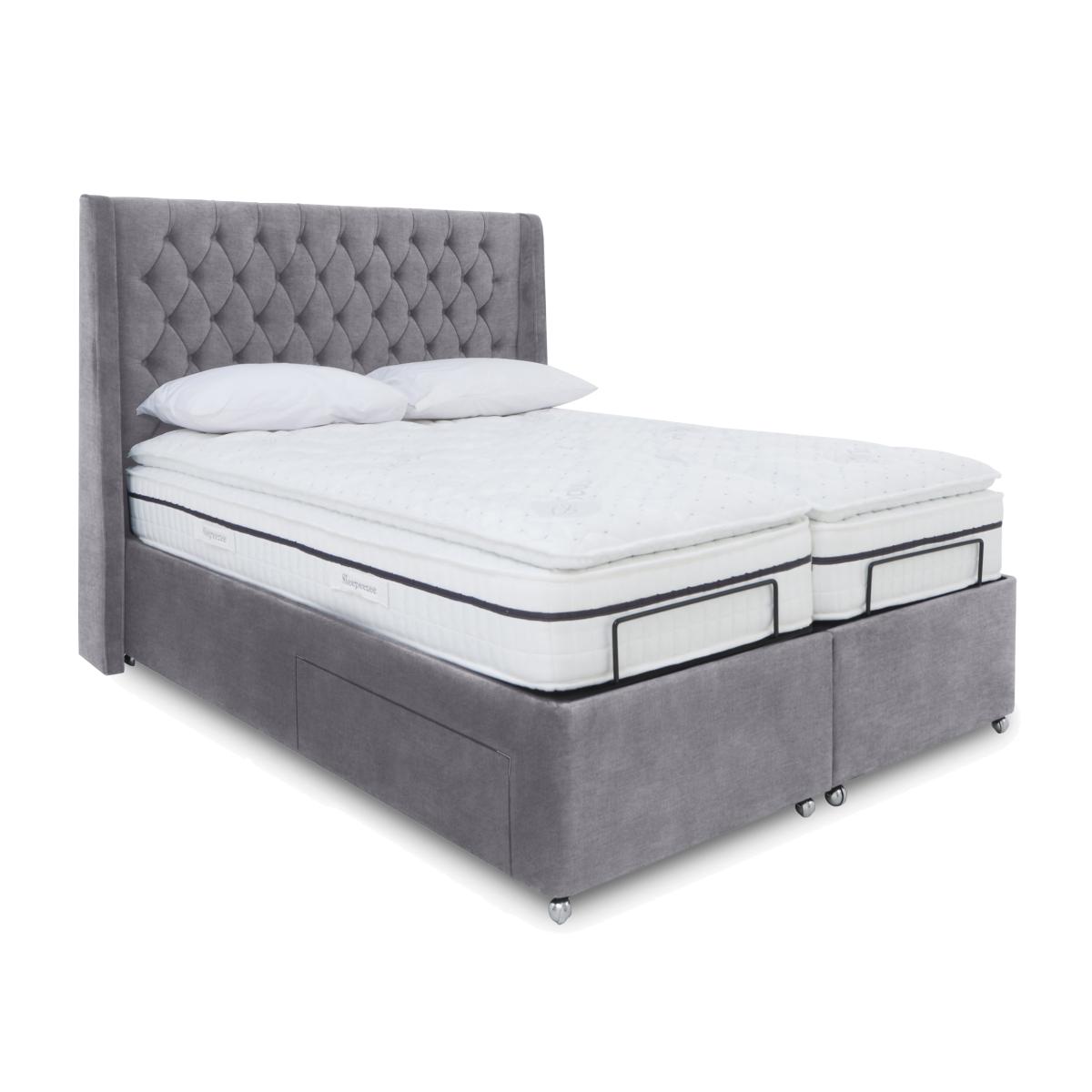 Statement bedroom style meets superb comfort in our Zen range of stunning adjustable divan bed bases. Each bed in the range comes complete with the most striking of headboards – tall, winged and with rows of buttoning for a glam twist on a classic look. Bases are electric powered and offer multi-position adjustability for complete comfort whether you’re sleeping or watching TV in bed. Zen divan bases come with optional drawers, ottoman storage and massage functionality and are available in a choice of sizes. The range also includes dual adjustable bases. Designed and handcrafted exclusively for Furniture Village, the Zen range is part of our E-Motion adjustable bed collection. This divan base looks fabulous – that tall and luxuriously buttoned headboard is a real showstopper – and it has a split base for two-person comfort control. Why you'll love it Find perfect comfort for better sleep with this dual-adjustable divan base. Includes our statement Zen headboard with traditional buttoning and winged sides. Dual base is electric powered for smooth and efficient movement. With 2 separate bed bases, you and your partner have individual control. A simple wireless handset makes this bed so easy to adjust. Use the handy memory function to quickly return to your favourite comfort position. There’s even a weightless-feel pre-set position for TV watching. This divan base promotes restorative sleep by minimising discomfort that might wake you up. Adjustable beds can also reduce back ache, improve blood circulation and reduce snoring. It’s ideal if you need a little help getting in and out of bed. An ethical choice – this divan base is made with FSC-sourced wood. With optional storage drawers in a range of configurations. In a wide selection of fashionable upholstery fabric options. Designed and handcrafted just for Furniture Village. Made in the UK. Also available with ultra-relaxing massage feature. This dual-adjustable divan base is part of our E-Motion range. What you need to know Mattress sold separately. To ensure bed base and mattress compatibility, consider a mattress from the E-Motion range. Please check the suitability of any mattress you are considering for this adjustable base. Available in king and super king sizes. Do not sit on this adjustable bed with the foot end in a raised position. Clean regularly using a soft brush or vacuum with the curtain attachment. Deal with any spills promptly. Professional cleaning advised for oil- and grease-based stains. Some fabrics can show wear on areas of more use or in direct sunlight. Shop our E-Motion range for a huge choice of bed frames, divan bases, massage beds, mattresses and more.