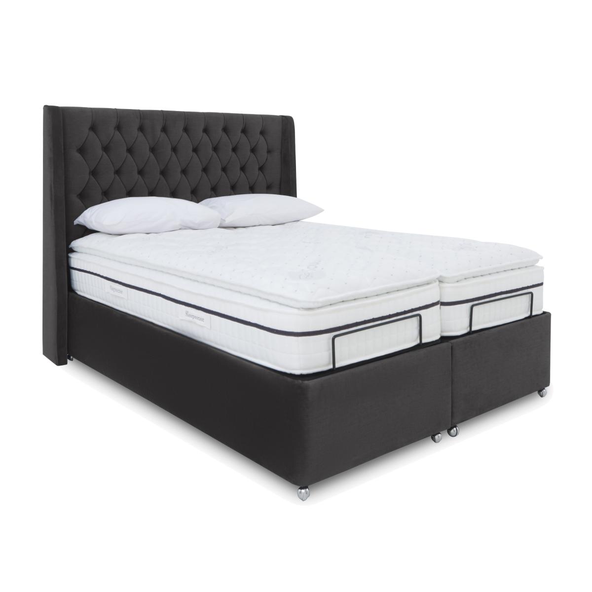 Statement bedroom style meets superb comfort in our Zen range of stunning adjustable divan bed bases. Each bed in the range comes complete with the most striking of headboards – tall, winged and with rows of buttoning for a glam twist on a classic look. Bases are electric powered and offer multi-position adjustability for complete comfort whether you’re sleeping or watching TV in bed. Zen divan bases come with optional drawers, ottoman storage and massage functionality and are available in a choice of sizes. The range also includes dual adjustable bases. Designed and handcrafted exclusively for Furniture Village, the Zen range is part of our E-Motion adjustable bed collection. Striking style meets perfect comfort in this dual-adjustable divan base. It even has massage functionality and generous underbed ottoman storage. Why you'll love it Find perfect comfort for better sleep with this dual-adjustable massage ottoman divan base with massage function. Includes our statement Zen headboard with traditional buttoning and winged sides. And you’ll love the roomy hidden storage compartment. Multi-setting massage function provides soothing relief for aching joints. Dual base is electric powered for smooth and efficient movement. With 2 separate bed bases, you and your partner have individual control. A simple wireless handset makes this bed so easy to adjust. Use the handy memory function to quickly return to your favourite comfort position. There’s even a weightless-feel pre-set position for TV watching. This divan base promotes restorative sleep by minimising discomfort that might wake you up. Adjustable beds can also reduce back ache, improve blood circulation and reduce snoring. It’s ideal if you need a little help getting in and out of bed. An ethical choice – this ottoman divan base is made with FSC-sourced wood. In a wide selection of fashionable upholstery fabric options. Designed and handcrafted just for Furniture Village. Made in the UK. This dual-adjustable massage ottoman divan base is part of our E-Motion range. What you need to know Mattress sold separately. To ensure bed base and mattress compatibility, consider a mattress from the E-Motion range. Please check the suitability of any mattress you are considering for this adjustable base. In king and super king sizes with dual control. Also available in single size. This ottoman divan base opens at the end. Maximum mattress weight is 40 kg for the single ottoman base and 80 kg for the king and super king ottoman bases. Please keep hands clear of the mechanism when opening and closing the ottoman. Do not sit on this adjustable bed with the foot end in a raised position. Clean regularly using a soft brush or vacuum with the curtain attachment. Deal with any spills promptly. Professional cleaning advised for oil- and grease-based stains. Some fabrics can show wear on areas of more use or in direct sunlight. Shop our E-Motion range for a huge choice of bed frames, divan bases, massage beds, mattresses and more.
