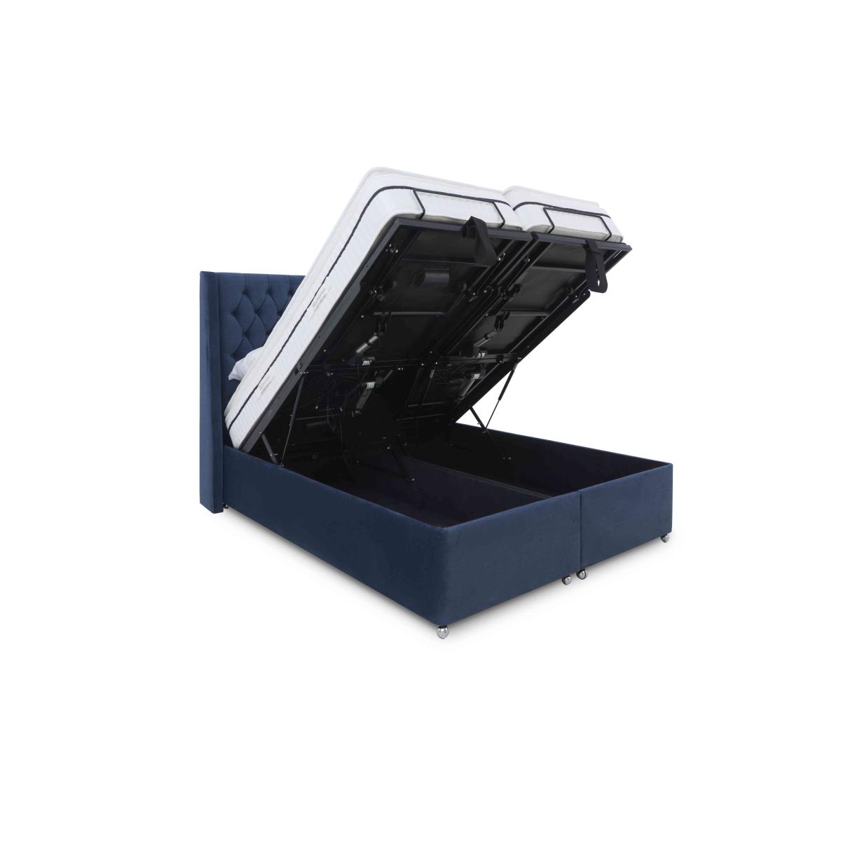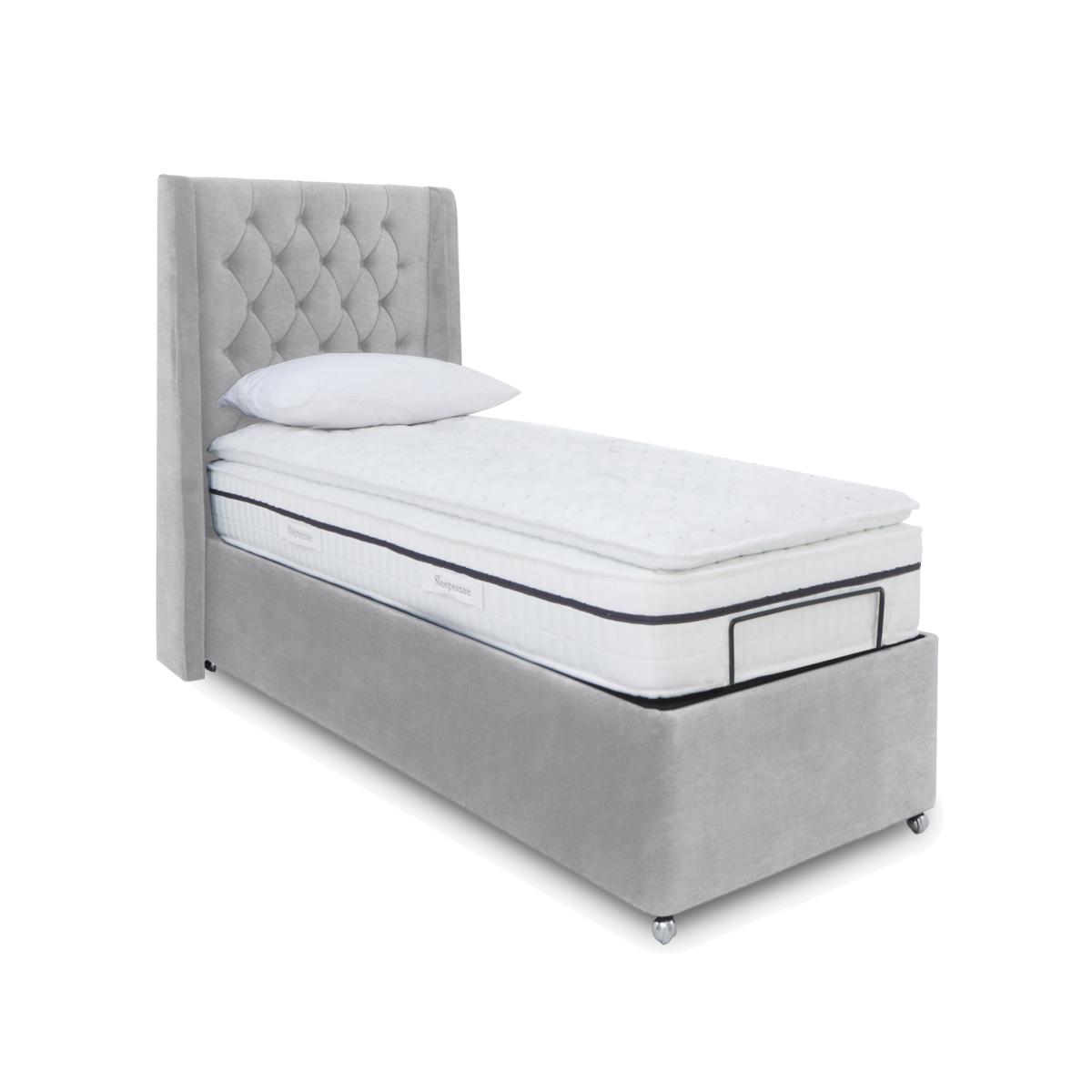 Statement bedroom style meets superb comfort in our Zen range of stunning adjustable divan bed bases. Each bed in the range comes complete with the most striking of headboards – tall, winged and with rows of buttoning for a glam twist on a classic look. Bases are electric powered and offer multi-position adjustability for complete comfort whether you’re sleeping or watching TV in bed. Zen divan bases come with optional drawers, ottoman storage and massage functionality and are available in a choice of sizes. The range also includes dual adjustable bases. Designed and handcrafted exclusively for Furniture Village, the Zen range is part of our E-Motion adjustable bed collection. Striking style meets perfect comfort in this dual-adjustable divan base. It even has massage functionality and generous underbed ottoman storage. Why you'll love it Find perfect comfort for better sleep with this dual-adjustable massage ottoman divan base with massage function. Includes our statement Zen headboard with traditional buttoning and winged sides. And you’ll love the roomy hidden storage compartment. Multi-setting massage function provides soothing relief for aching joints. Dual base is electric powered for smooth and efficient movement. With 2 separate bed bases, you and your partner have individual control. A simple wireless handset makes this bed so easy to adjust. Use the handy memory function to quickly return to your favourite comfort position. There’s even a weightless-feel pre-set position for TV watching. This divan base promotes restorative sleep by minimising discomfort that might wake you up. Adjustable beds can also reduce back ache, improve blood circulation and reduce snoring. It’s ideal if you need a little help getting in and out of bed. An ethical choice – this ottoman divan base is made with FSC-sourced wood. In a wide selection of fashionable upholstery fabric options. Designed and handcrafted just for Furniture Village. Made in the UK. This dual-adjustable massage ottoman divan base is part of our E-Motion range. What you need to know Mattress sold separately. To ensure bed base and mattress compatibility, consider a mattress from the E-Motion range. Please check the suitability of any mattress you are considering for this adjustable base. In king and super king sizes with dual control. Also available in single size. This ottoman divan base opens at the end. Maximum mattress weight is 40 kg for the single ottoman base and 80 kg for the king and super king ottoman bases. Please keep hands clear of the mechanism when opening and closing the ottoman. Do not sit on this adjustable bed with the foot end in a raised position. Clean regularly using a soft brush or vacuum with the curtain attachment. Deal with any spills promptly. Professional cleaning advised for oil- and grease-based stains. Some fabrics can show wear on areas of more use or in direct sunlight. Shop our E-Motion range for a huge choice of bed frames, divan bases, massage beds, mattresses and more.