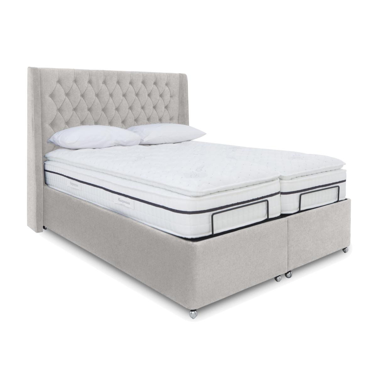 Statement bedroom style meets superb comfort in our Zen range of stunning adjustable divan bed bases. Each bed in the range comes complete with the most striking of headboards – tall, winged and with rows of buttoning for a glam twist on a classic look. Bases are electric powered and offer multi-position adjustability for complete comfort whether you’re sleeping or watching TV in bed. Zen divan bases come with optional drawers, ottoman storage and massage functionality and are available in a choice of sizes. The range also includes dual adjustable bases. Designed and handcrafted exclusively for Furniture Village, the Zen range is part of our E-Motion adjustable bed collection. Striking style meets perfect comfort in this dual-adjustable divan base. It even has massage functionality and generous underbed ottoman storage. Why you'll love it Find perfect comfort for better sleep with this dual-adjustable massage ottoman divan base with massage function. Includes our statement Zen headboard with traditional buttoning and winged sides. And you’ll love the roomy hidden storage compartment. Multi-setting massage function provides soothing relief for aching joints. Dual base is electric powered for smooth and efficient movement. With 2 separate bed bases, you and your partner have individual control. A simple wireless handset makes this bed so easy to adjust. Use the handy memory function to quickly return to your favourite comfort position. There’s even a weightless-feel pre-set position for TV watching. This divan base promotes restorative sleep by minimising discomfort that might wake you up. Adjustable beds can also reduce back ache, improve blood circulation and reduce snoring. It’s ideal if you need a little help getting in and out of bed. An ethical choice – this ottoman divan base is made with FSC-sourced wood. In a wide selection of fashionable upholstery fabric options. Designed and handcrafted just for Furniture Village. Made in the UK. This dual-adjustable massage ottoman divan base is part of our E-Motion range. What you need to know Mattress sold separately. To ensure bed base and mattress compatibility, consider a mattress from the E-Motion range. Please check the suitability of any mattress you are considering for this adjustable base. In king and super king sizes with dual control. Also available in single size. This ottoman divan base opens at the end. Maximum mattress weight is 40 kg for the single ottoman base and 80 kg for the king and super king ottoman bases. Please keep hands clear of the mechanism when opening and closing the ottoman. Do not sit on this adjustable bed with the foot end in a raised position. Clean regularly using a soft brush or vacuum with the curtain attachment. Deal with any spills promptly. Professional cleaning advised for oil- and grease-based stains. Some fabrics can show wear on areas of more use or in direct sunlight. Shop our E-Motion range for a huge choice of bed frames, divan bases, massage beds, mattresses and more.