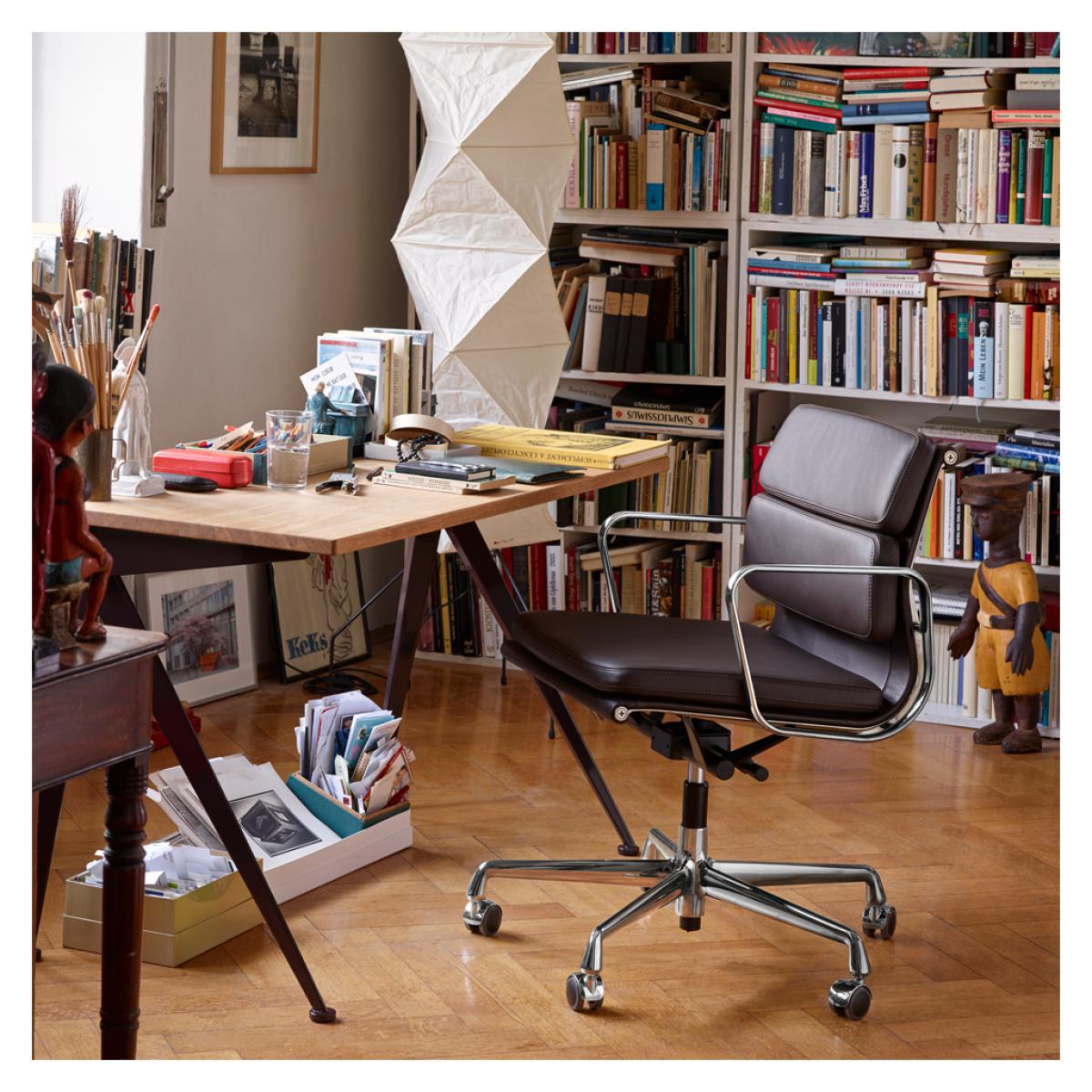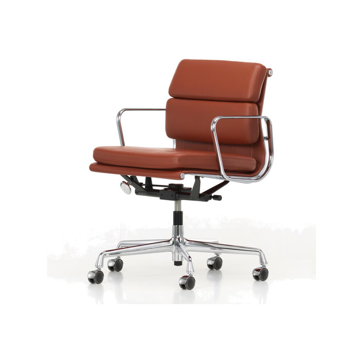 Offering superb comfort, the EA217 Soft Pad Office Chair is a decadent seating solution for any modern workspace, designed by Charles and Ray Eames in 1969.Part of the iconic Eames Soft Pad Group, this EA217 Office Chair is one of the office chairs that makes up this range, originally designed by Charles and Ray Eames in 1969. With similar frame styles to the Eames Aluminium Group, the Eames Soft Pad Group is defined by its sewn-on cushions that create a supple and luxurious contrast to the clean-lined silhouette of the base. Upholstered in premium leather in an array of colours, the Eames EA217 chair is covered with soft, smooth aniline cowhide that showcases a flat grain, dyed-through for colour and lightly pigmented for a high-quality finish. Characterised by a curved backrest for added comfort, the Eames EA217 chair swivels for simple manoeuvring and has a specifically designed tilt mechanism that can be adjusted to the weight of the user for optimum comfort.