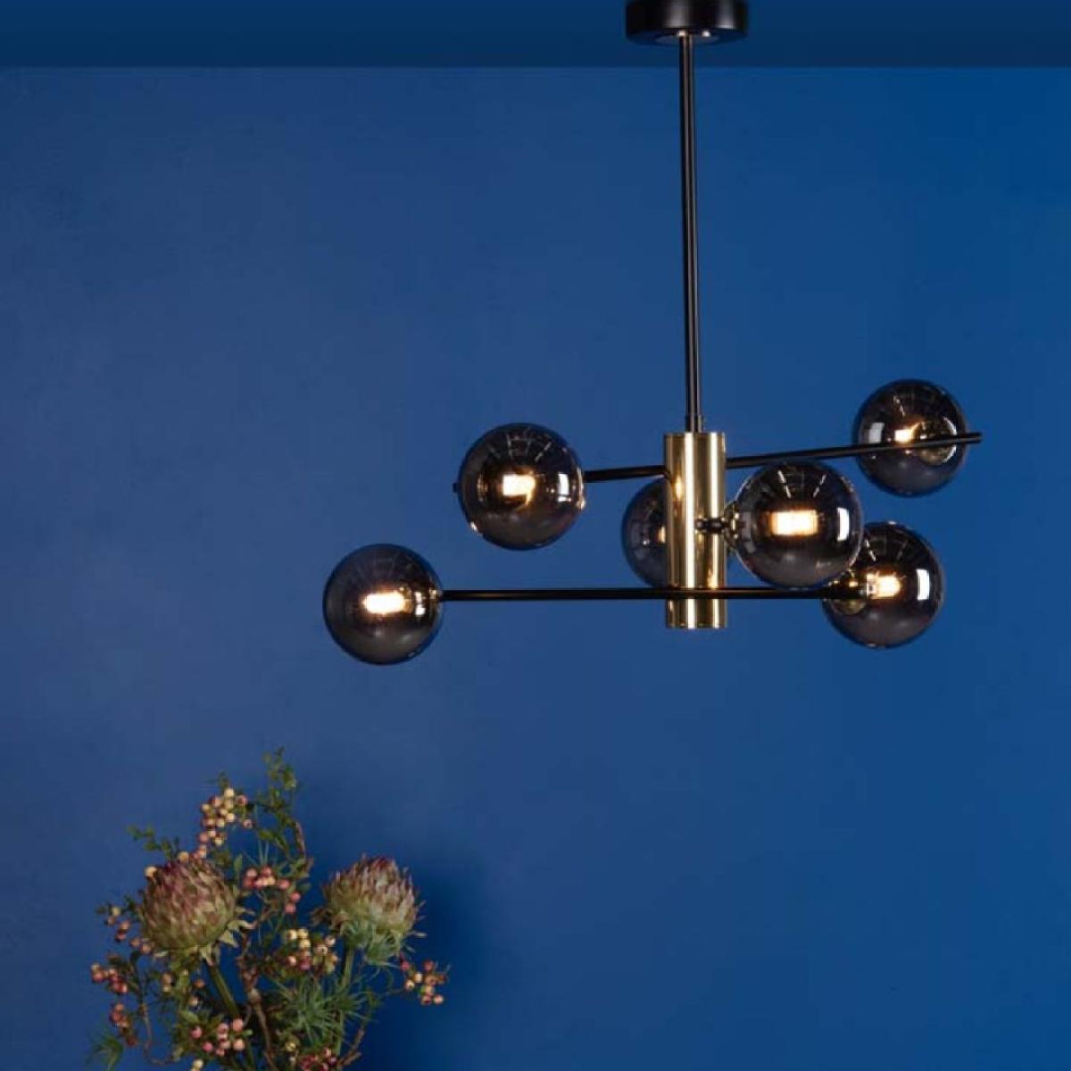 This six-light semi-flush fitting is a sleek and modern choice for contemporary interiors, especially those with a touch of industrial or minimalist style. I love how the black finish adds a bold, grounded look, while the smoked glass shades introduce a subtle hint of sophistication and diffused lighting. It works particularly well in spacious living rooms, dining areas, or even bedchambers where statement lighting is desired without overwhelming the space. For styling tips, consider pairing it with matte black fixtures or brass accents for a cohesive look, and hang it at a height that ensures the glass shades are well positioned to cast soft, even light across the room. Its versatile design makes it easy to adapt into various colour schemes, from monochrome palettes to warmer, earthy tones.