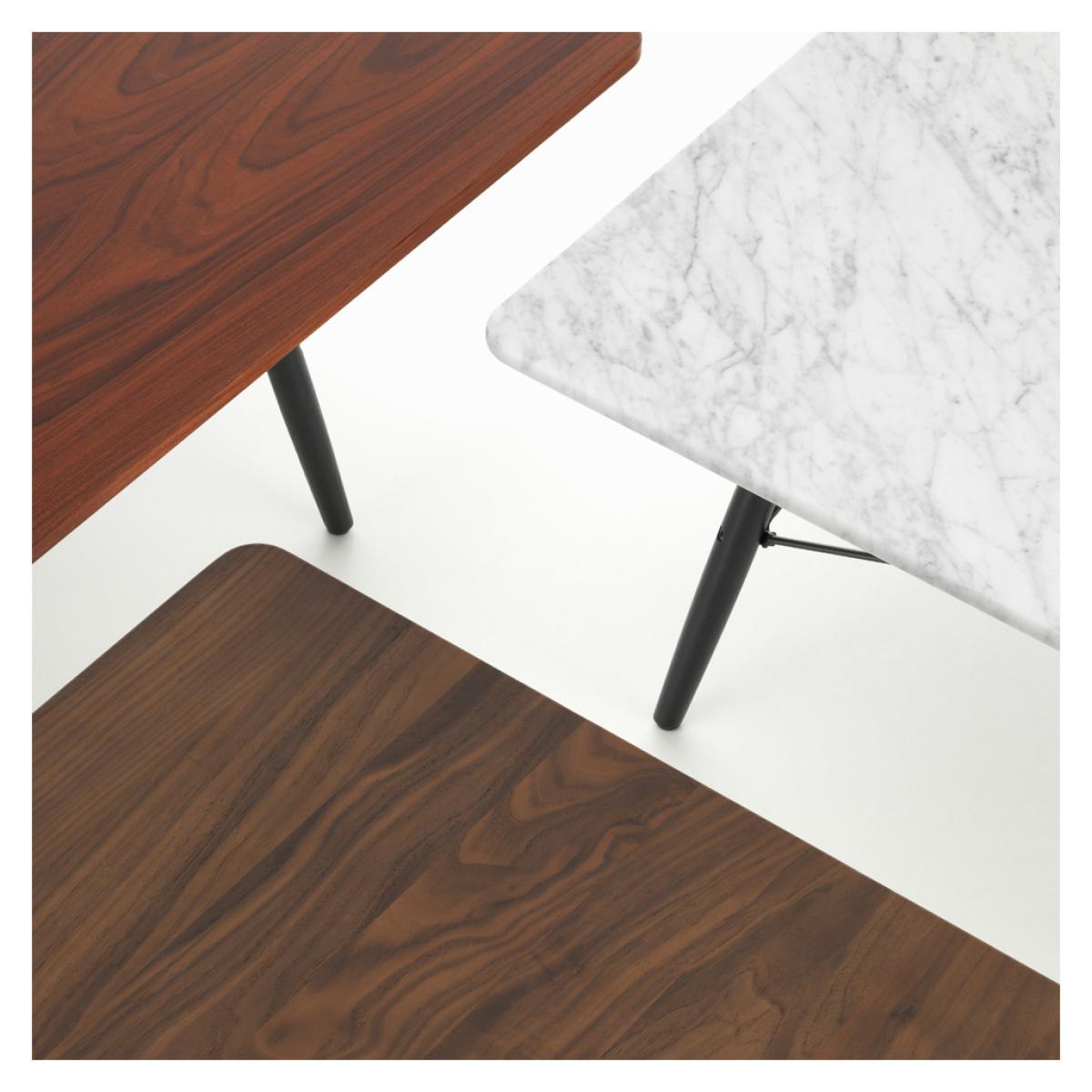 Originally designed in 1949 by Charles and Ray Eames and re-released by Vitra, the Eames Coffee Table in black ash and walnut has added to the iconic interior of the design duo's Los Angeles home to this day. Defined by a black ash wood base with steel cross-struts reminiscent of the Eames Plastic Chairs, the rectangular Eames Coffee Table is both simple and elegant, crafted from rich walnut wood. This re-edition of the original Eames Coffee Table design has been developed by Vitra in cooperation with the Eames Office, manufactured using exquisite materials to evoke the spirit of the original one-off Eames design.