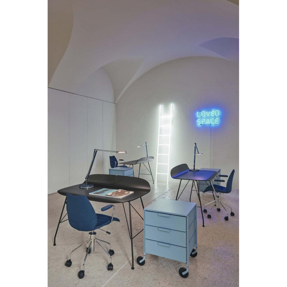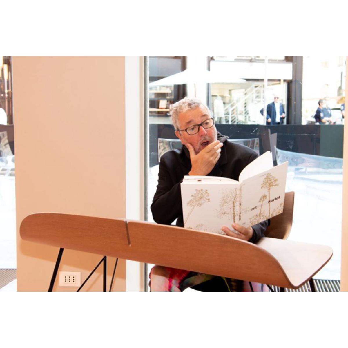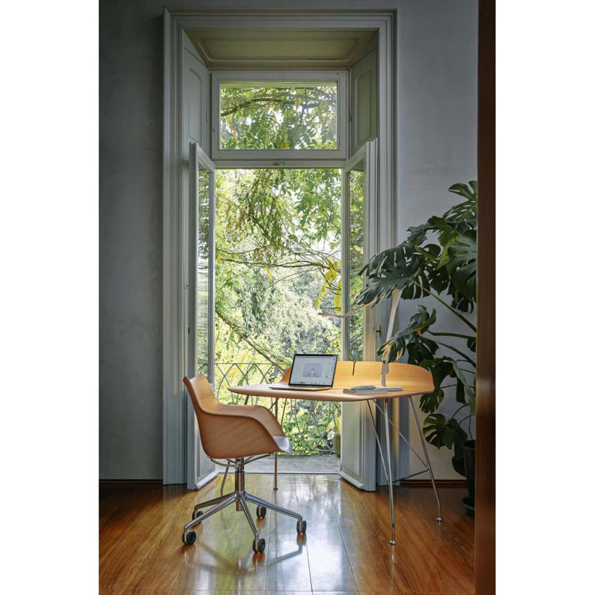 The poetry of wood combined with technology. The Smart Wood family is growing with the arrival of the Earl of Wood desk, which brings together a steel wire base and a thin curved wood tabletop, creating a delicate contour. Using a unique and patented technique, the wood is moulded to create a thin tabletop with sinuous features. This essential design desk is perfect for both homes and offices. The tabletop is curved at the lower and upper edges, providing great freedom of movement. With the Smart Wood collection, Kartell and Philippe Starck rise to a new challenge: working wood with the same fluidity as composite materials to give it a new look, full of finesse and curves. The major figures Ray and Charles Eames were the first to experiment with moulding plywood into complex shapes. More than 50 years later, technological advances have allowed Kartell to offer even more with less. This feat was made possible thanks to unique patented 3D technology that produces wood curvature in extreme proportions. The moulded wood adopts incredible, sinuous lines. Breaking ground in a new chapter in the brand's history, the Smart Wood collection is the result of an ecological commitment and constant searching for innovation. To reduce the cutting down of trees, the tabletop uses very little material: just wood residues. It’s made from wood nano-shavings glued into nano-layers which are then laminated. Then, using machines that cut the wood in line, the wood takes on the appearance of a kind of fabric that can be deformed. For 10 to 15 minutes, the wood, now soft as silk, can be moulded. As it dries, it stiffens and returns to the texture of wood. Claudio Luti, president of Kartell, explains: "After years of research, we managed to work the wood while respecting the nobility of the material. Innovative technology has allowed us to stay true to the industrial characteristics of Kartell's DNA. We thus managed to wholly express the real essence of wood by combining industrial production with beauty, solidity, comfort and flexibility, all in one product. ".