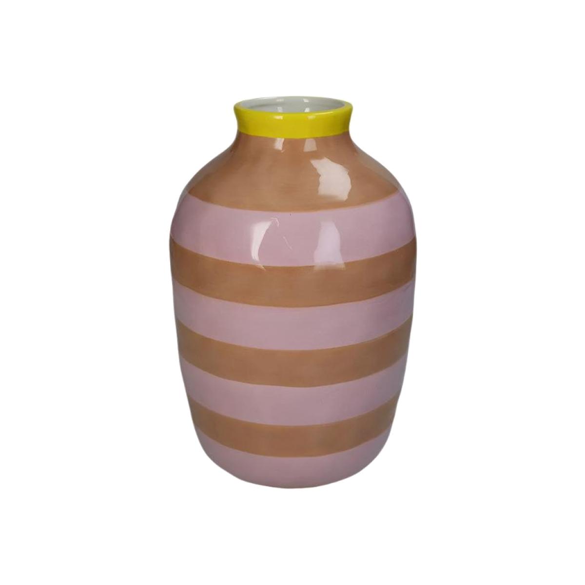 I love this piece because of its playful yet sophisticated colour palette and pattern. The stripes lend a fresh, modern feel that works well in both contemporary and eclectic interiors. The clay and pink tones are versatile; they add warmth when styled with dried grasses or cosy florals and can also brighten up a neutral scheme. A practical styling tip is to use it as a standalone statement, showing off its pattern and colours, or to pair with similarly hued vases and accessories for a curated look. It’s ideal for tabletop or shelf displays, bringing a pop of colour without overwhelming the space.
