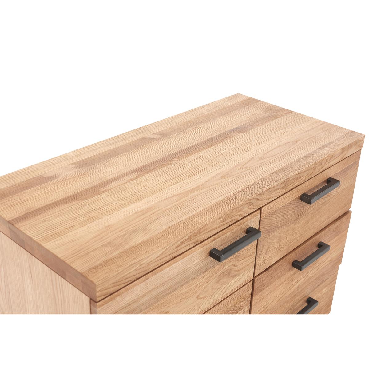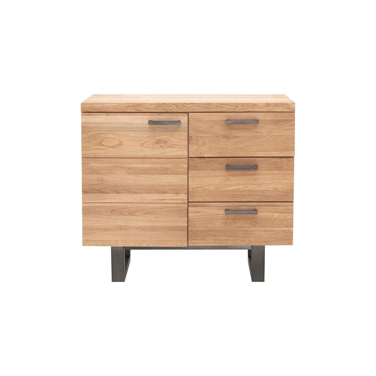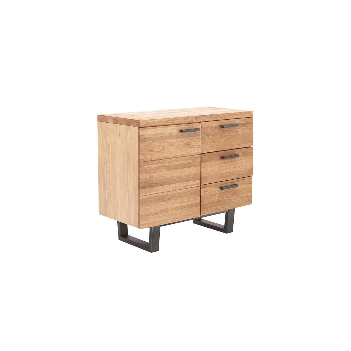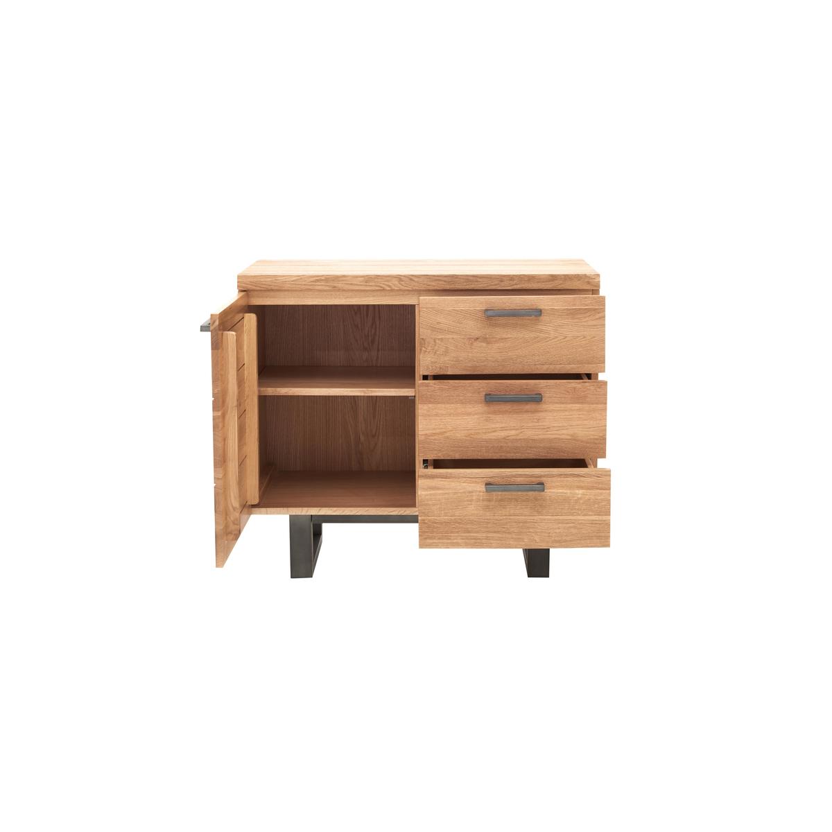 Modern, versatile and excellent value, Earth combines solid oak and oak veneer surfaces with powder-coated steel legs in a collection of beautifully-crafted industrial-style furniture. Dining tables are available in two sizes and optional extension leaves create a huge range of size possibilities. Choose either an upholstered retro-style dining chair or practical bench seating – or mix and match the two for a comfortable and contemporary look. Complete your dining room with a choice of sideboards and continue this on trend theme in the living room with useful shelving and stylish occasional pieces. Versatile storage at a great value price, the Earth 1 door 3 drawer sideboard is the perfect way to bring cool, contemporary industrial style to your home. The door of the single cupboard has a planked appearance that mirrors the edges of the three drawers. Both the cupboard door and the drawers have metal handles, and the cupboard has a shelf. Exceptionally well crafted from solid oak and oak veneer and with striking U-shaped grey powder-coated steel legs, this piece has plenty of room for plates and glasses as well as cutlery and table linens. The Earth 1 door 3 drawer sideboard is part of the extensive Earth collection of dining room furniture, and versatile storage and occasional pieces like the Earth lamp table and the Earth ladder shelving unit. WARNING!. Furniture can tip over unexpectedly and cause injury. This item shall be fixed to a wall using the anti-tip kit provided with the furniture. Be sure to use the correct wall fixings suitable for the walls in your home. Did you know?. Because oak is natural with characterful knots and markings, every Earth sideboardis unique.