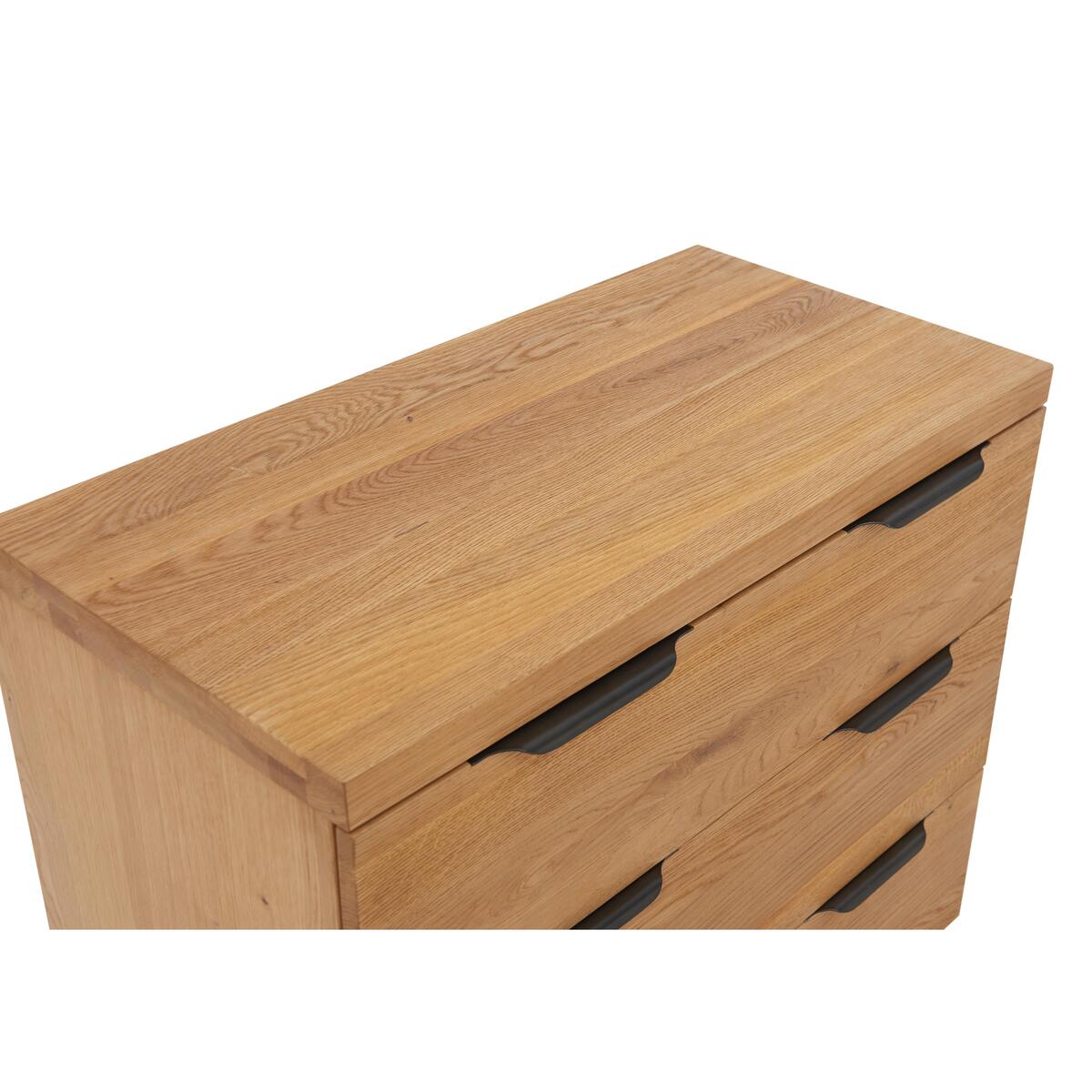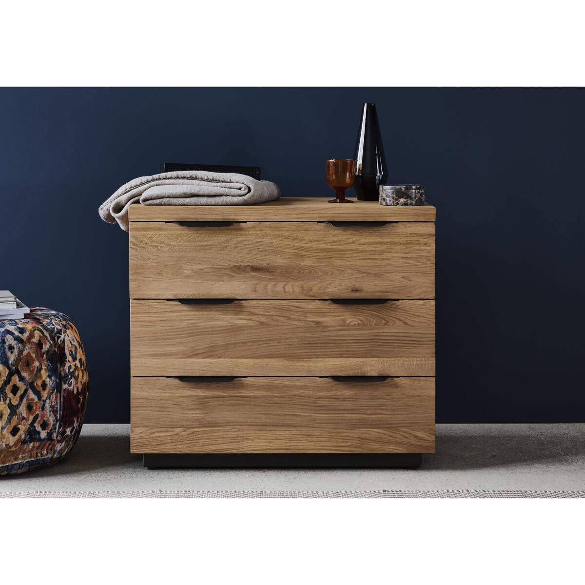 Bring the popular industrial look to your bedroom with the stylish and very functional Earth bedroom range. Part of the wider Earth living and dining furniture collection, this range offers a wide choice of bedroom pieces beautifully crafted from oak and oak veneer and featuring dark grey powder-coated metal details. The perfect blend of rustic and modern style, this range of wardrobes, bedframe, chests of drawers and more showcases sturdy construction, cool urban details and useful storage spaces. On trend contemporary design at a great-value price. Rustic meets modern in this cool industrial-style range. High-quality craftsmanship in oak, oak veneer and metal. Practical, stylish and great value for money. The beauty of natural wood combined with a cool and contemporary industrial aesthetic – the fabulous Earth 3 drawer chest perfectly blends rustic and modern design flair. Beautifully crafted from solid oak and oak veneer, this chest of drawers has spacious drawers yet won’t overwhelm a smaller room thanks to its neat proportions. It’s finished with dark grey metal drawer pulls and rests on a dark grey powder-coated metal plinth. Offering great value for money, the Earth 3 drawer chest is part of the extensive and very popular Earth collection of bedroom, living room and dining room furniture. This stylish bedroom furniture range includes wardrobes, a bedframe and a dressing table, as well as a wide selection of chests of drawers for every size of bedroom. For a more compact room, take a look at the space-saving Earth 5 drawer narrow chest. WARNING!. Furniture can tip over unexpectedly and cause injury. This item shall be fixed to a wall using the anti-tip kit provided with the furniture. Be sure to use the correct wall fixings suitable for the walls in your home. Did you know?. Because oak is natural with characterful knots and markings, every piece in the Earth bedroom collection is unique.