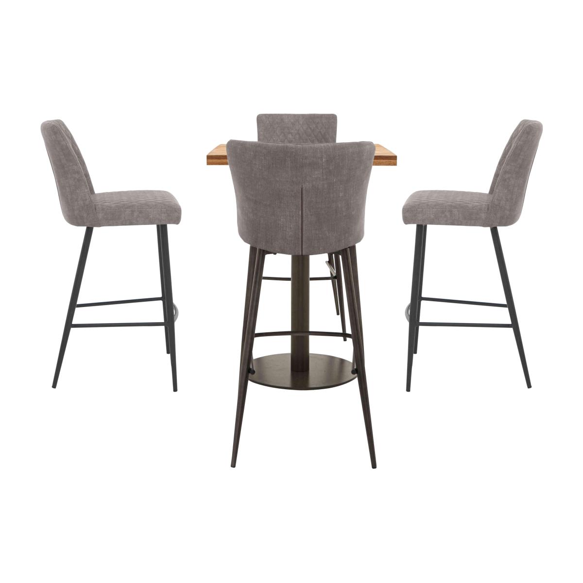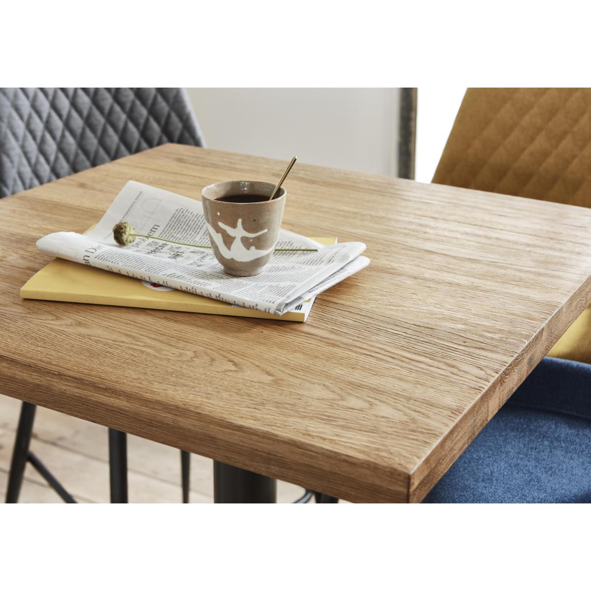 Modern, versatile and excellent value, Earth combines solid oak and oak veneer surfaces with powder-coated steel legs in a collection of beautifully-crafted industrial-style furniture. Dining tables are available in two sizes and optional extension leaves create a huge range of size possibilities. Choose either an upholstered retro-style dining chair or practical bench seating – or mix and match the two for a comfortable and contemporary look. Complete your dining room with a choice of sideboards and continue this on trend theme in the living room with useful shelving and stylish occasional pieces. Small space dining? Here’s your dining set. This very well-priced square bar table with four contemporary bar stools makes it easy to entertain even in a compact room. Why you'll love it. Great-value bar table set for 4 is the perfect size for modern homes. Cool and characterful industrial style. Square bar table has a solid oak top. Grey powder-coated steel pedestal base. Set includes 4 high-back cushioned bar stools. Upholstered in soft faux leather with quilted-effect stitching. Choose graphite or platinum upholstery. Grey powder-coated metal legs with footrest. Because it’s made from real oak, every Earth bar table set is unique. This bar table set for 4 is part of the Earth dining furniture range. What you need to know. Bar table seats 4. Bar stool seat cushioning is made of foam. As oak is a natural material, knots and markings are to be expected. Avoid placing in direct sunlight, and take care to use coasters and placemats.