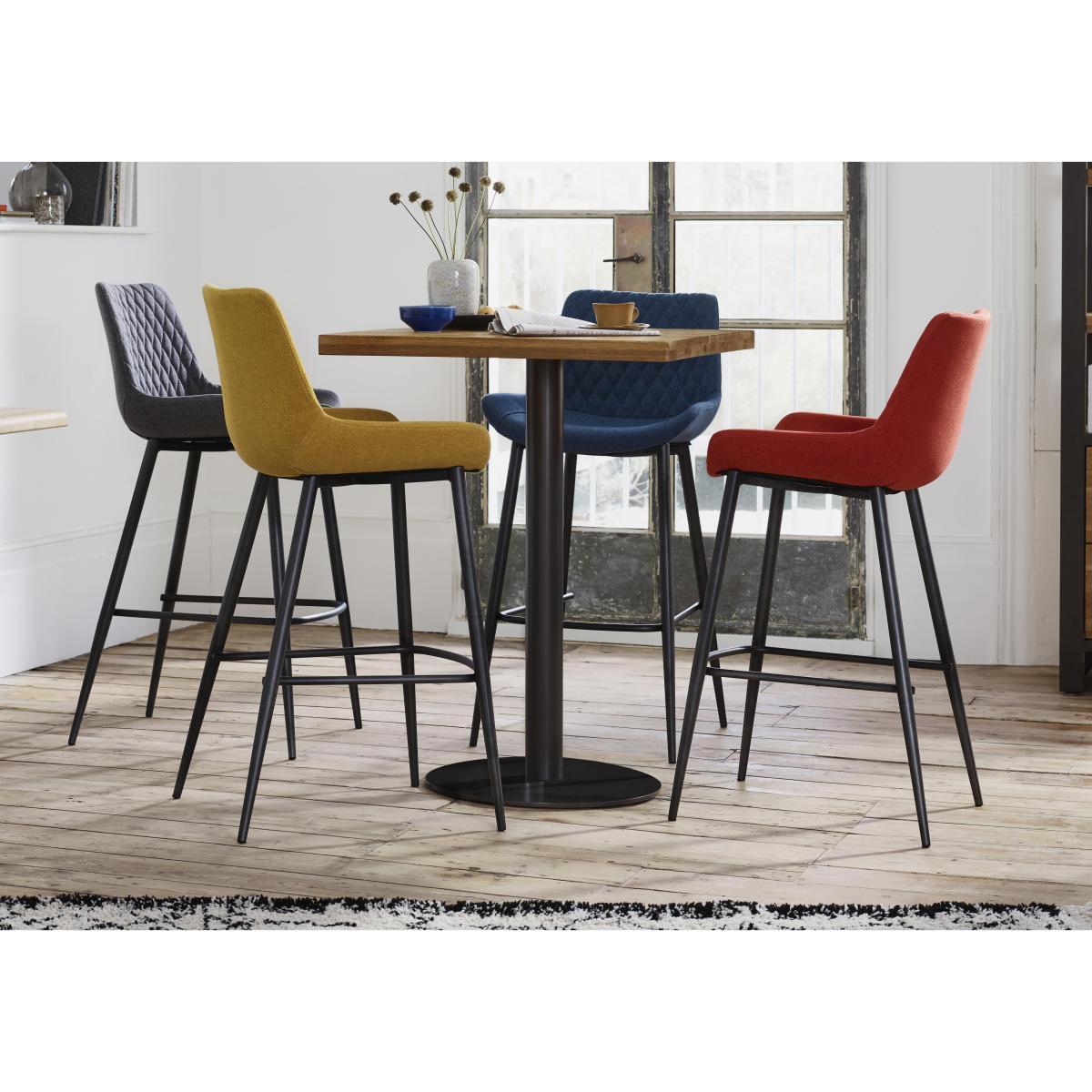 Modern, versatile and excellent value, Earth combines solid oak and oak veneer surfaces with powder-coated steel legs in a collection of beautifully-crafted industrial-style furniture. Dining tables are available in two sizes and optional extension leaves create a huge range of size possibilities. Choose either an upholstered retro-style dining chair or practical bench seating – or mix and match the two for a comfortable and contemporary look. Complete your dining room with a choice of sideboards and continue this on trend theme in the living room with useful shelving and stylish occasional pieces. Great-value on trend industrial style for contemporary homes. Compact table has solid oak top and grey powder-coated steel base. With 4 low-back retro bar stools in a choice of bold colours. Offering style, craftsmanship and a fantastic place to socialise with friends or family – even in a compact dining area – the Earth bar table and 4 Rocket bar stools dining set could well be your ideal dining set. The on trend Earth bar table is perfectly proportioned for smaller homes yet offers fantastic contemporary style thanks to its solid oak top and industrial-style grey powder-coated steel pedestal base with circular footplate. The accompanying four Rocket bar stools are guaranteed to turn even a quick meal into a dining event. Comfortably padded, they're upholstered in a choice of modern brights or sophisticated grey. The upholstery has diamond-patterned quilting on the inside backs and feature stitching on the seats. And if you love retro style, these bar stools are definitely for you. The low backs, curved seats and slender metal legs with footrests bring charm and style to any dining room. Part of the great-value Earth living and dining room furniture collection at Furniture Village, the Earth bar table and 4 Rocket bar stools set is one of several bar and dining table sets in the range. Did you know?. Because oak is natural with characterful knots and markings, every piece in the Earth collection is unique.