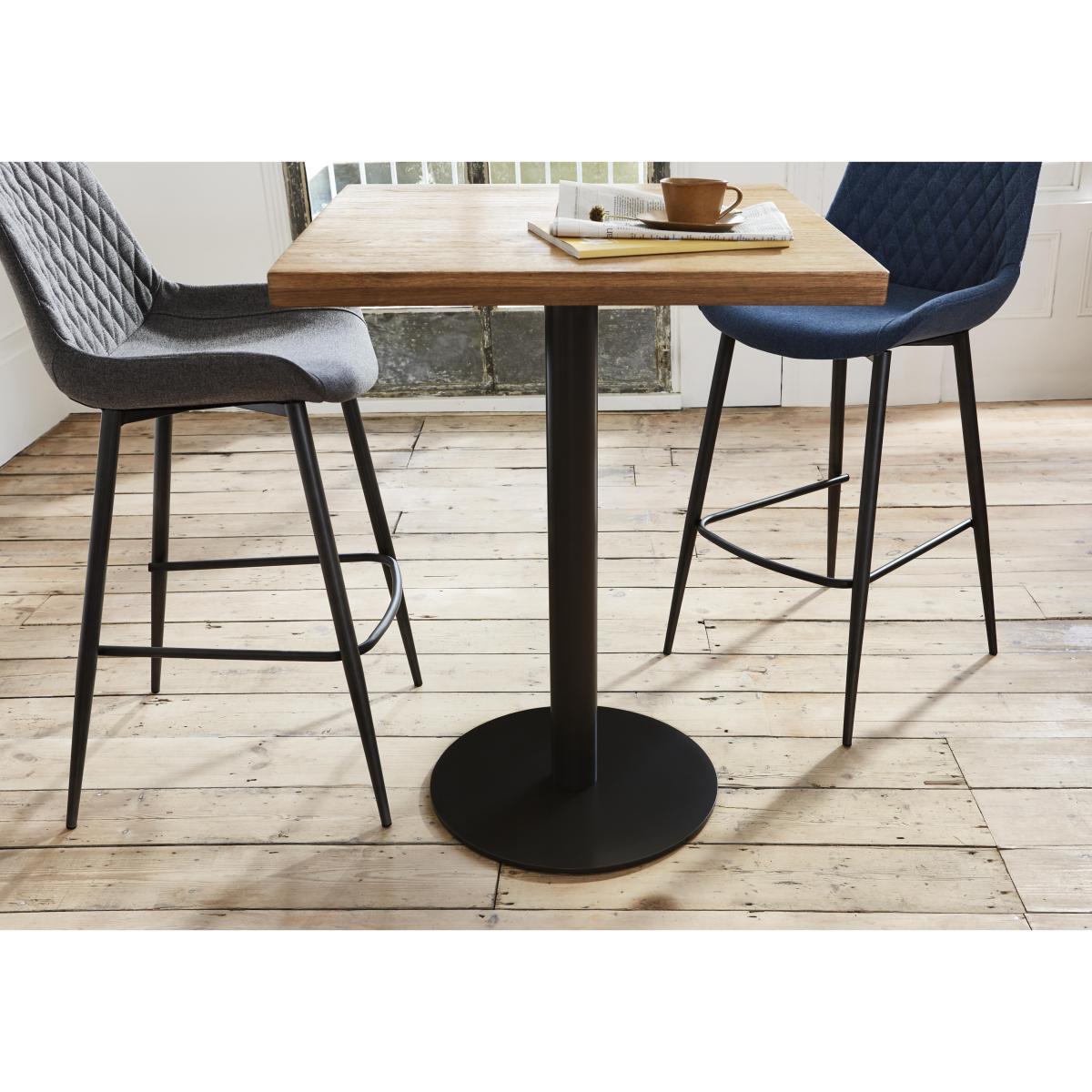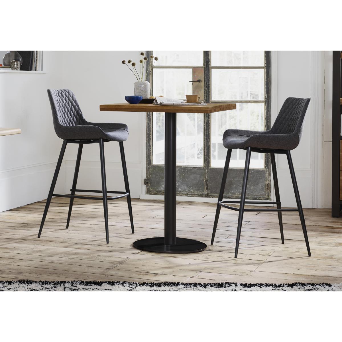 Modern, versatile and excellent value, Earth combines solid oak and oak veneer surfaces with powder-coated steel legs in a collection of beautifully-crafted industrial-style furniture. Dining tables are available in two sizes and optional extension leaves create a huge range of size possibilities. Choose either an upholstered retro-style dining chair or practical bench seating – or mix and match the two for a comfortable and contemporary look. Complete your dining room with a choice of sideboards and continue this on trend theme in the living room with useful shelving and stylish occasional pieces. Great-value on trend industrial style for contemporary homes. Solid oak tops with grey powder-coated steel base. Exceptional quality, wonderful craftsmanship. Casual dining can be stylish dining – especially if you choose the fantastic Earth bar table. With its solid oak square top and pedestal base with circular footplate made of grey powder-coated steel, this table perfectly channels a well-crafted version of cool industrial style. It’s the perfect piece for an urban-look kitchen or kitchen diner, especially if space is in short supply, as its seats four in comfort while occupying a surprisingly minimal amount of floor space. The Earth bar table is part of the extensive Earth furniture collection which comprises a wide choice of dining tables, dining chairs and dining sets as well as cool pieces for living rooms and dining rooms like a bookcase with drawers, coffee tables and a TV unit. Everything is beautifully made from high-quality materials and so very well priced. The Earth bar table is also available with either two or four Rocket bar stools designed to add a touch of retro charm along with a bold splash of colour. Did you know?. Because oak is natural with characterful knots and markings, every piece in the Earth collection is unique.