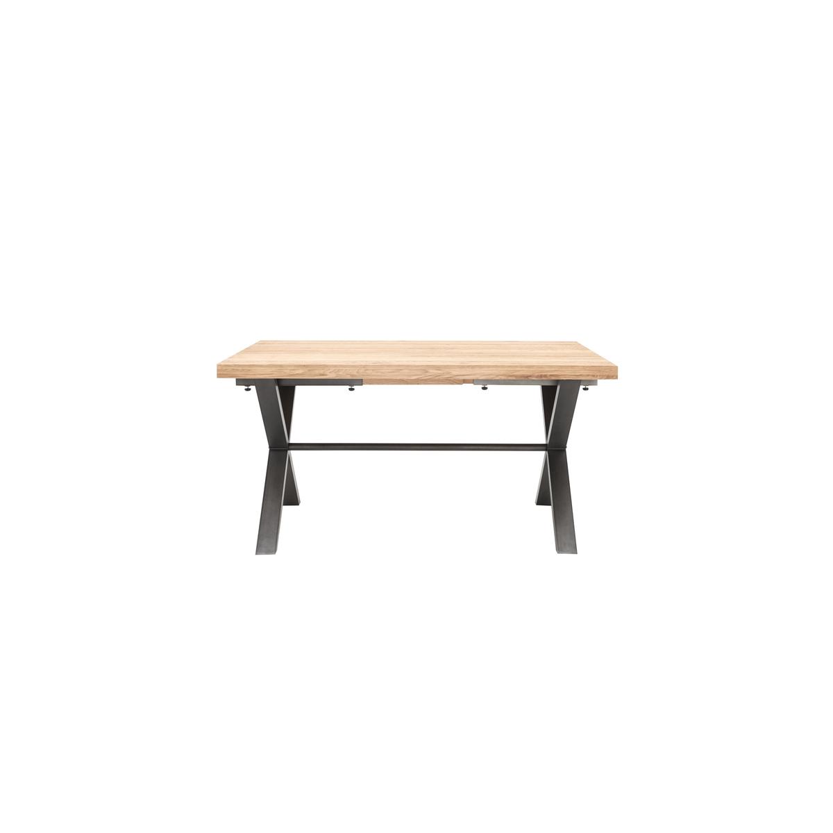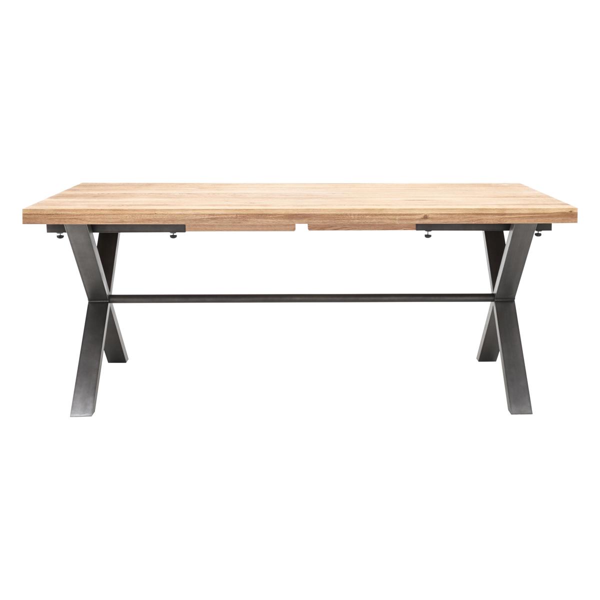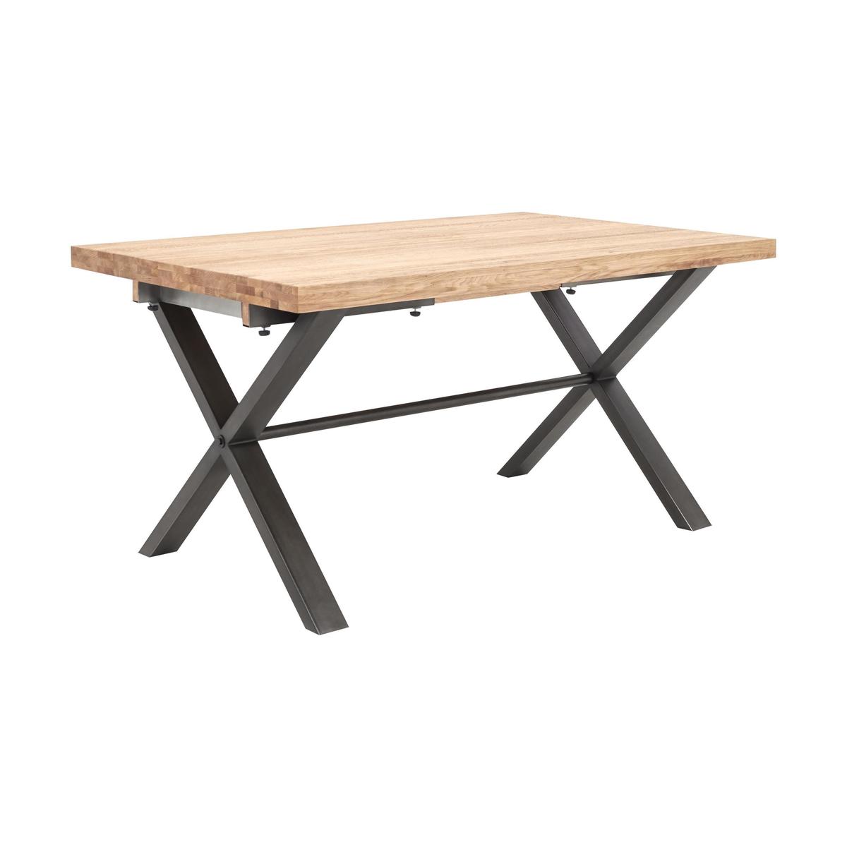 Here’s the ultimate industrial dining table. With its solid rustic oak top and grey metal legs, it’s sturdy and stylish and perfect for family dining as well as grownup gatherings. Why you'll love it This striking extendable dining table showcases on- trend urban design. Cool industrial style at a great- value price. Because it’s made from solid natural oak, every Earth dining table is unique. Rustic wire- brushed and oiled finish. X- shaped legs in grey powder- coated metal. In 2 family- friendly sizes. It’s easy to extend this table with extra leaves, available separately. This extendable dining table is part of the Earth range. What you need to know 150 cm table seats 6 unextended. 190 cm table seats 8 unextended. Accommodates up to 2 extension leaves which slide onto the ends. Each extension leaf allows you to seat 2 more people. Extension leaf woodgrain does not run in the same direction as table top woodgrain. As oak is a natural material, knots and markings are to be expected. Avoid placing in direct sunlight, and take care to use coasters and placemats. To preserve the finish, apply an invisible buffing wax every six months.