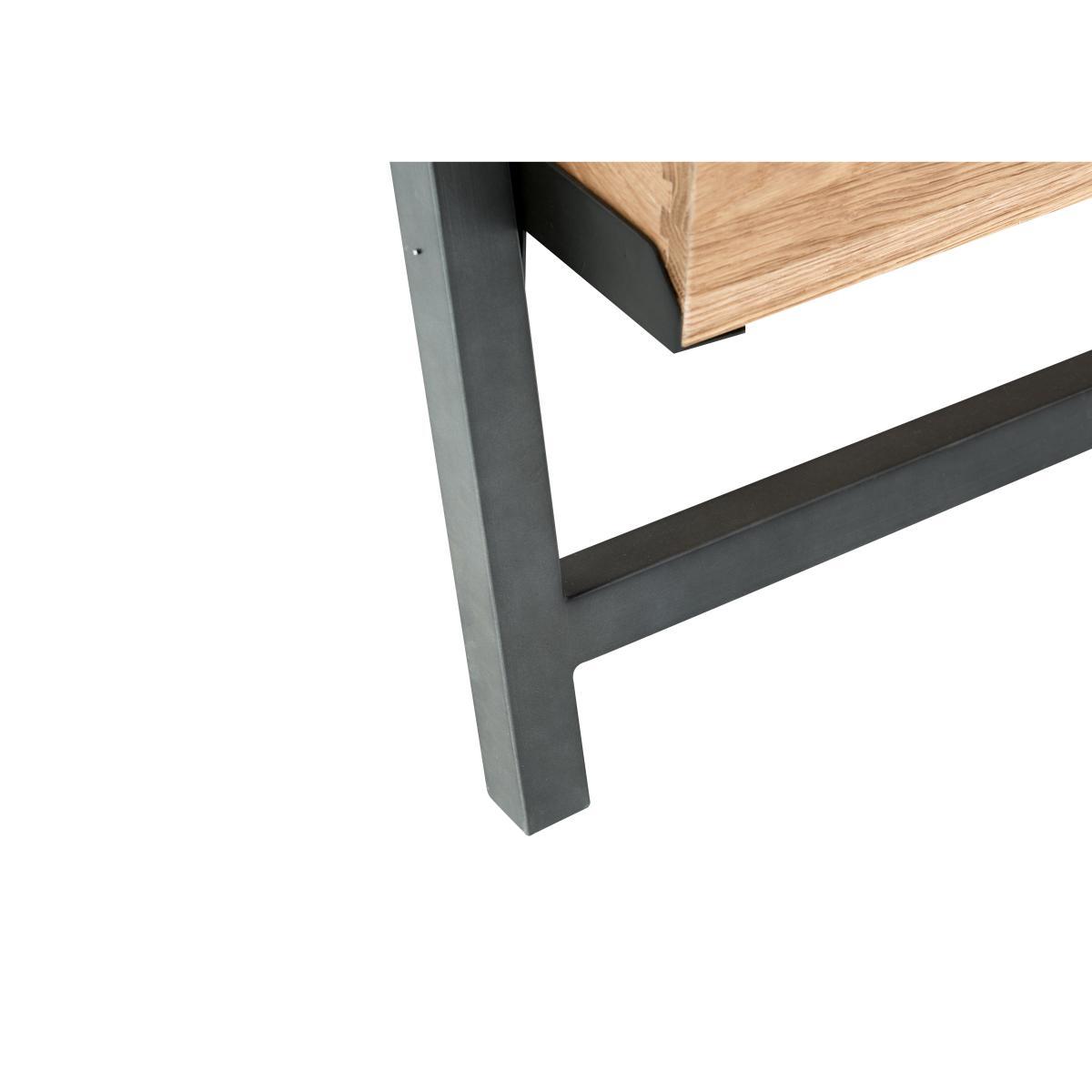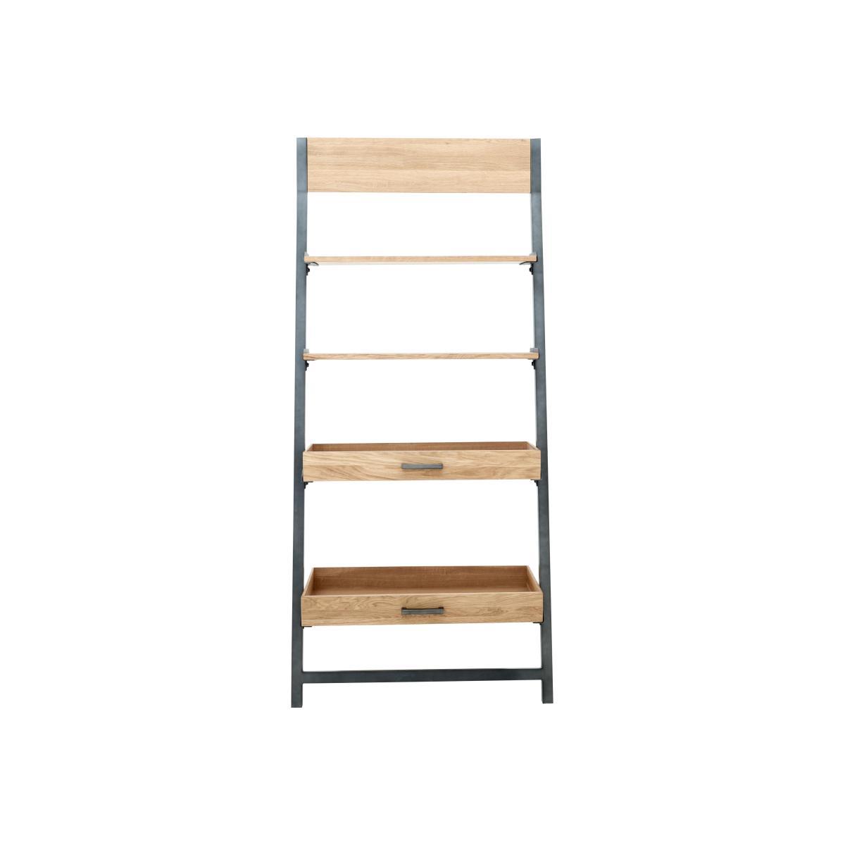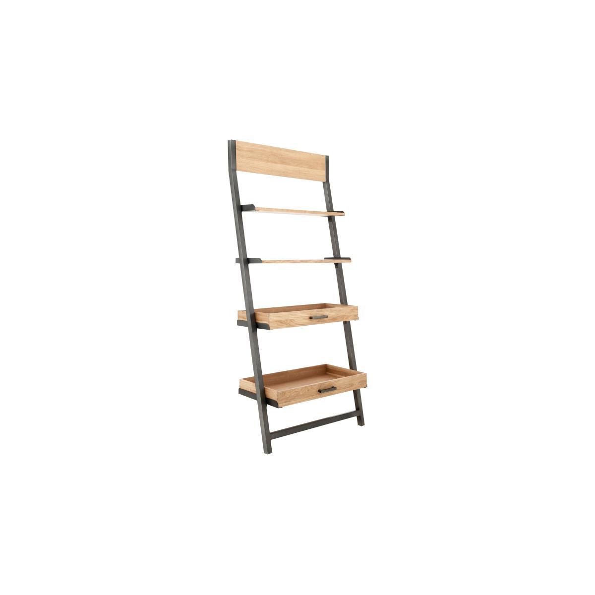Modern, versatile and excellent value, Earth combines solid oak and oak veneer surfaces with powder-coated steel legs in a collection of beautifully-crafted industrial-style furniture. Dining tables are available in two sizes and optional extension leaves create a huge range of size possibilities. Choose either an upholstered retro-style dining chair or practical bench seating – or mix and match the two for a comfortable and contemporary look. Complete your dining room with a choice of sideboards and continue this on trend theme in the living room with useful shelving and stylish occasional pieces. A striking shelving arrangement with a modern industrial aesthetic, the Earth ladder shelving unit is a simple way to bring creative contemporary style to your living or dining room. Designed to lean against a wall, this shelving unit is framed with powder-coated steel in grey, and has four fixed shelves made of solid oak. The two lower shelves have a shallow surround, providing safe display space for more fragile objects, and the piece is finished with a broad oak top rail, a stylish finishing touch. The well-crafted and great value Earth ladder shelving unit is part of the Earth range of dining room furniture. Coordinate this open-storage piece with closed storage – like the Earth 1 door 3 drawer sideboard – for a contemporary eclectic look. Did you know?. Because oak is natural with characterful knots and markings, every Earth ladder shelving unitis unique.
