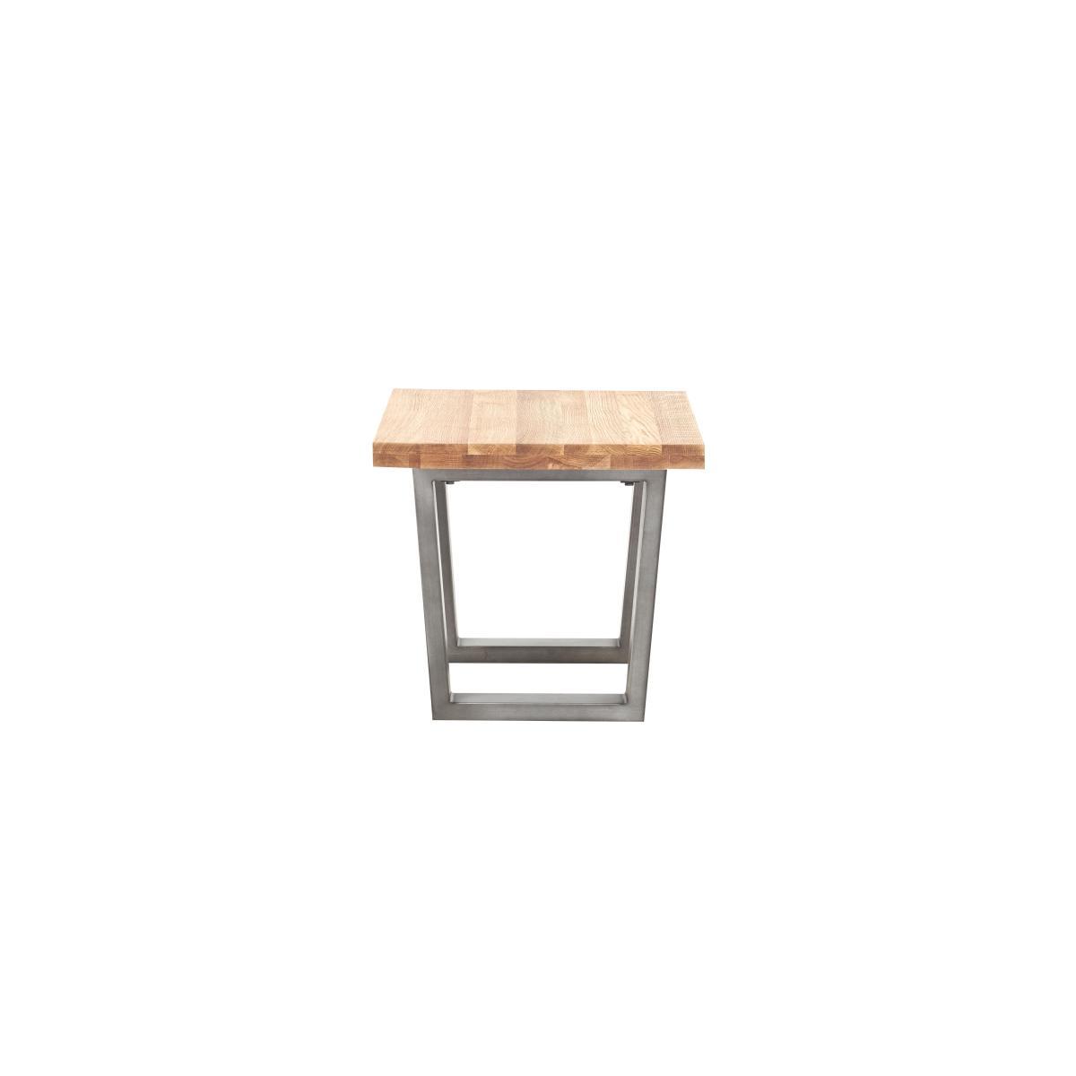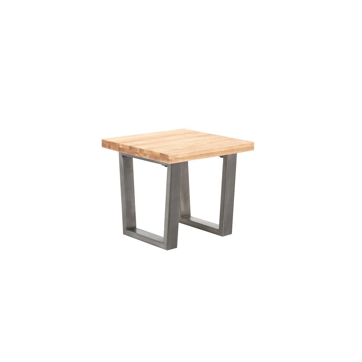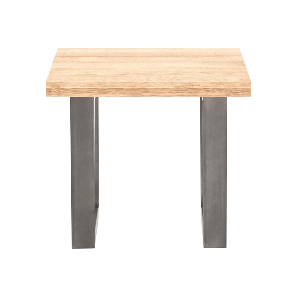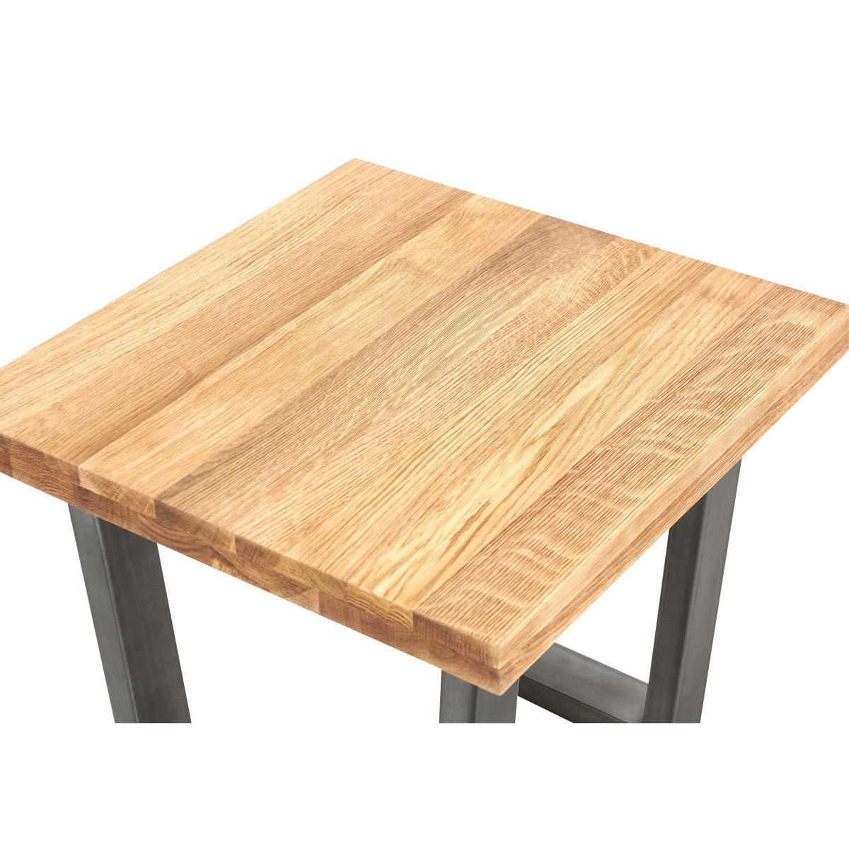 Modern, versatile and excellent value, Earth combines solid oak and oak veneer surfaces with powder-coated steel legs in a collection of beautifully-crafted industrial-style furniture. Dining tables are available in two sizes and optional extension leaves create a huge range of size possibilities. Choose either an upholstered retro-style dining chair or practical bench seating – or mix and match the two for a comfortable and contemporary look. Complete your dining room with a choice of sideboards and continue this on trend theme in the living room with useful shelving and stylish occasional pieces. Small but perfectly formed, the square Earth lamp table perfectly sums up the industrial style aesthetic with its simple, structured line and wonderful combination of natural materials and colours. This versatile and practical lamp table – which works equally well as an end table or even bedside table – has a solid oak top, beautifully finished, and a U-shaped base made of grey powder-coated steel. It’s the perfect place for a fashionable retro desk lamp. The incredibly well-priced Earth lamp table is part of the extensive Earth dining room and living room furniture collection. Offering a wide choice of furniture for both larger and more compact spaces, this range makes it easy to introduce the industrial trend to your home. The Earth small dining table and the Earth large sideboard offer a similar authentic industrial style. Did you know?. Because oak is natural with characterful knots and markings, every Earth lamp tableis unique.