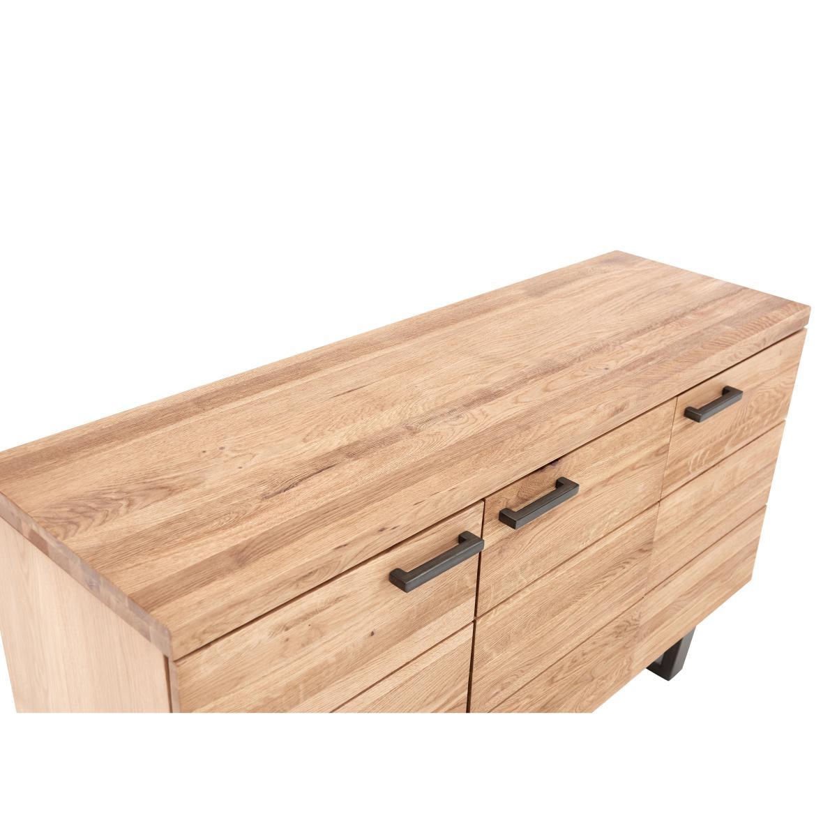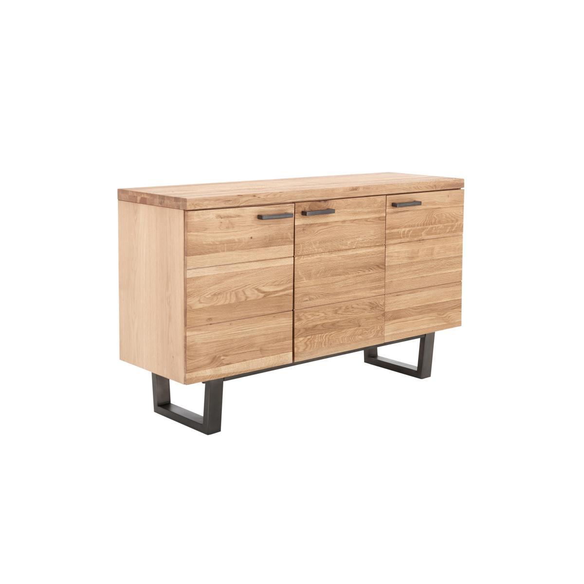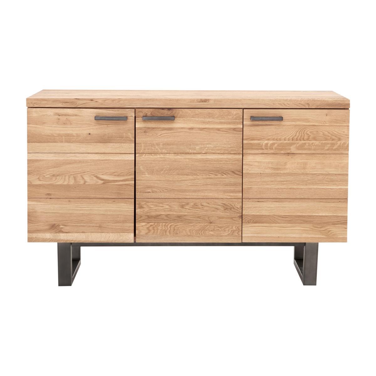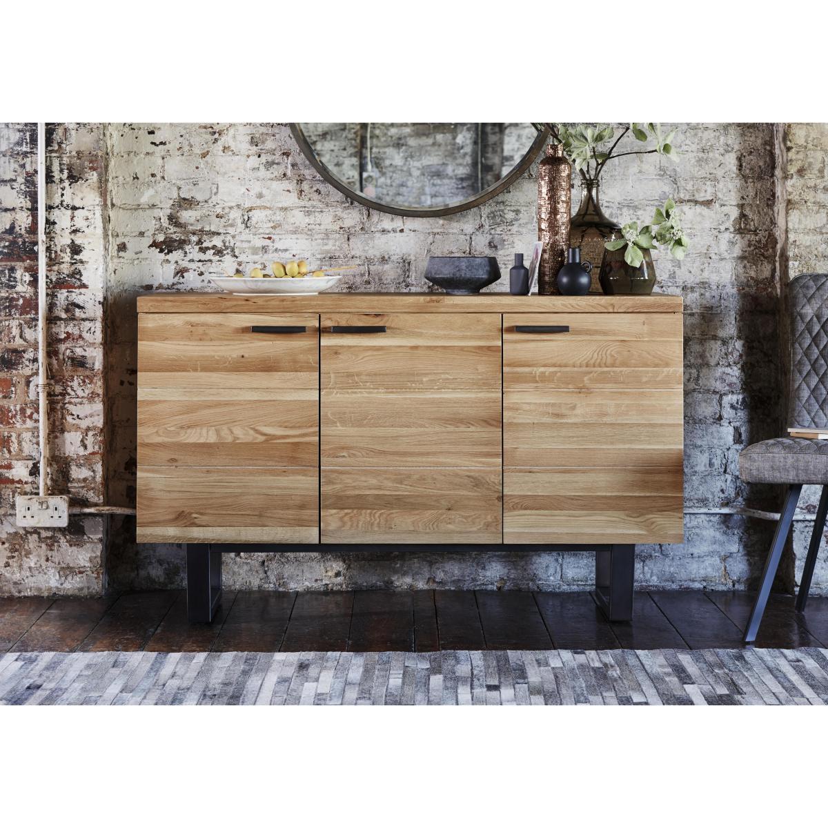 Modern, versatile and excellent value, Earth combines solid oak and oak veneer surfaces with powder-coated steel legs in a collection of beautifully-crafted industrial-style furniture. Dining tables are available in two sizes and optional extension leaves create a huge range of size possibilities. Choose either an upholstered retro-style dining chair or practical bench seating – or mix and match the two for a comfortable and contemporary look. Complete your dining room with a choice of sideboards and continue this on trend theme in the living room with useful shelving and stylish occasional pieces. The Earth large sideboard combines modern industrial style with exceptional craftsmanship – at an amazing value price. Crafted from solid oak and oak veneer, this sideboard features one double door cupboard and one single door cupboard. Each cupboard has a single shelf. Doors have a striking planked appearance and are finished with liner metal handles. Set on bold U-shaped powder-coated grey steel legs, this piece offers roomy dining room storage that’s so stylish. The Earth large sideboard is part of the Earth collection of living and dining room furniture. Choose from two sizes of dining table – both can be extended at either end by the addition of the optional Earth dining table extension leaf. Coordinating living room pieces include spacious and practical shelving units and a selection of occasional tables. The Earth lamp table shares the same bold and stylish aesthetic. Did you know?. Because oak is natural with characterful knots and markings, every Earth sideboardis unique.
